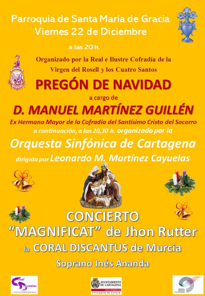 El anterior hermano mayor de la Cofradía del Cristo de Socorro (en el centro de la foto adjunta) es el encargado de anunciar la llegada del Adviento este próximo viernes, a partir de las 20 horas, en la iglesia de la calle del Aire de Cartagena, en un acto organizado por la hermandad de la Virgen del Rosell y de los Cuatro Santos. A su conclusión comenzará un concierto del 'Magnificat', de Jhon Rutter, a cargo de la Orquesta Sinfónica de Cartagena bajo la dirección de Leonado M. Martínez Cayuelas, y de la Coral Discantus con la soprano Inés Ananda.