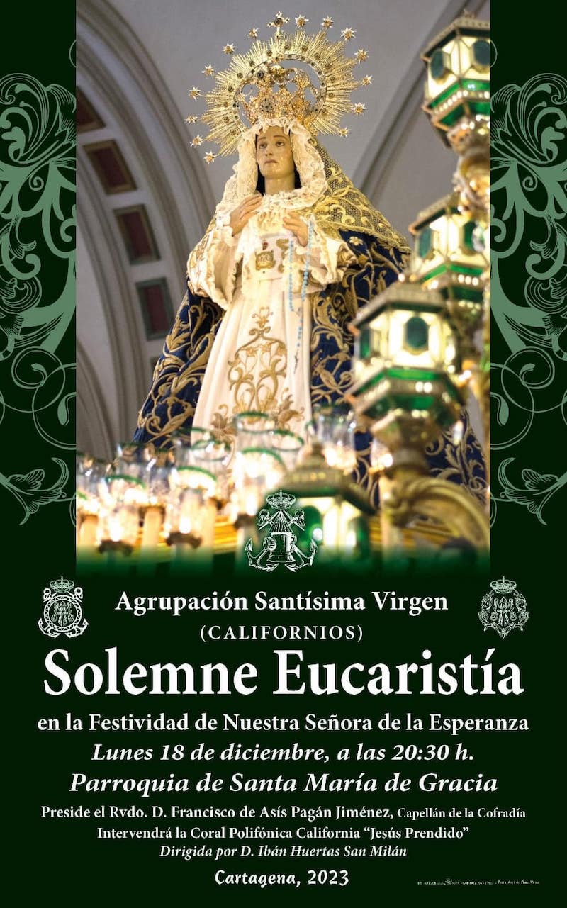 La iglesia de Santa María de Gracia acogerá este próximo 18 de diciembre, a las 20.30 horas, la eucaristía en honor a Nuestra Señora de la Esperanza, imagen california que sale en procesión el Jueves Santo (en la foto adjunta, la recogida). El oficio será presidido por Franicsco de Asís Pagán y contará con la intervención de la coral polifónica 'Jesús Prendido' de la Cofradía de Jesús en el Paso del Prendimiento.