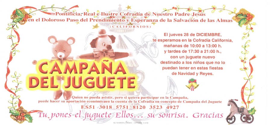 La Cofradía de Cristo del Prendimiento celebra hoy su 'Campaña del juguete' de 10 a 13 y de 17.30 a 21 horas, que tiene como objetivo alegrar las navidades de familias necesitadas. Además, por la tarde, también en la sede de la calle del Aire, harán escalas los Magos de Oriente. Por otro lado, el viernes, a las 19.30 horas, se celebrará el 'Cabildo de la cordialidad'.