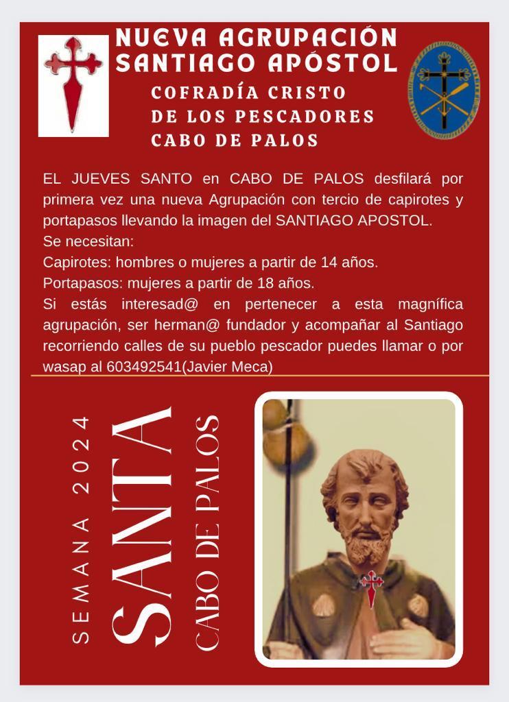 La imagen del santo volverá a salir en procesión el Jueves Santo, pero esta vez, en lugar de hacerlo como tercio de la Cofradía del Cristo de los Pescadores, lo hará con una agrupación que lleva su nombre de reciente constitución, la cual hace un llamamiento para completar los grupos de penitentes y portapasos.