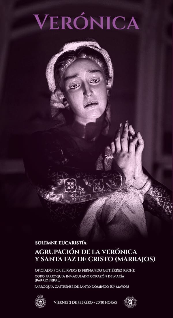 Respecto, a la solemne misa de la Agrupación de la Verónica y Santa Faz de Cristo, que se celebrará este viernes a las 20.30 horas en la parroquia de Santo Domingo, indicare que será oficiada por Fernando Gutiérrez Reche, capellán marrajo y pregonero de la Semana Santa de Cartagena 2024, y que contará con las voces del coro de la parroquia del Inmaculado Corazón de María de Barrio Peral.