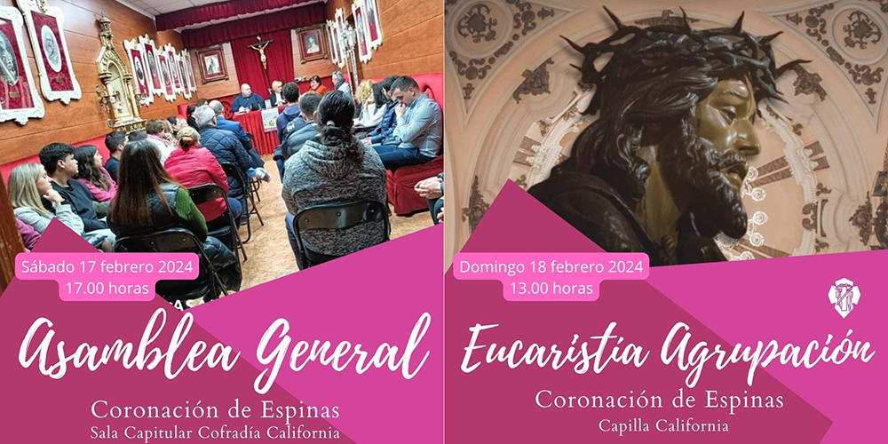 Así la agrupación de La Coronación de Espinas, perteneciente a la Cofradía California, comienza sus actividades cuaresmales con la Asamblea General de hermanos que tendrá lugar el próximo sábado 17 de febrero a las 17:00 horas en la Sala Capitular de la Cofradía California sita en la Calle del Aire 30.