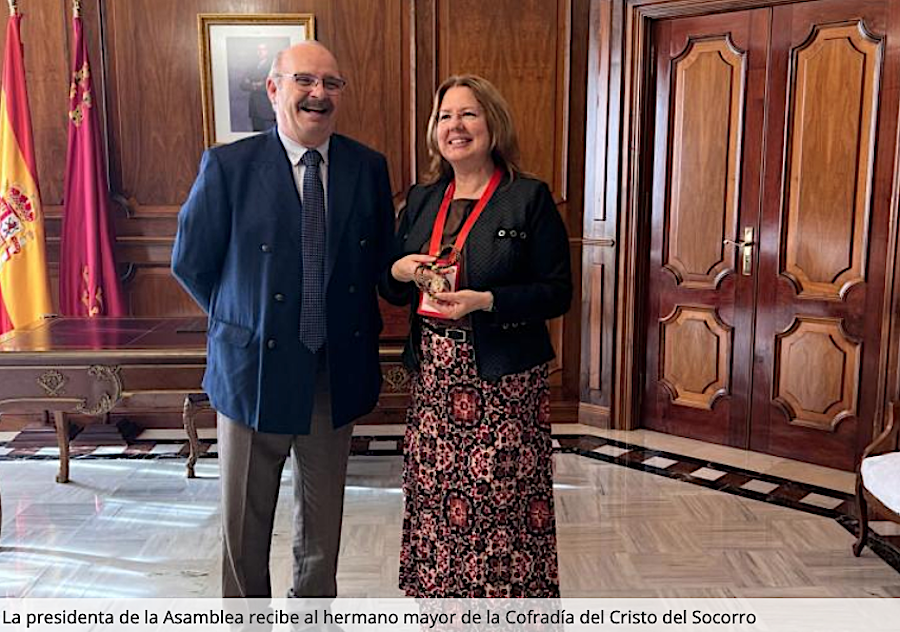 La presidenta de la Asamblea Regional, Visitación Martínez, ha recibido esta mañana al Hermano Mayor del Santísimo y Real Cristo del Socorro de Cartagena, Javier Pavía Galán, quien le ha trasladado las inquietudes de la Cofradía y le ha invitado a los actos que desarrollan a lo largo de la Cuaresma y de la Semana Santa. Acudieron también el Mayordomo Ayudantía Hermano Mayor, D. Fernando Rodríguez Martínez; el Mayordomo de Protocolo, Dña. María José García Roche y el Secretario General, D. José Manuel López Vilar
