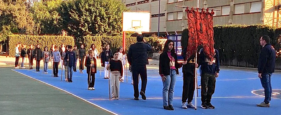 Los ensayos de los tercios para preparar los desfiles pasionarios de la Semana Santa 2024 comenzaron en enero y cada fin de semana se van incorporando nuevos pasos. En la imagen, el tercio infantil californio de Santiago Apóstol en su primera jornada en el patio del colegio Maristas.