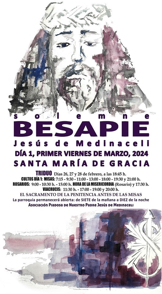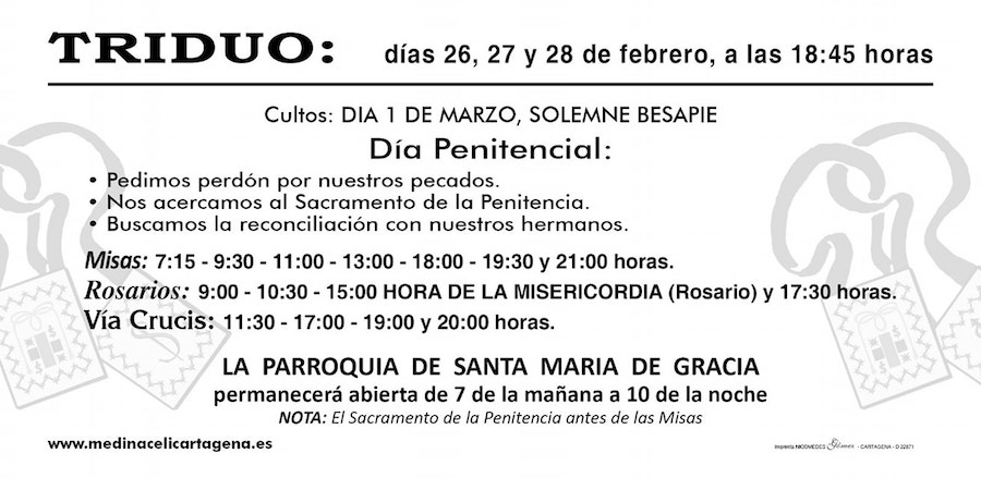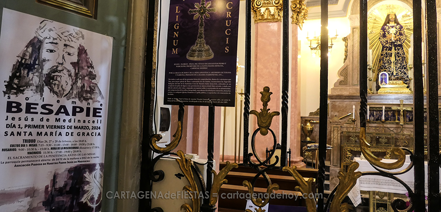 La Asociación Piadosa de Nuestro Padre Jesús de Medinaceli de Cartagena ha fijado para este uno de marzo la tradicional y multitudinaria jornada de veneración a su imagen titular en la capilla que tiene en la iglesia de Santa María de Gracia, que estará abierta desde las siete de la mañana hasta las diez de la noche.