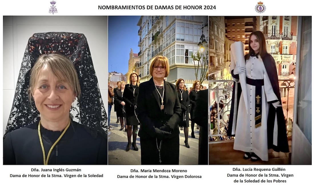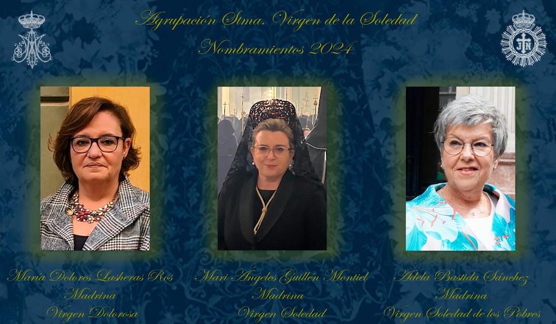La agrupación ha designado a María Dolores Labreras Ros, Mariángeles Guillén Montiel y Adela Bastida Sánchez como madrinas de la Dolorosa, Soledad y Soledad de los Pobres, respectivamente. Por su parte, han sido nombradas 'Damas de honor' María Mendoza Moreno, Juana Inglés Guzmán y Lucía Requena Guillén.