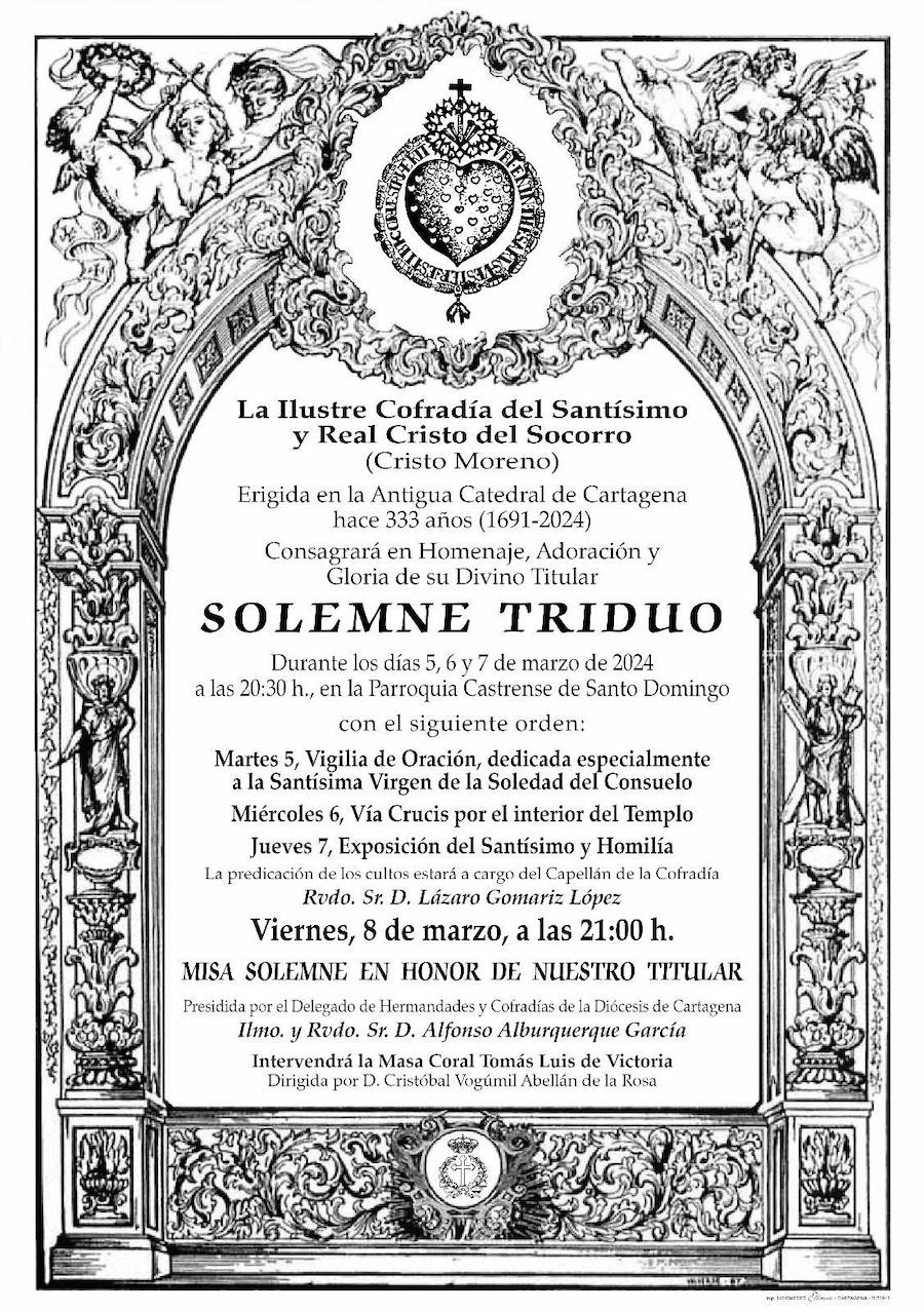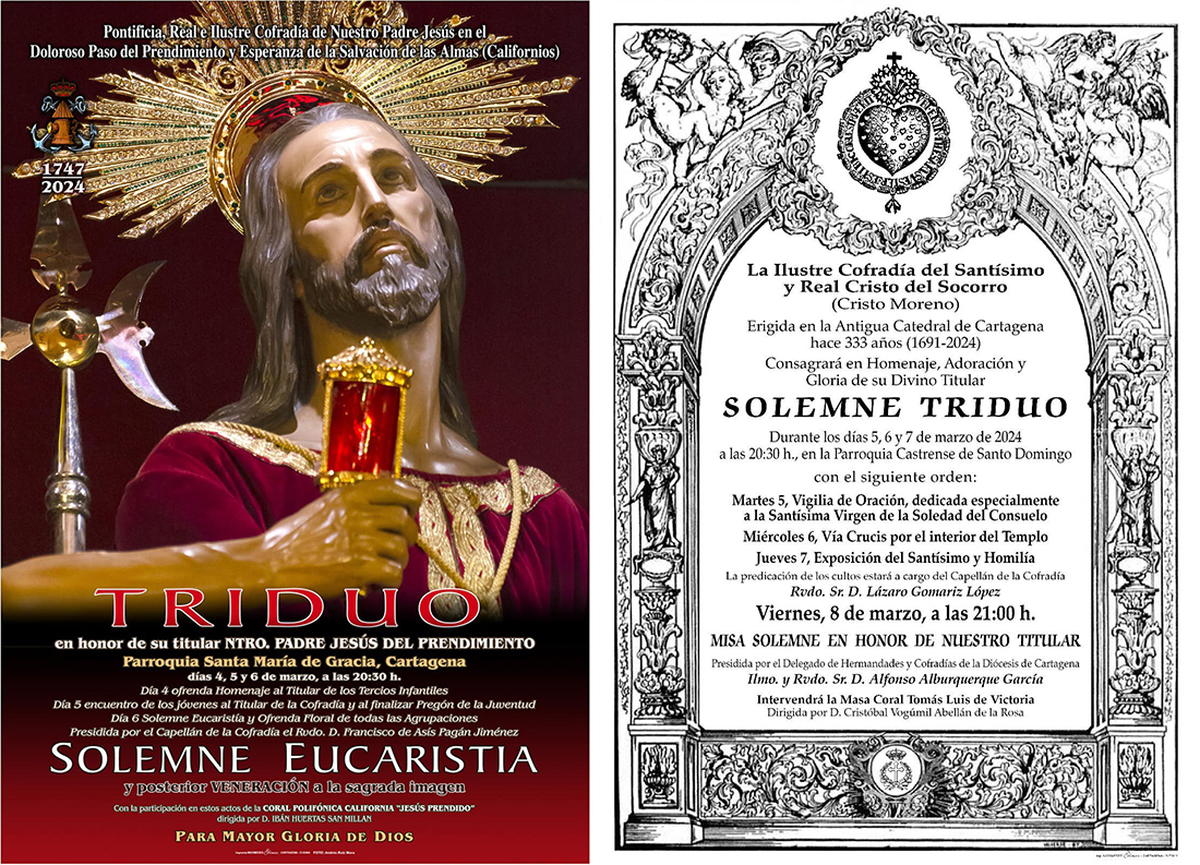 El triduo en honor al Jesús prendido de la Cofradía California comineza hoy en la parroquia de Santa María de Gracia y celebra el miércoles la solemne misa de todas las agrupaciones. El crucificado 'Cristo Moreno', por su parte, inicia el triduo el martes en la iglesia de Santo Domingo y será el viernes cuando lleva a cabo la solemne eucaristía, que será oficiada por el delegado de Hermandades y Cofradías de la diócesis de Cartagena, Alfonso Alburquerque.
