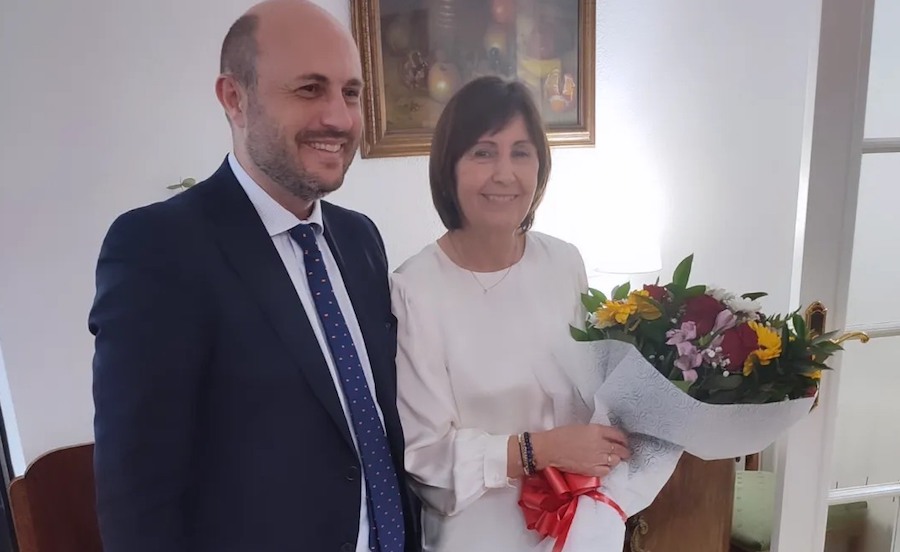 María del Carmen López Fraga es la nueva camarera de la agrupación de Santiago Apóstol, nombramiento oficial que le comunicó en su domicilio el presidente del colectivo santiaguista, Manuel Salmerón Fuentes, quien le entregó una placa conmemorativa junto a un ramo de flores.