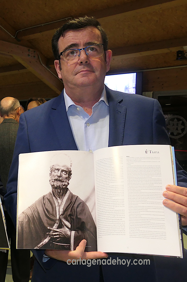 Alfonso Pagán ofrece en la revista 'Tiara' los resultados de una minuciosa investigación que le ha llevado una década y que destierra que el origen de la vinculación fuese del siglo XVIII, situándola en el Martes Santo del año 1879. El culto que sí solicitaron los calafates en en 1763 fue a la Virgen del Primer Dolor, pero no al apóstol. "Nuestra obligación no es saber porqué surge un dato erróneo, sino averiguar la verdad porque la Semana Santa de Cartagena se merece ese rigor", explica el autor, a quien se observa en el centro de la imagen durante la presentación de la publicación sampedrista.