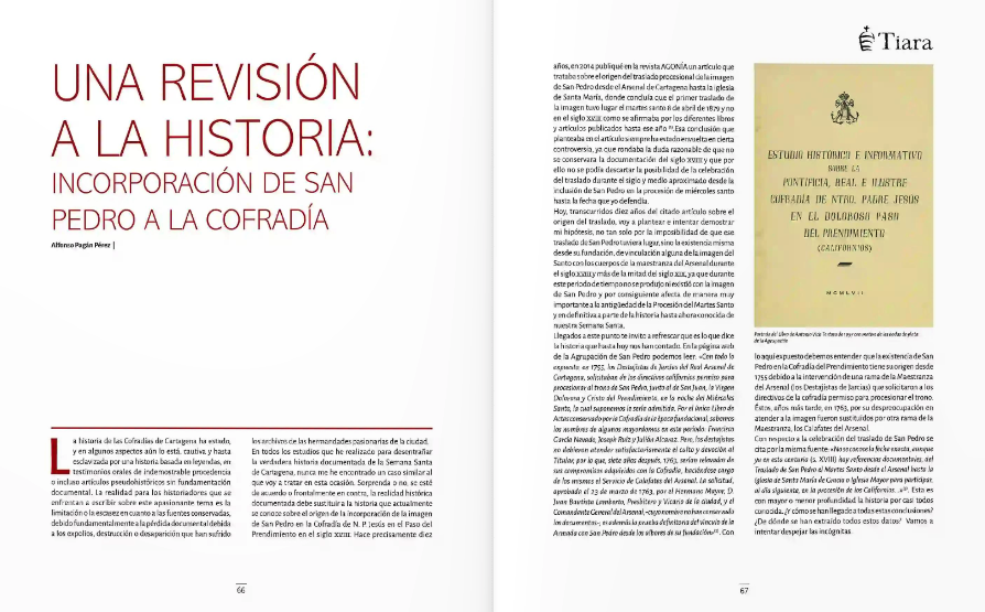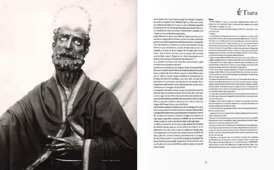 En la Semana Santa de Cartagena hay muchísimas personas involucradas, cada uno con un papel. En este caso se trata de un cofrade al que hace años, en un artículo que le dedicamos, lo denominé como 'el detective del ayer cofrade', pues se dedicaba y dedica a buscar datos que respalden la historia de nuestra Semana Santa, labor bastante complicada si tenemos en cuenta que buena parte de la documentación desapareció por la Guerra Civil y otras causas. Se trata de Alfonso Pagán, quien fue archivero de la Cofradía Marraja y que en la revista 'Tiara' de la agrupación california de San Pedro Apóstol firma un artículo que nos ha llamado mucho la atención, pues, a bote pronto, parece que desaparecen 124 años de la vinculación del santo con la Armada.