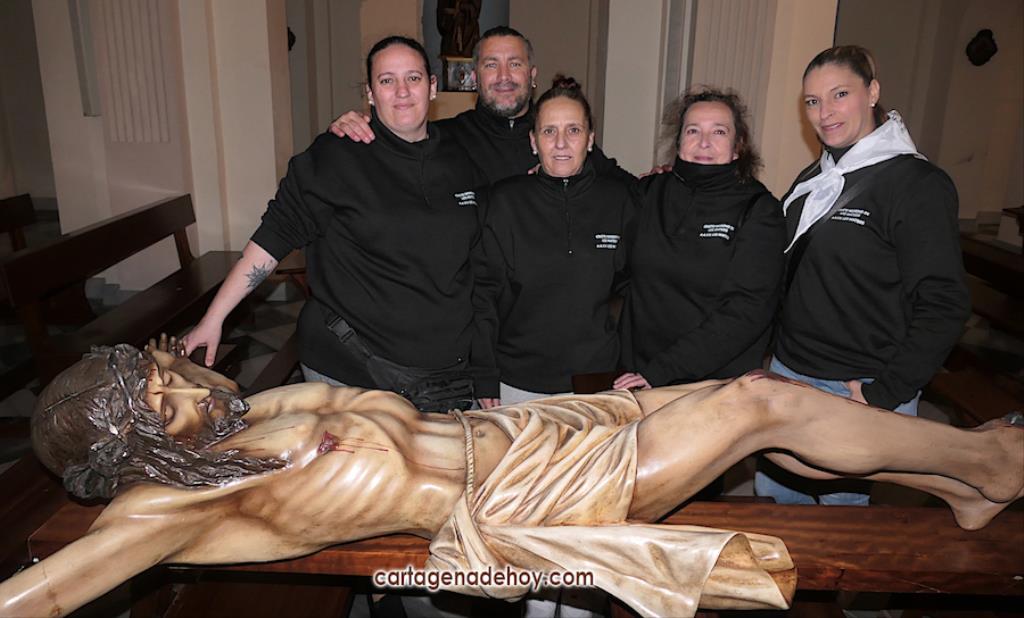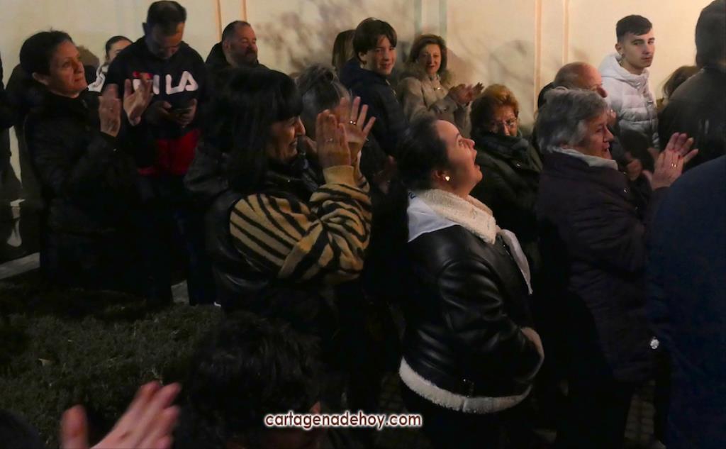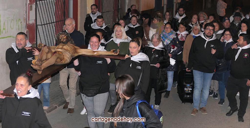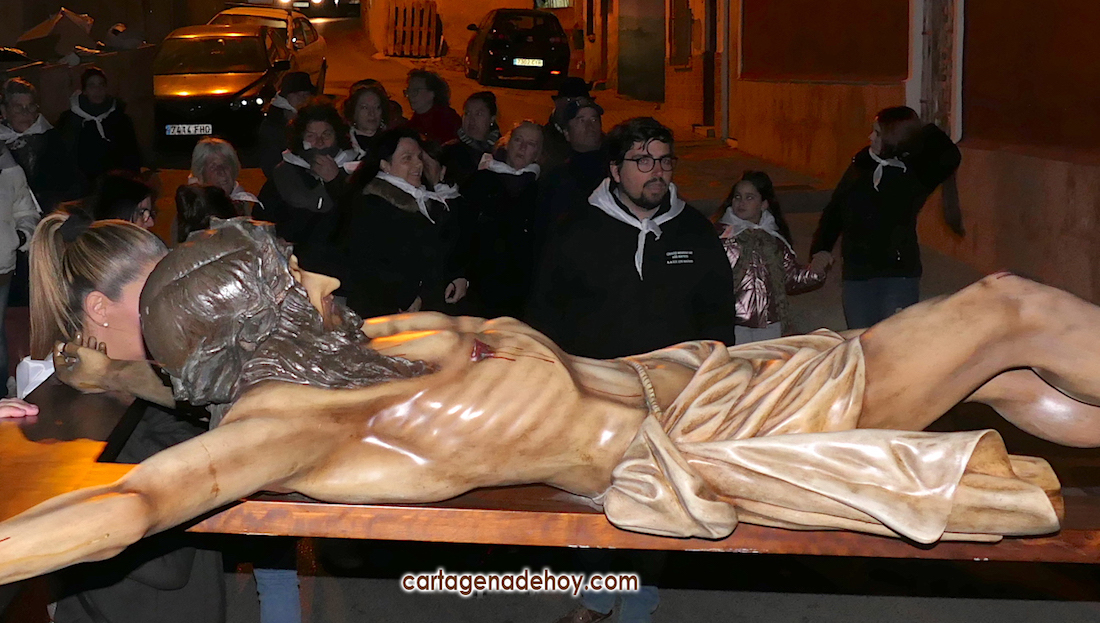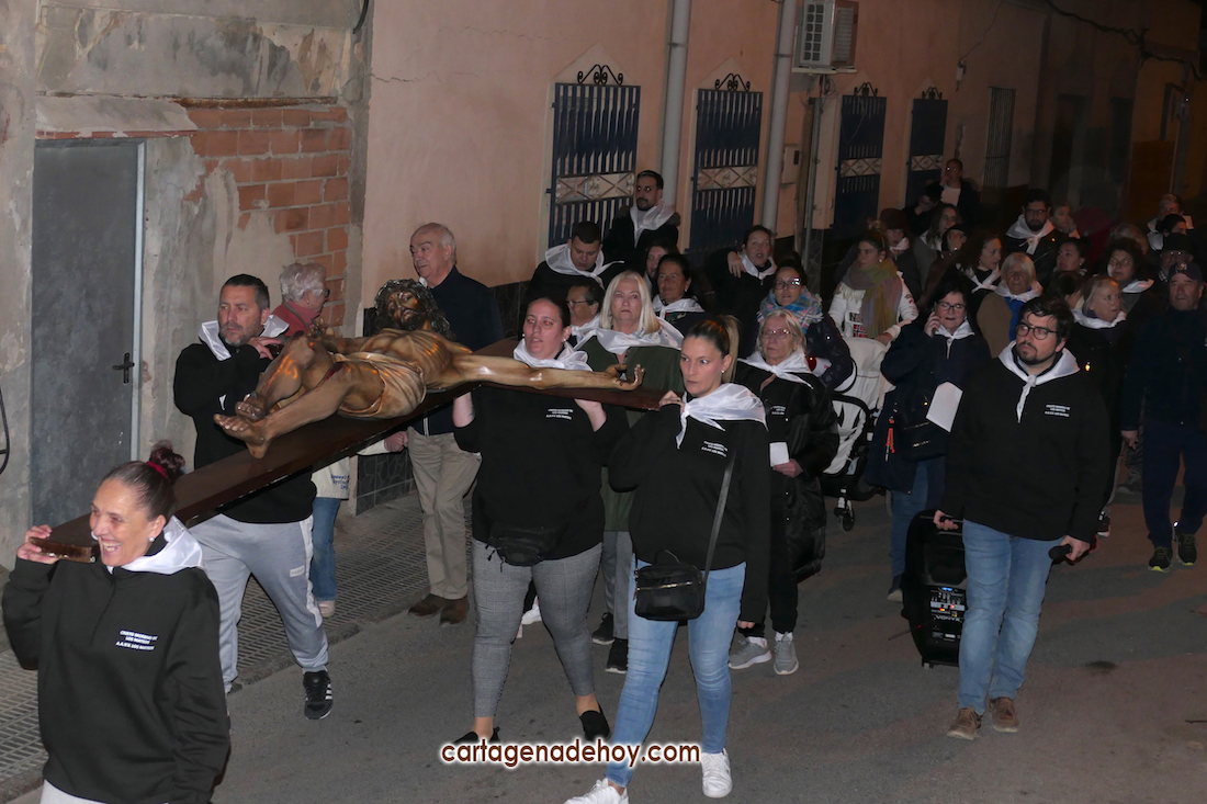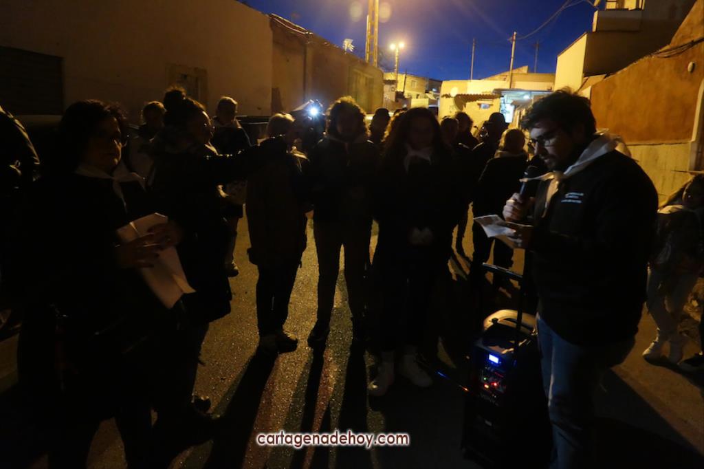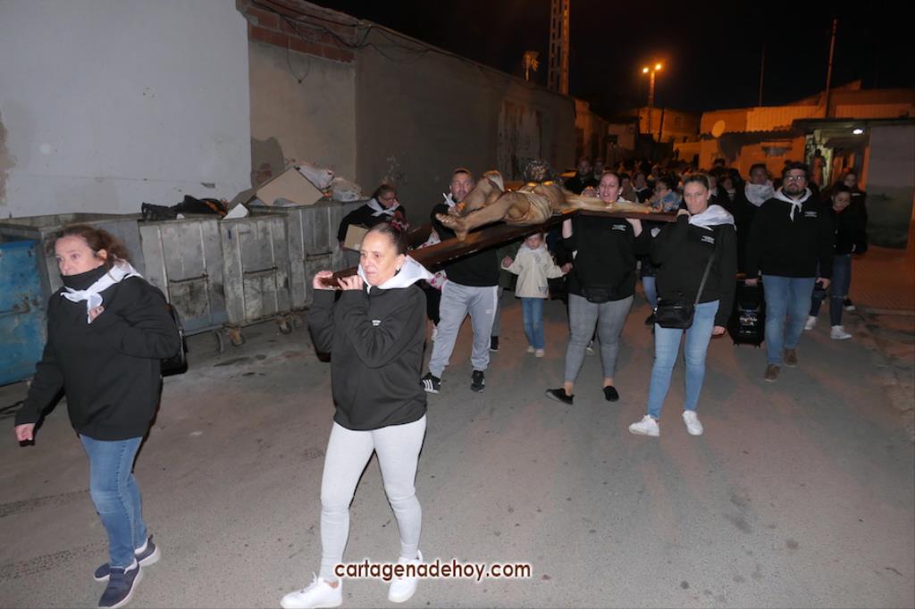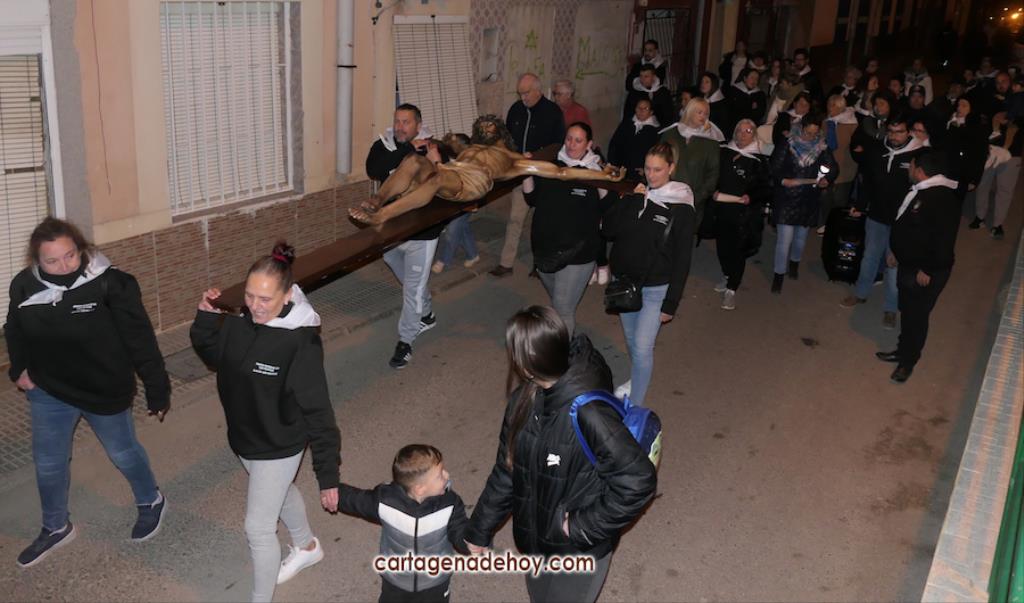 Siete y media de la tarde. Hace mucho frío en lo alto del cerro de los Moros, pero la ilusión lo supera. Ahí está el Cristo Moreno de Los Mateos con sus fieles, bastantes de los cuales lucen pañuelas y polos para la ocasión con leyenda alusiva a su fidelidad al crucificado. Comienza el descenso por las calles de Santa Lucía a golpe de tambor por las oscuras vías por su escasa iluminación, lo que potencia el recogimiento.
