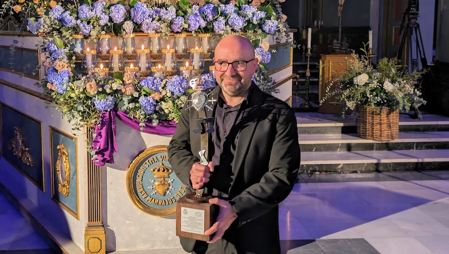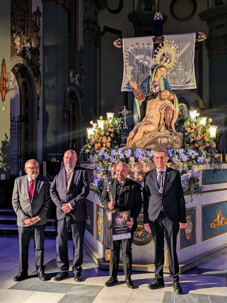 El concejal del Área de patrimonio y Vivienda del Ayuntamiento de Cartagena, Pablo Braquehais; el Hermano Mayor marrajo, Francisco Pagán y el presidente de la Agrupación de Portapasos Promesas de la Stma. Virgen de La Piedad, José Jesús Guillén, han entregado al lucentino este primer premio dotado con 3.000 euros, con un trofeo-escultura realizado por el escultor Fernando Saénz de Elorrieta y diploma.