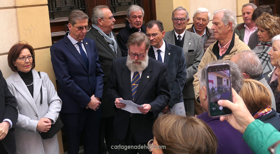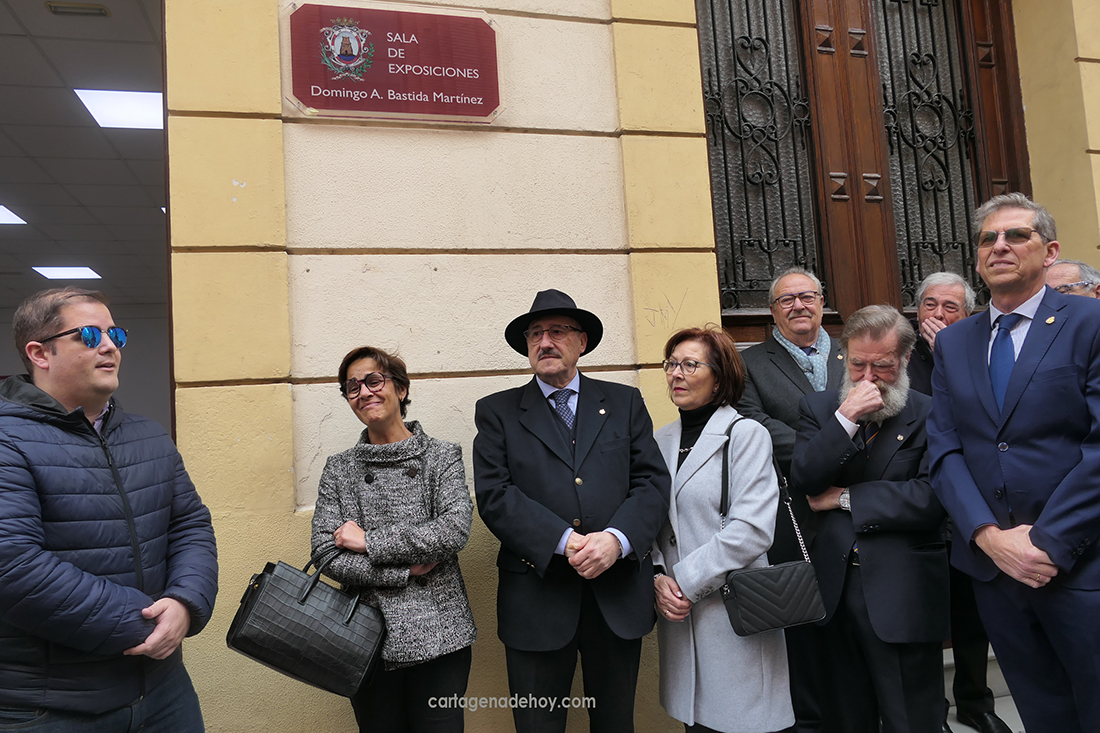 'Sala de exposiciones Domingo A. Bastida Martínez'. Desde este pasado fin de semana, el cartagenero que falleció en mayo de 2023 dejando una profunda huella estará presente de forma permanente frente a la iglesia de Santa María, por donde salen y se recogen las procesiones, merced a la iniciativa de la Real Sociedad Económica de Amigos del País, entidad en la que el homenajeado ocupó los cargos de consejero, secretario y adjunto a la presidencia, labor en la que destacó al igual que como procesionista de la Cofradía de Jesús Nazareno, donde llegó a ser hermano mayor y hermano mayor honorario: pinchar aquí