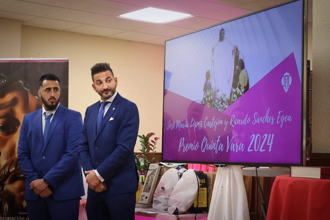 De este modo, recibieron el premio 'Quinta Vara' los portapasos José María López Castejón y Ricardo Sánchez Egea por su compromiso continuado con el grupo juvenil de portapasos.
