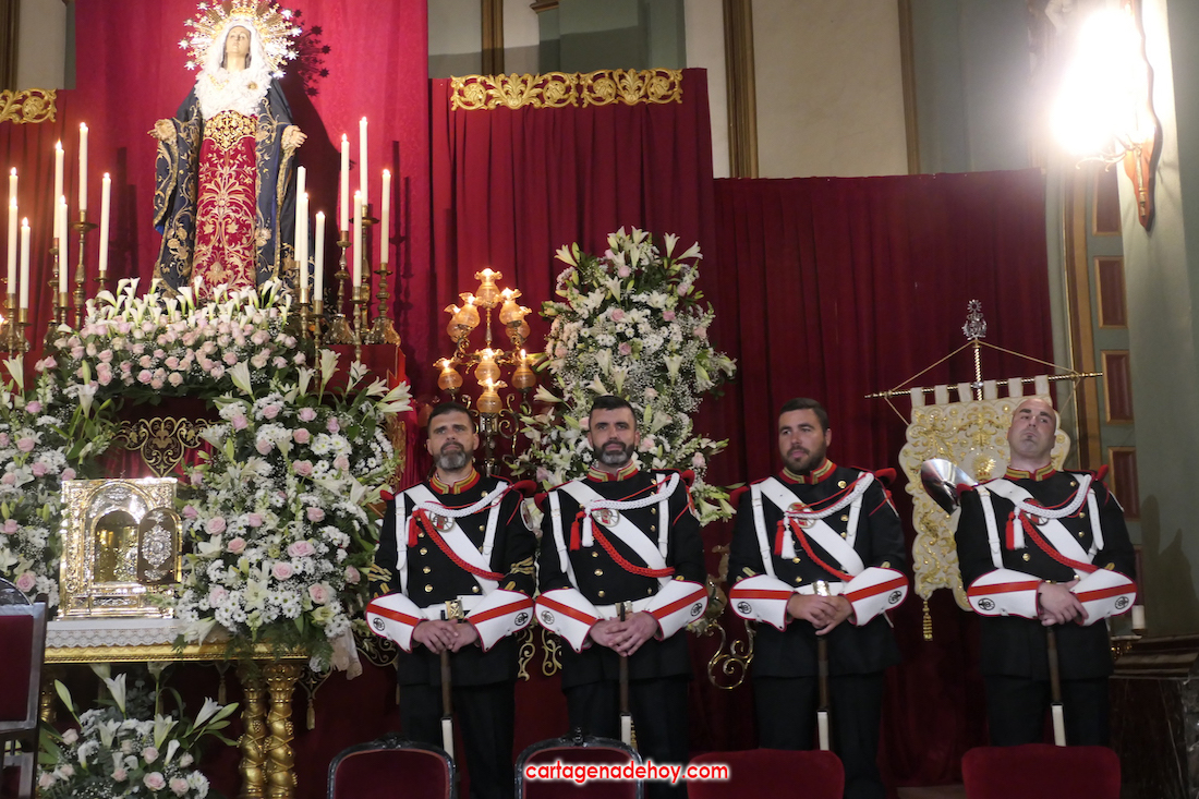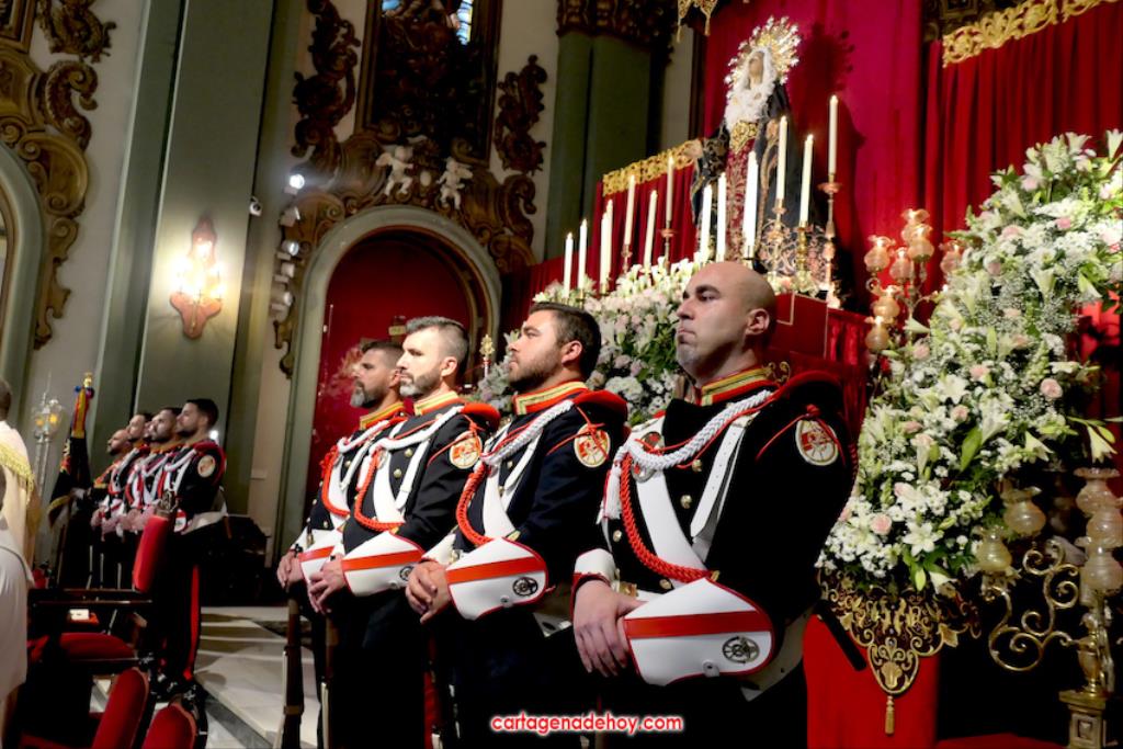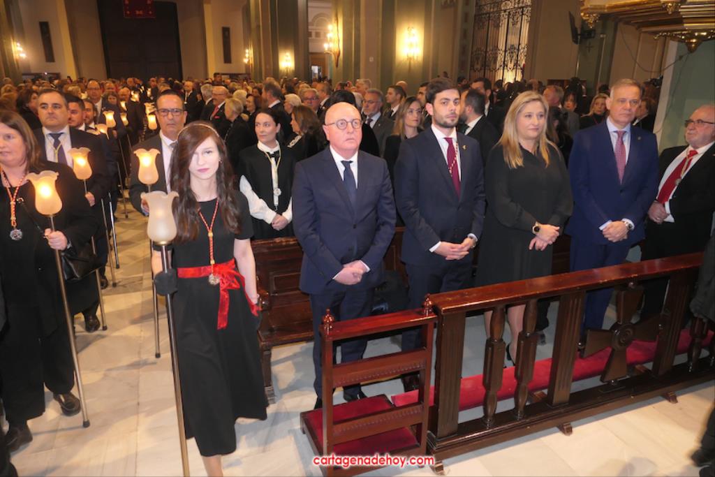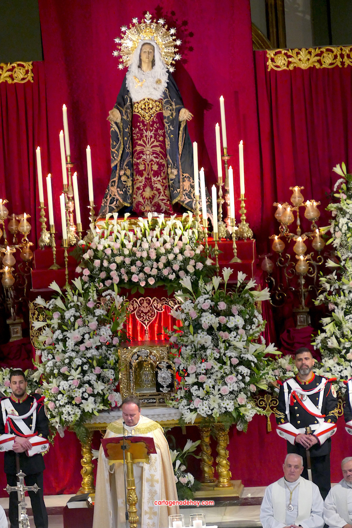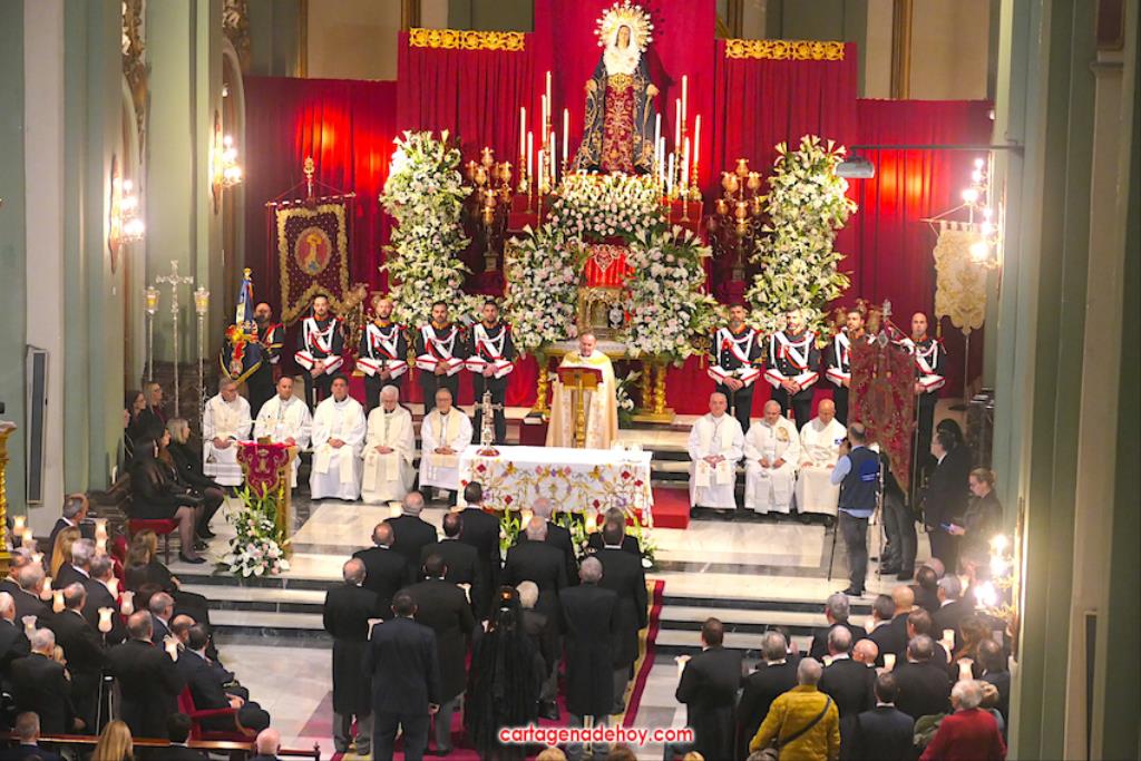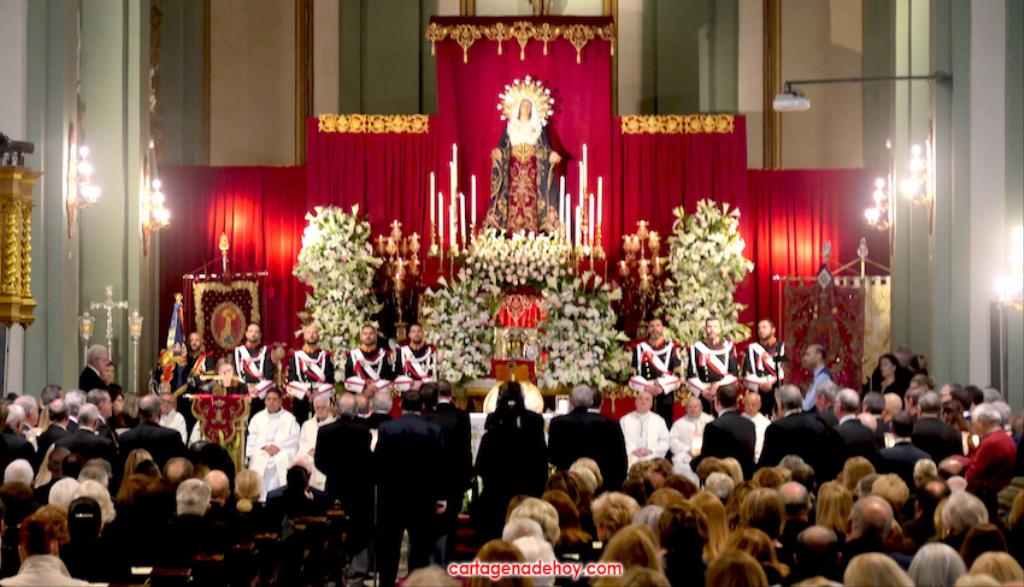 El previo fue la llegada de los granaderos encarnados en formación hasta el pórtico de la iglesia, distribuyéndose después ocho en el altar y el resto en un lateral del templo. A las ocho y media de la noche, comenzó una procesión claustral desde la capilla del Cristo del Prendimiento hacia el altar, lugar donde se llevó a cabo un acto litúrgico concelebrado por varios sacerdotes, entre los que figuraban los capellanes de las cuatro cofradías principales pasionarias, siendo presidida por Alfonso Alburquerque García.El delegado episcopal de Hermandades y Cofradías de la diócesis de Cartagena, en su homilia, y tras recordar que Santiago comenzó por este lugar la evangelización de Hispania, se refirió a o que profetizó Simeón para a continuación centrarse en el sufrimiento de una madre, lo que supuso "la daga que traspasó de dolor su corazón". Se dirigió a los californios, cofrades, cristianos y cartageneros dicendo: "Sois hijos de la Virgen del primer dolor, seáis cofrades o no. Amigos, cartageneros, mirad a la Virgen clavad en ella vuestros ojos (...) y decirle: Te promero y juro que por esa daga yo también me dejaré traspasar". Culminó anunciando el canto de la Salve creada por José Sánchez Medina, además de proclamar: "Viva nuestra madre, viva la madre del primer dolor".