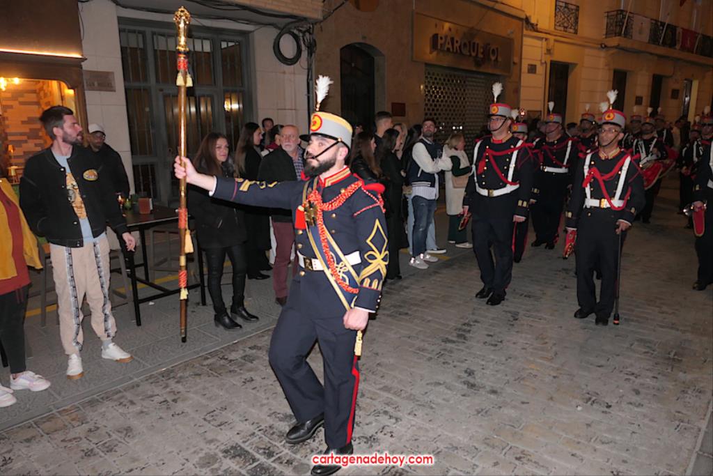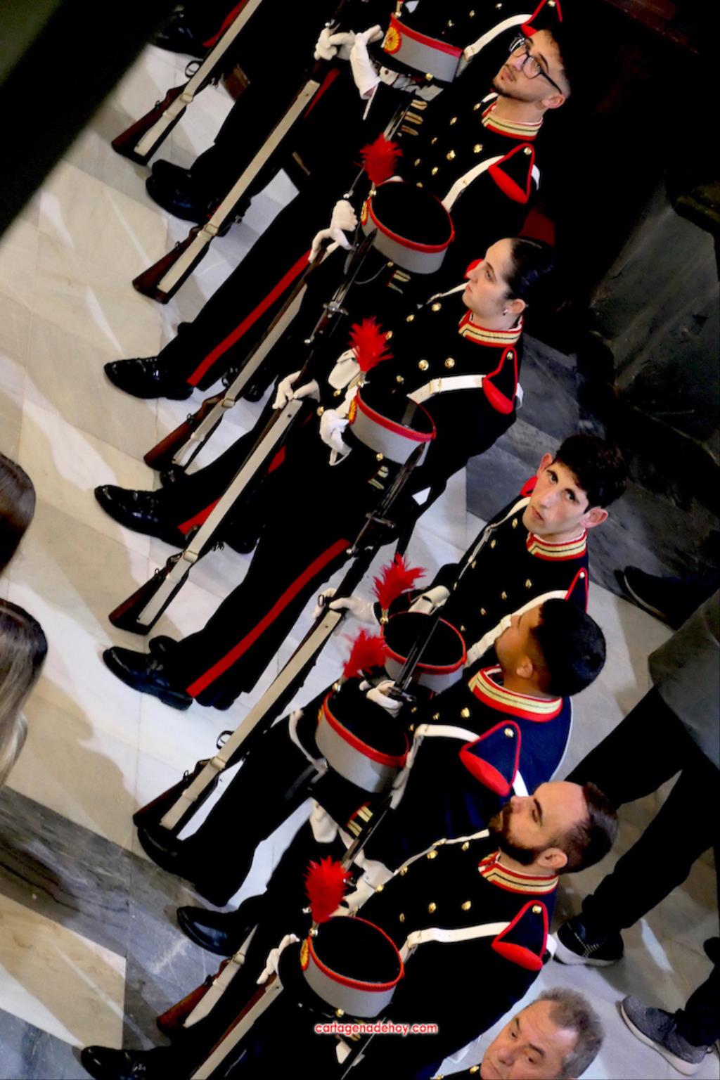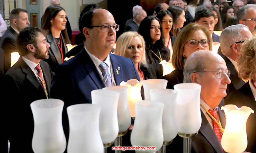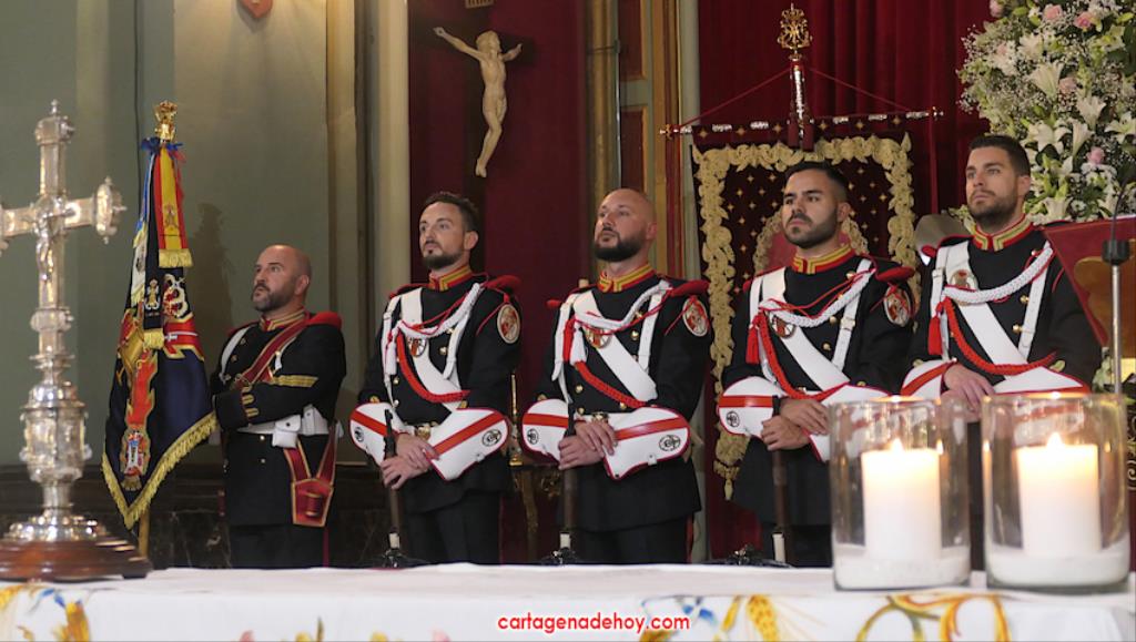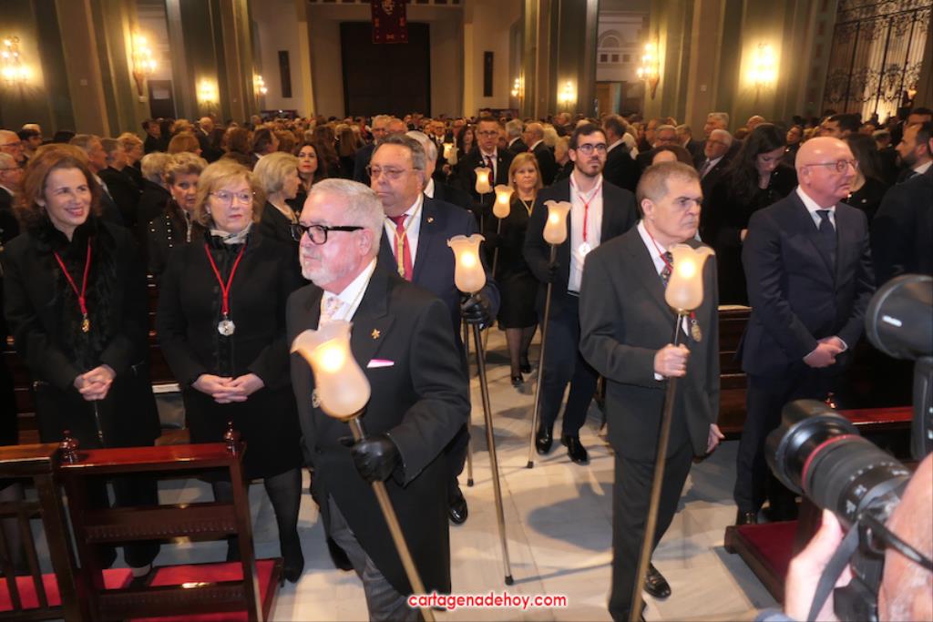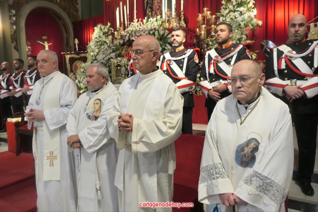 El previo fue la llegada de los granaderos encarnados en formación hasta el pórtico de la iglesia, distribuyéndose después ocho en el altar y el resto en un lateral del templo. A las ocho y media de la noche, comenzó una procesión claustral desde la capilla del Cristo del Prendimiento hacia el altar, lugar donde se llevó a cabo un acto litúrgico concelebrado por varios sacerdotes, entre los que figuraban los capellanes de las cuatro cofradías principales pasionarias, siendo presidida por Alfonso Alburquerque García.El delegado episcopal de Hermandades y Cofradías de la diócesis de Cartagena, en su homilia, y tras recordar que Santiago comenzó por este lugar la evangelización de Hispania, se refirió a o que profetizó Simeón para a continuación centrarse en el sufrimiento de una madre, lo que supuso "la daga que traspasó de dolor su corazón". Se dirigió a los californios, cofrades, cristianos y cartageneros dicendo: "Sois hijos de la Virgen del primer dolor, seáis cofrades o no. Amigos, cartageneros, mirad a la Virgen clavad en ella vuestros ojos (...) y decirle: Te promero y juro que por esa daga yo también me dejaré traspasar". Culminó anunciando el canto de la Salve creada por José Sánchez Medina, además de proclamar: "Viva nuestra madre, viva la madre del primer dolor".