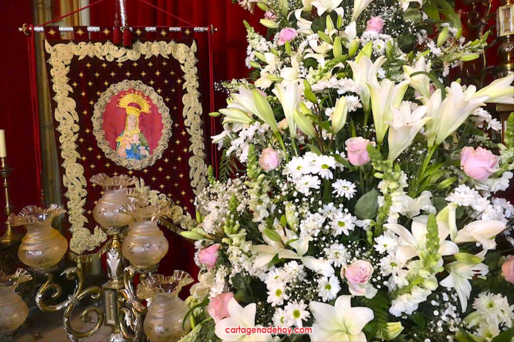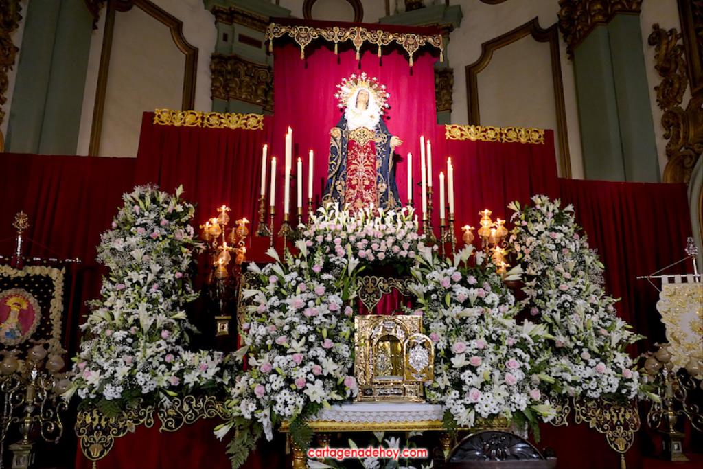 El último gran acto litúrgico de las cofradías en cuaresma previo a la Semana Santa tuvo lugar anoche en una abarrotada iglesia de Santa María, siendo esta vez la 'madre california' la protagonista, estando la talla elevada tras el altar sobre una florida base formada por rosas, margaritas, paniculata, boca de dragón (antirrhinum oboe), lirio y flor de lis.