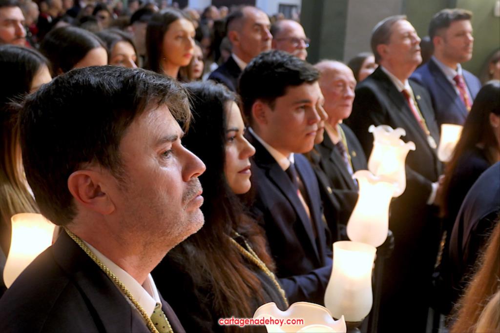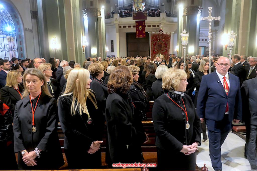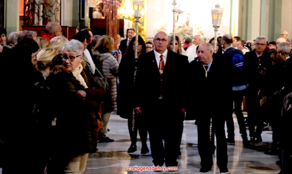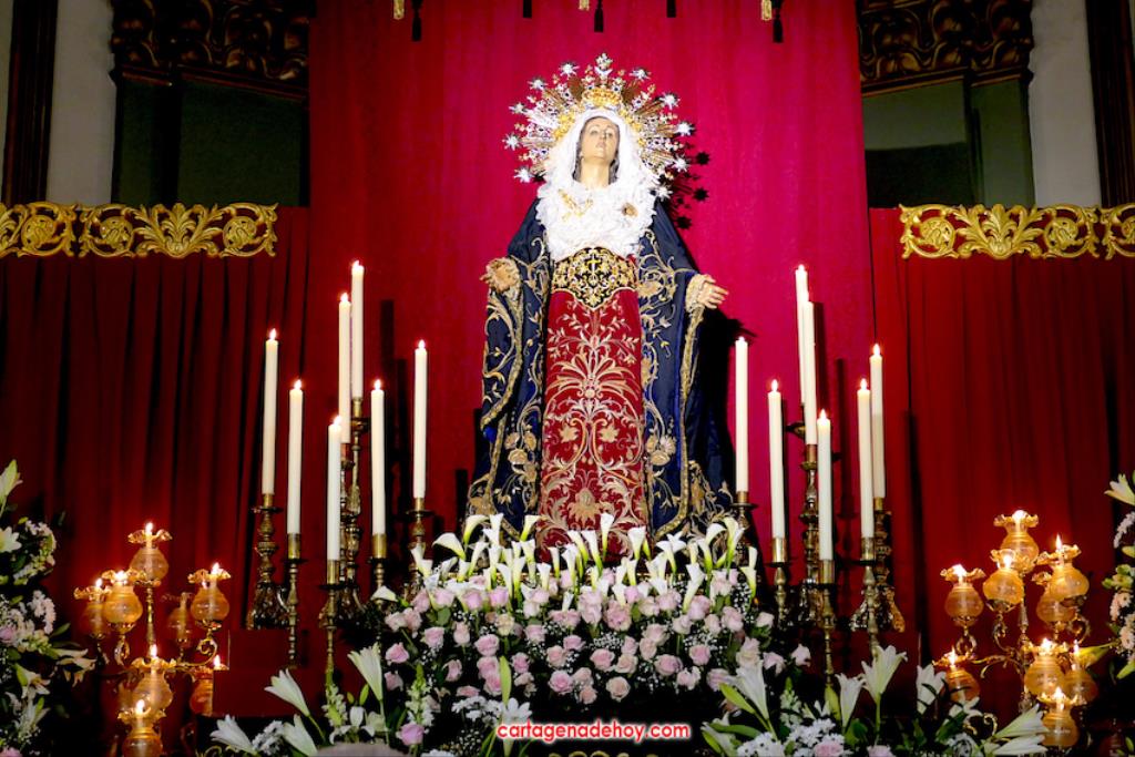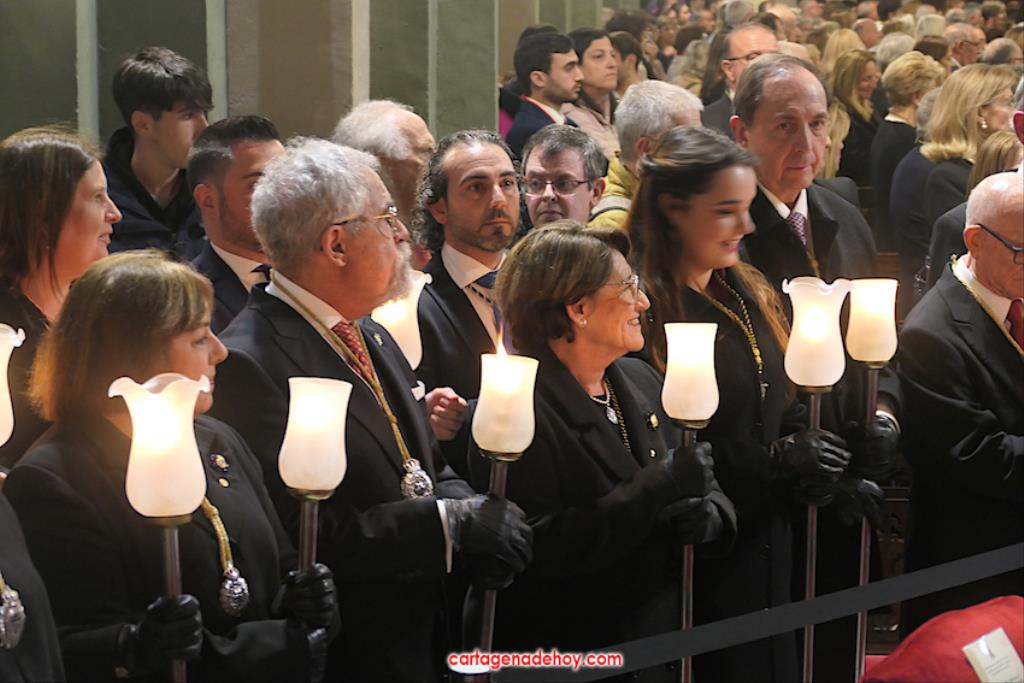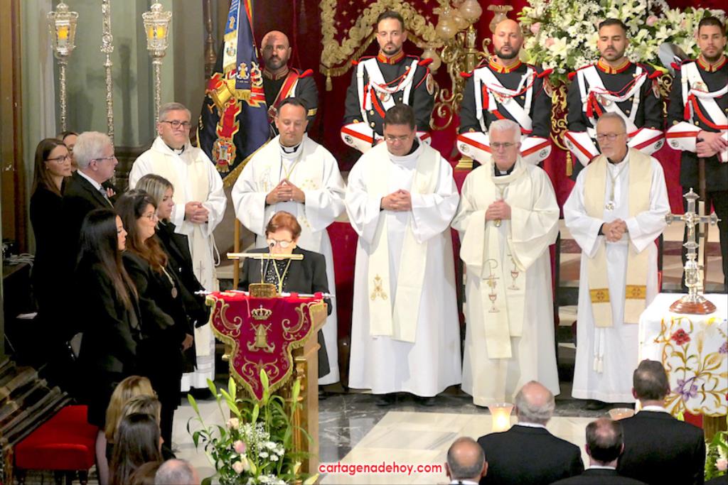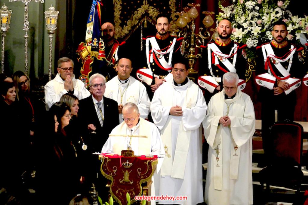 "Por María, escúchanos Señor". Fue la frase que acompañó a las peticiones formuladas a continuación desde el altar, siendo dirigidas las súplicas a la Iglesia para que acoja y celebre el evangelio de la vida, por el Papa Francisco, por el obispo Lorca Planes, por los que sufren, no tienen hogar, por los inmigrantes y refugiados, por los abandonados, por los humillados, por los que no tienen trabajo, por los que no tienen trabajo, por los que tienen problemas económicos o de tipo sentimental (rupturas, tensiones, tristezas o desengaños), por el don de la lluvia ante la sequía y por los fallecidos, por los que no tienen a nadie que se acuerde de ellos. La relación tenía dos súplicas más. Una para todos los hermanos de las cofradías pasionarias de Cartagena, "para que siempre muestren actitudes de humildad y servicio al ejemplo de María y vivan la unidad en comunión con nuestros pastores". La otra fue dirigida a gobernantes, políticos y empresarios "para que trabajen por un mundo más justo y pacífico, uniendo y no separando, donde se respete la dignidad de todos y se busquen soluciones positivas y eficaces".