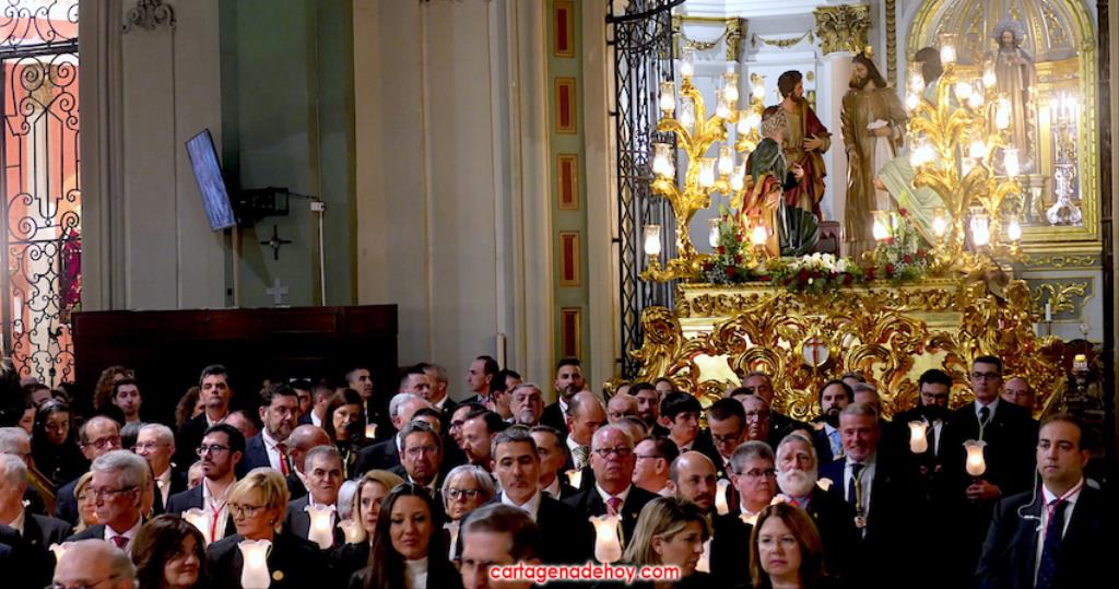 La iglesia de Santa María desbordó su aforo en la Salve Grande california, donde se ensalzó a la Virgen y donde, en las peticiones, se pidió por los pobres, por los que no tienen trabajo, por los que tienen problemas económicos, por la lluvia y, entre otros, por los gobernantes y los procesionistas. En la foto, abajo, los hermanos mayores. Al fondo, el nuevo grupo y trono santiaguista del 'Lavatorio de los pies', que fue bendecido.