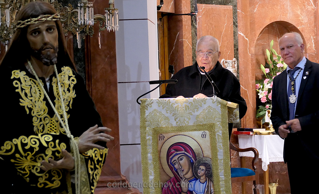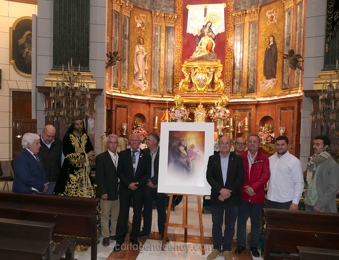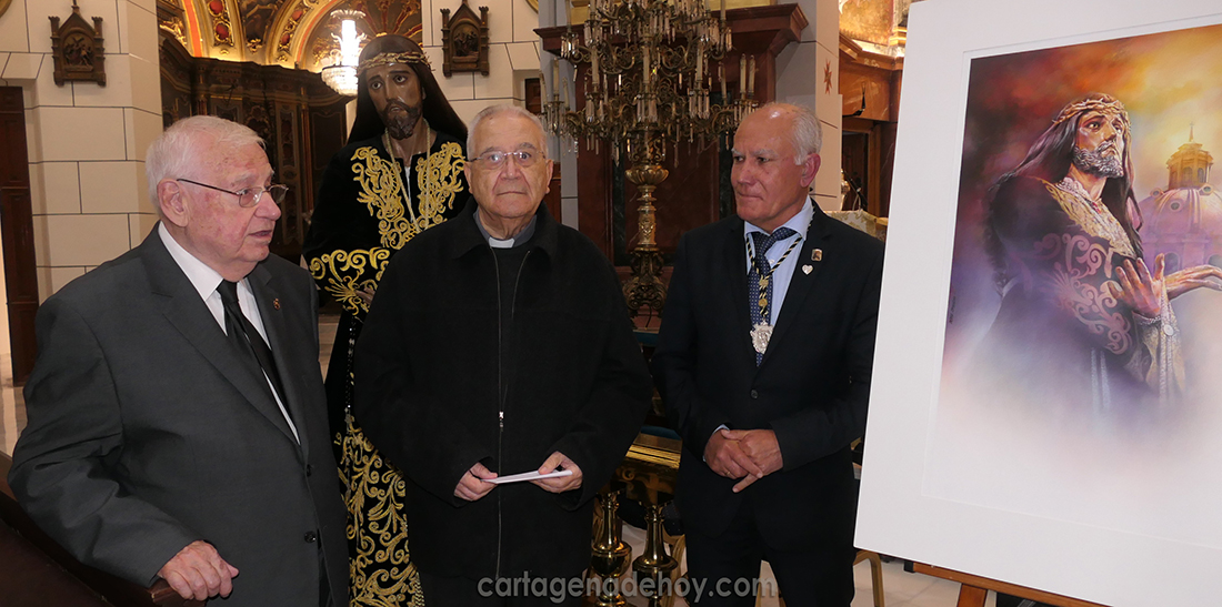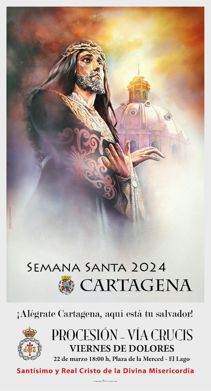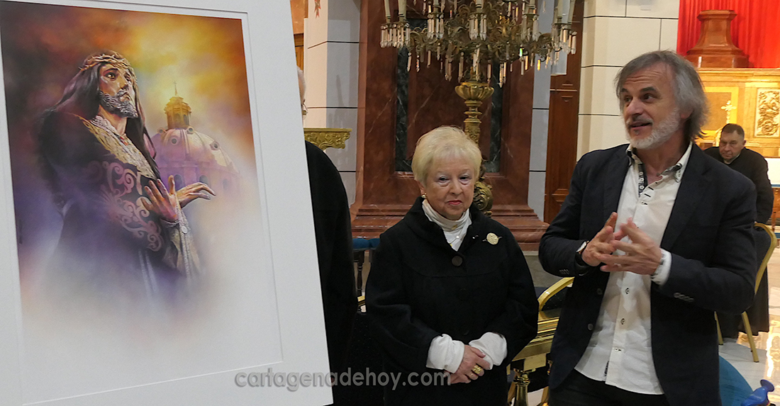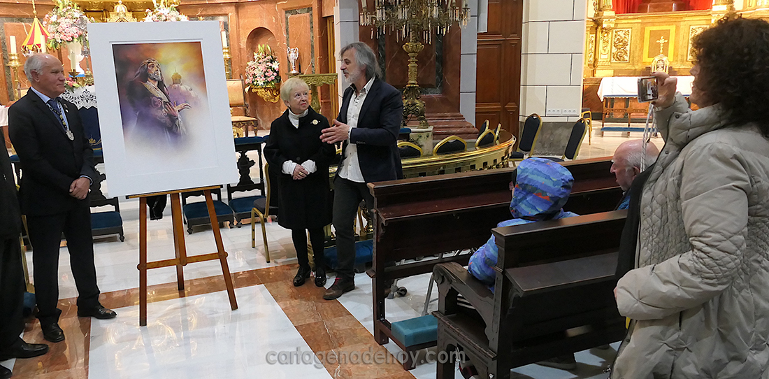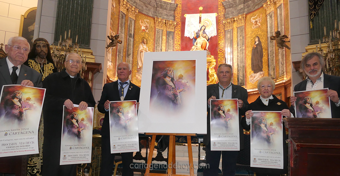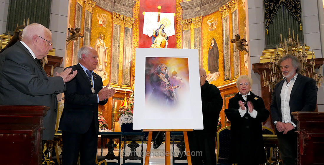 El rector de la Caridad resaltó la mirada de la imagen y expresó que hay que sentir por el Cristo de la Misericordia "un cariño especial", dijo Francisco Montesinos, quien estuvo con José Felipe Rubio, José Vera (Hospital de la Caridad), León García (vicepresidente de la asociación canónica), 'Nazarena mayor de Cartagena 2024' (Maribel Zamora Fuentes) y el autor, quien explicó que ha querido ofrecer "un lenguaje visual basado en dos elementos, el Cristo y la cúpula de la basílica de la Caridad, intentado alejarme de la fotografía a través de la pintura y el grafismo para darle toques fantasiosos y mágicos, situando a la imagen en un mundo pictórico", dijo Pedro Pérez Casanova, que cerró su intervención diciendo: "Ahora, que el Cristo salga y reparta misericordia".