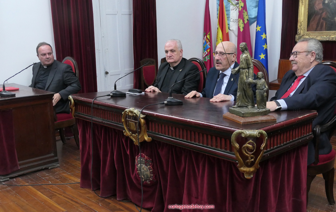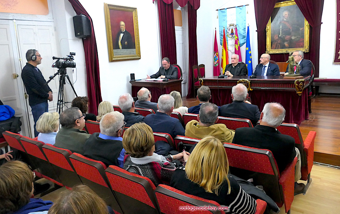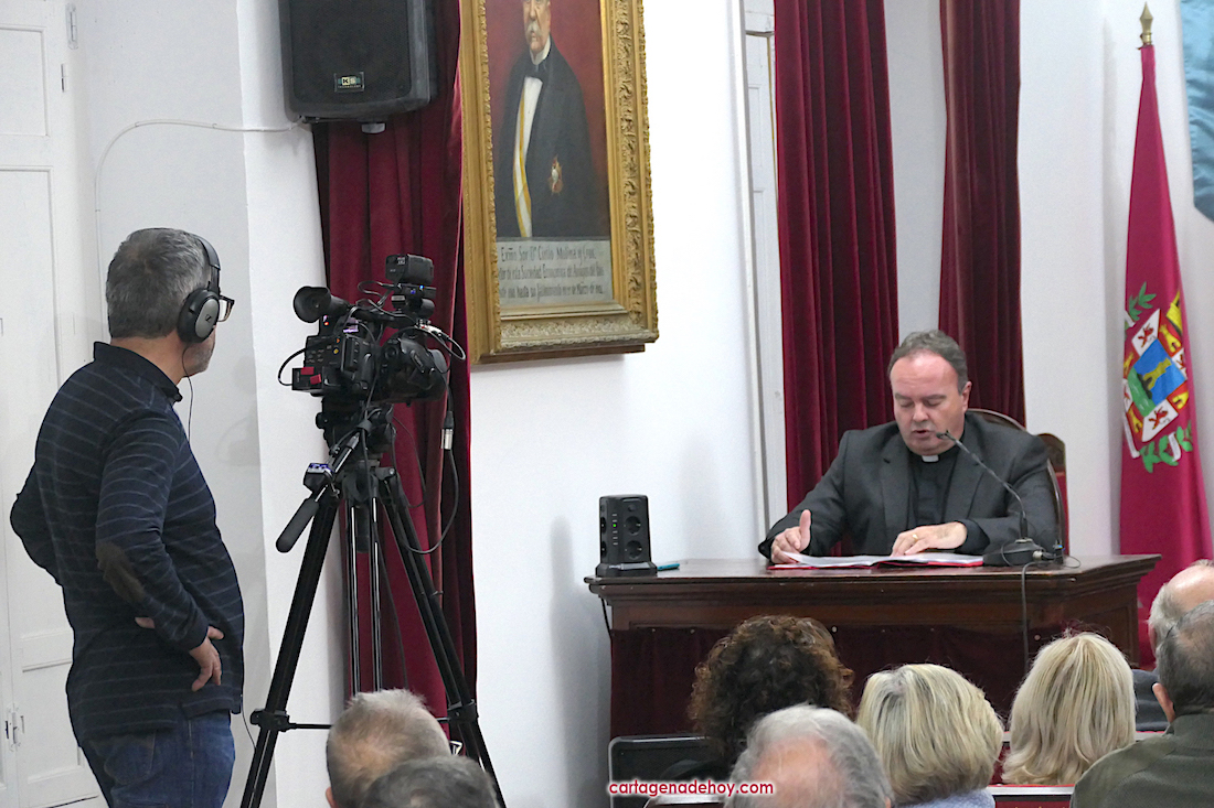 El histórico salón de actos de la Real Sociedad Económica de Amigos del País, dentro del programa de cuaresma de la asociación 'Premio Procesionista del Año de la ciudad de Cartagena', acogió la conferencia ‘La Caridad: devoción, necesidad y fin’, a cargo del delegado de hermandades y cofradías de la diócesis de Cartagena, Alfonso Alburquerque, quien fue presentada por el sacerdote Fernando Gutiérrez Reche, padre de Los Claretianos, capellán marrajo y pregonero de la presente Semana Santa de Cartagena.