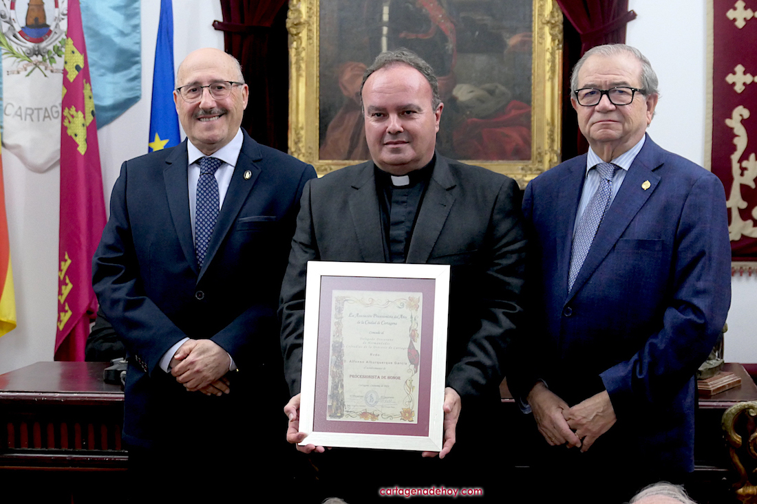 A continuación, Alfonso Alburquerque recibió un detalle de gratitud de la asociación organizadora, que le fue entregado por Manuel Martínez Guillén, quien este año ha sido elegido como 'Procesionista del año de la Semana Santa de Cartagena', y por Pedro Negroles, presidente de la asociación, quien también tuvo palabras abogando porque los avatares del día a día no impidan preparer al cristiano para la razón de ser de la cuaresma y la Semana Santa, agradeciendo al conferenciante la catequesis ofrecida.