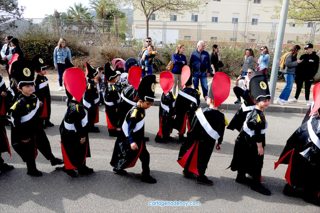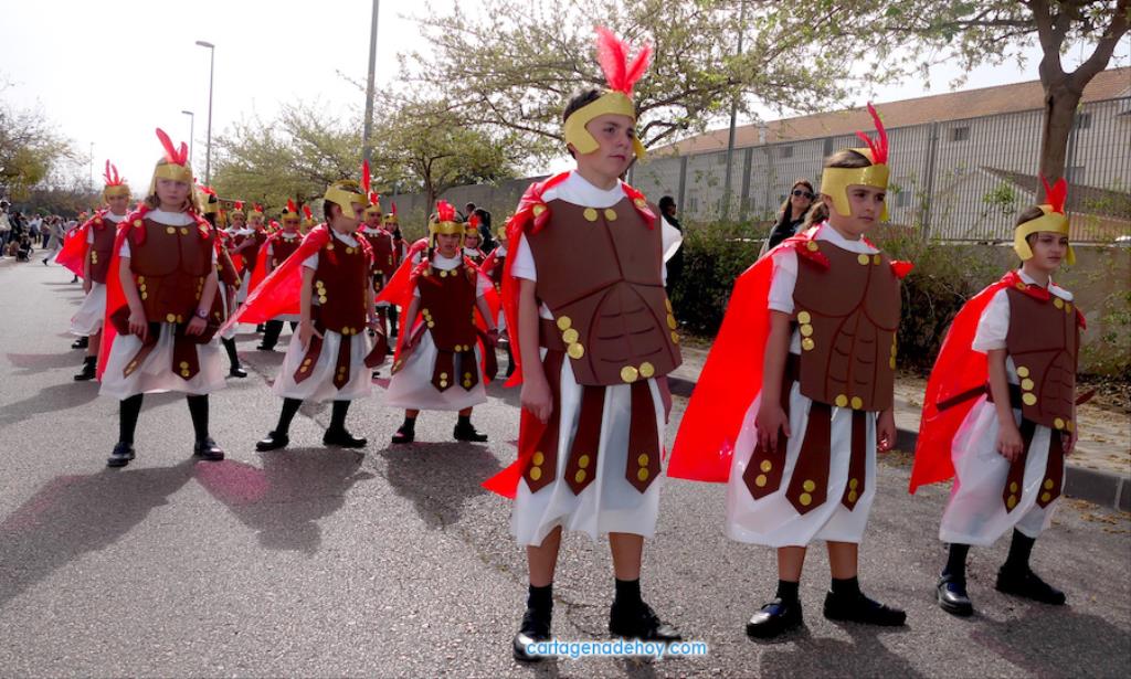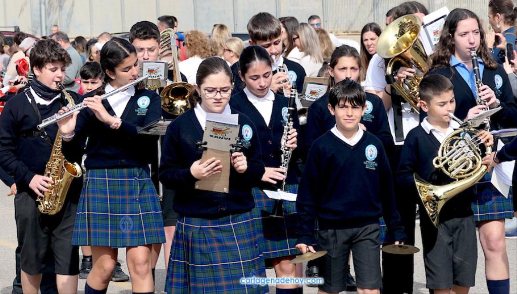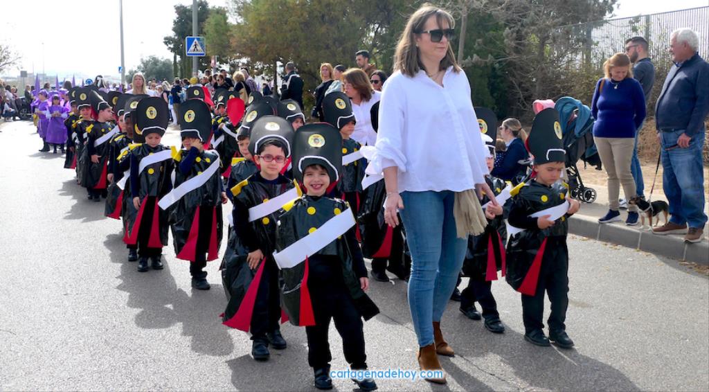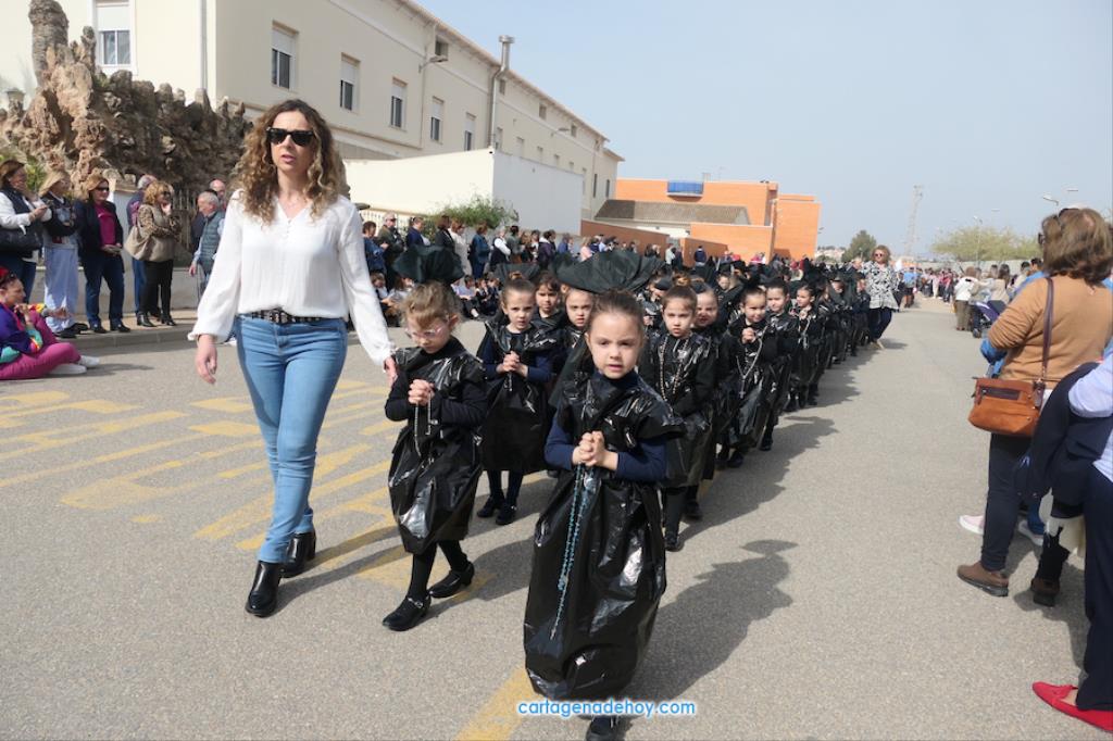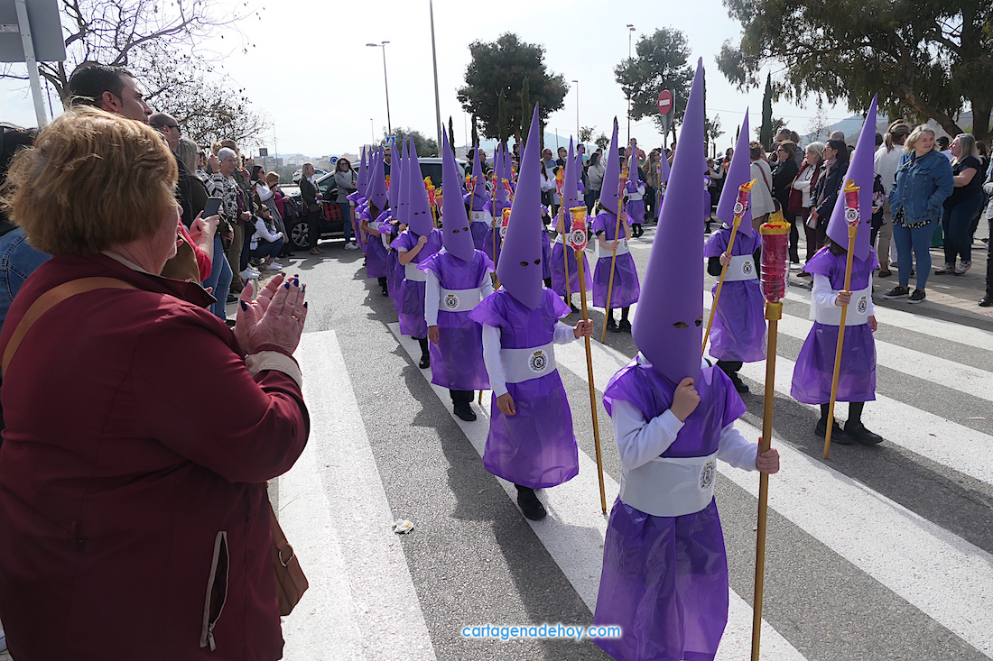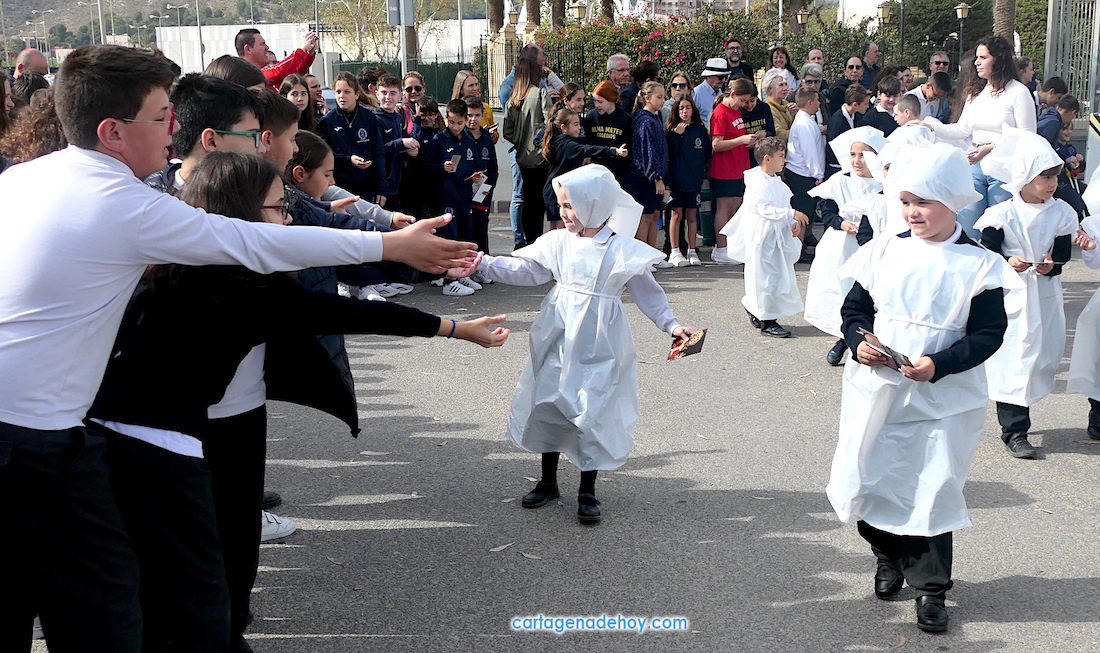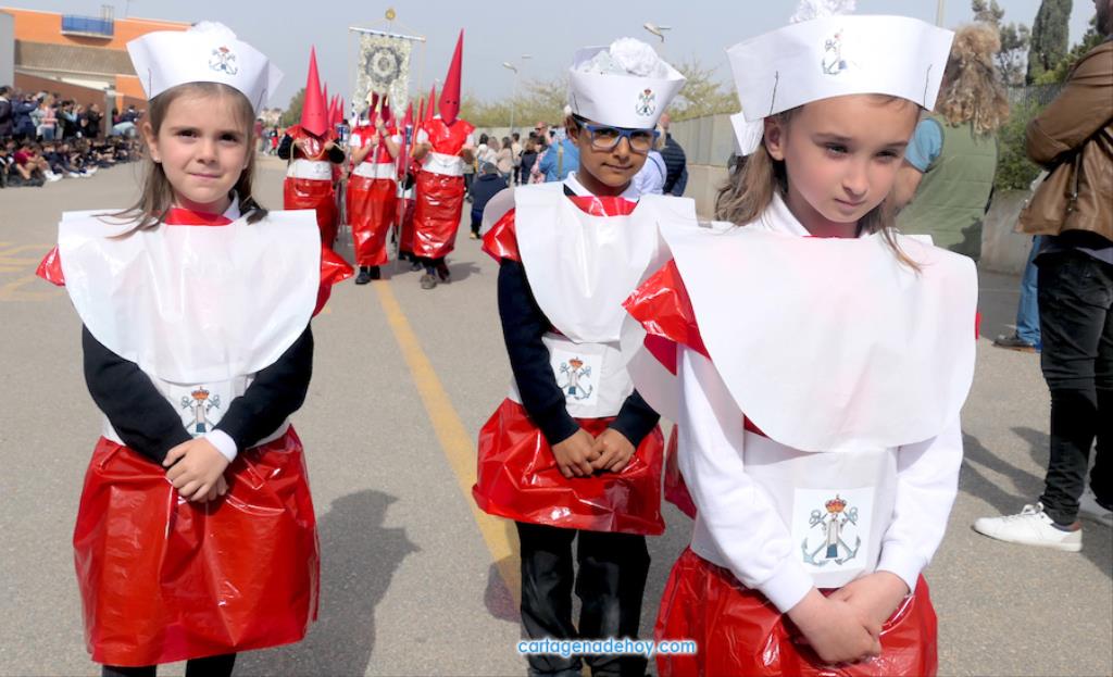 La Semana Santa de Cartagena está trabajando en conseguir su relevo generacional, pero más abajo también existe una asignatura pendiente, pues, como nos apunta algunos cofrades, cada vez es más difícil que los chavales se 'enganchen' a las procesiones. Muchos los hacen porque ahí los 'colocan' sus padres, pero conforme crecen se van liberando de esa obligación. Por ello, para que no sea una obligación y sí una devoción, son importantes iniciativas como las que llevan a cabo algunos colegios. En este caso, ha sido el colegio San Vicente de Paúl el que nos invitó a contemplar su desfile pasionario y lo cierto es que ha sido una sorpresa muy agradable y cautivadora.