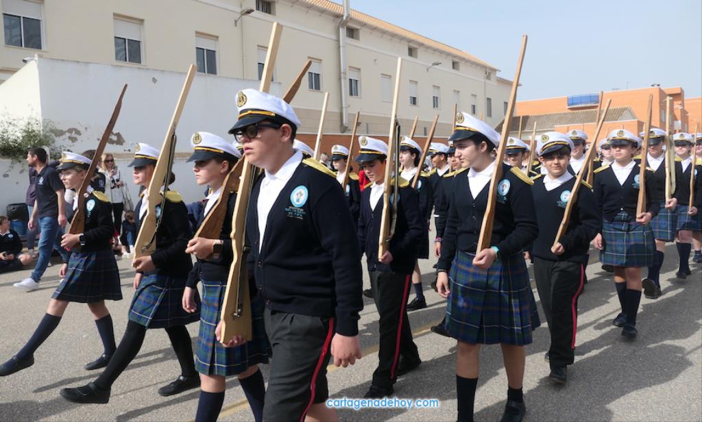 Los (muchos espectadores) han podido sentir muchos lazos comunes con el joven desfile escolar y el tradicional de la ciudad, desde los sonidos hasta el cierre con piquete que luce gorra militar y fusiles de madera pasando por los colores como por la formación. Ha faltado el típico orden del paso cartagenero, pero, nunca mejor dicho, todo se andará. También hay numerosos detalles, como los símbolos y dibujos, relacionados. No falta en los tres grupos nazarenos (marrajo, resucitado y marrajo) la entrega al público de postales. Unas son de elaboración propia y otras han sido aportadas por las hermandades o agrupaciones. Otro detalle que gusta es que la paridad de sexos es absoluta, siendo todos los tronos llevados por grupos mixtos de costaleros.