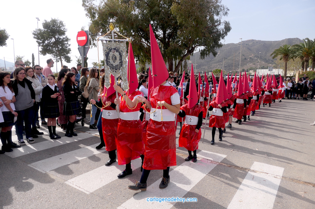 El colegio San Vicente de Paúl ha sacado su cortejo pasionario por segunda año, habiendo crecido en cuanto a elementos y participantes en esta edición. El vestuario de los alumnos, elaborado de forma artesanal, emula de los grandes cortejos cartageneros, al igual que tronos y hachotes, siendo cautivadora la visión de la puesta en escena, en la que están representadas las cuatro principales cofradías pasionarias.
