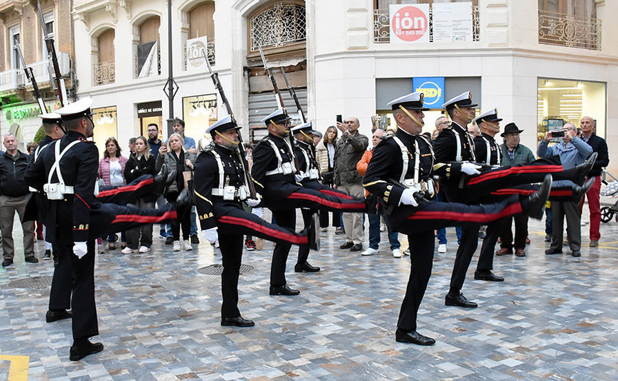 El fotógrafo Luis Godínez Roa ofrece un amplio reportaje del solemne acto que tuvo lugar ante Capitanía General de Cartagena por parte del piquete de la sección de honores del Tercio de Levante de la Infantería de Marina. En esta ocasión, en los recorridos de ida y regreso, la fuerza participante marcó el paso lento característico de la Semana Santa.