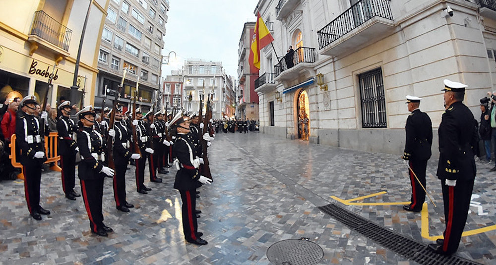 En esta ocasión, la Fuerza que rinde Honores estará compuesta por personal del Piquete que forma la Sección de Honores, del Tercio de Levante de la Infantería de Marina, que acompaña a la agrupación de San Pedro Apóstol durante las procesiones de Semana Santa, además de la Unidad de Música del Tercio de Levante con banda de cornetas y tambores. En su traslado hacia Capitanía General y durante el regreso al Arsenal, el Piquete marcará el paso lento característico de la Semana Santa.