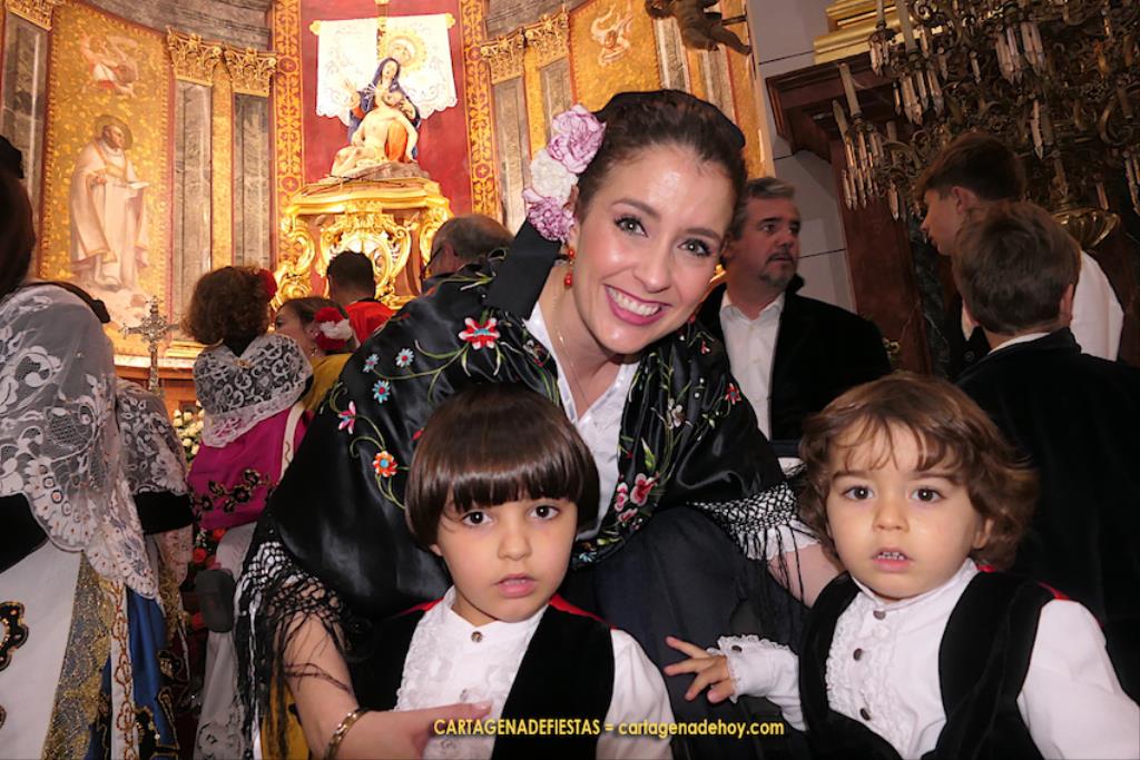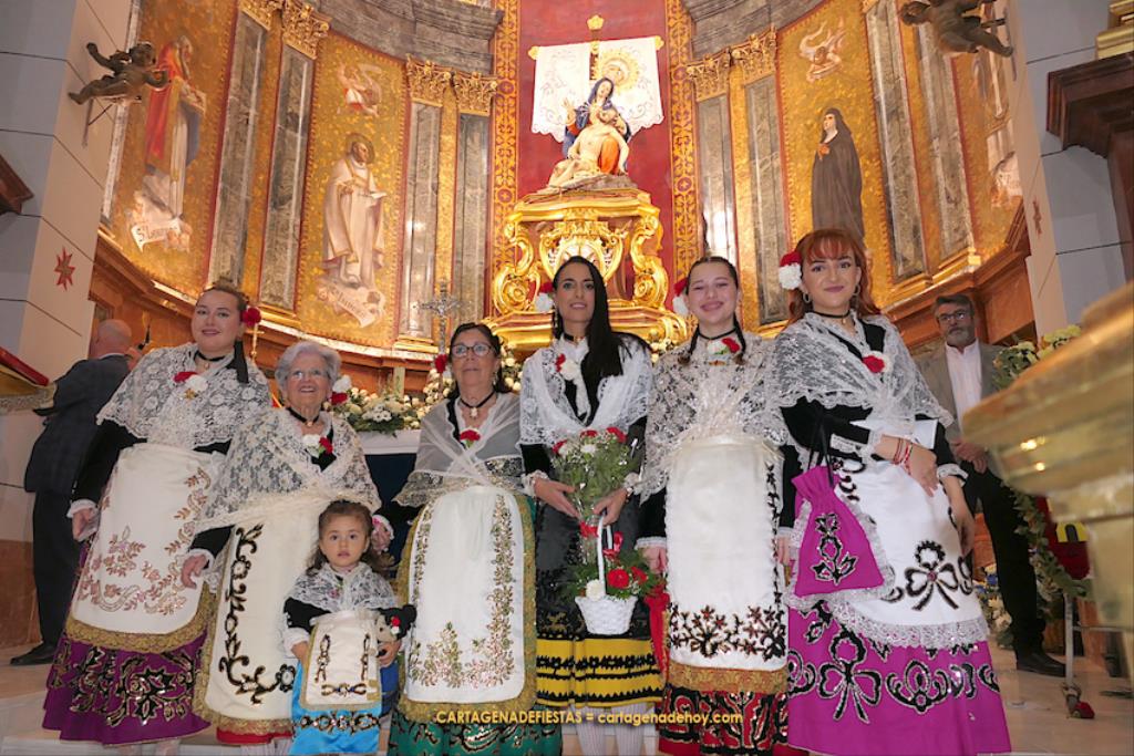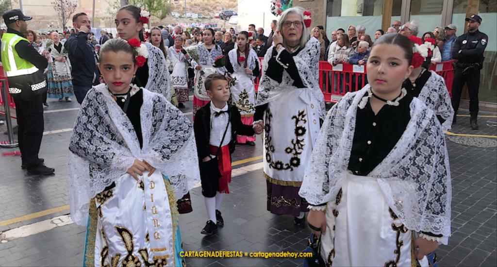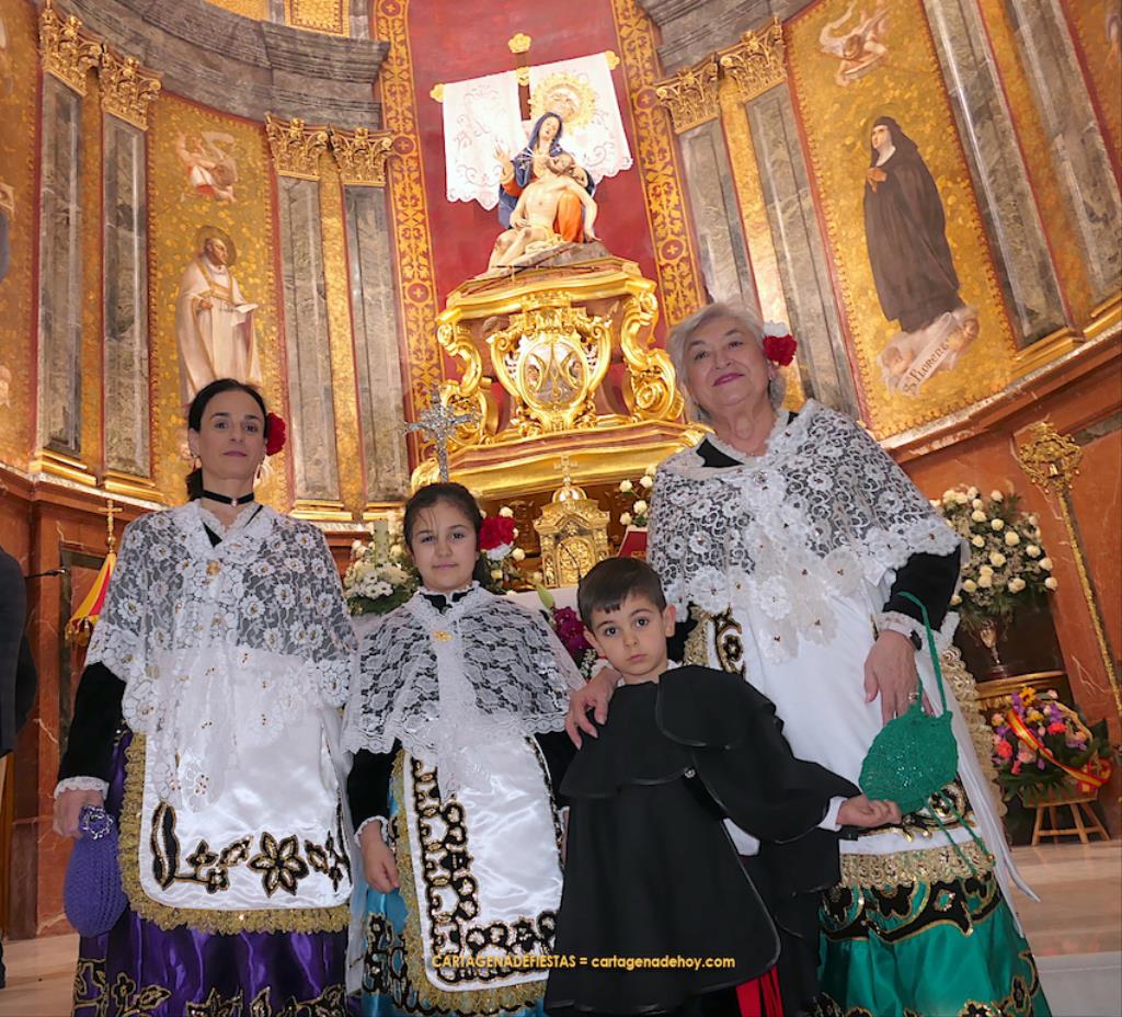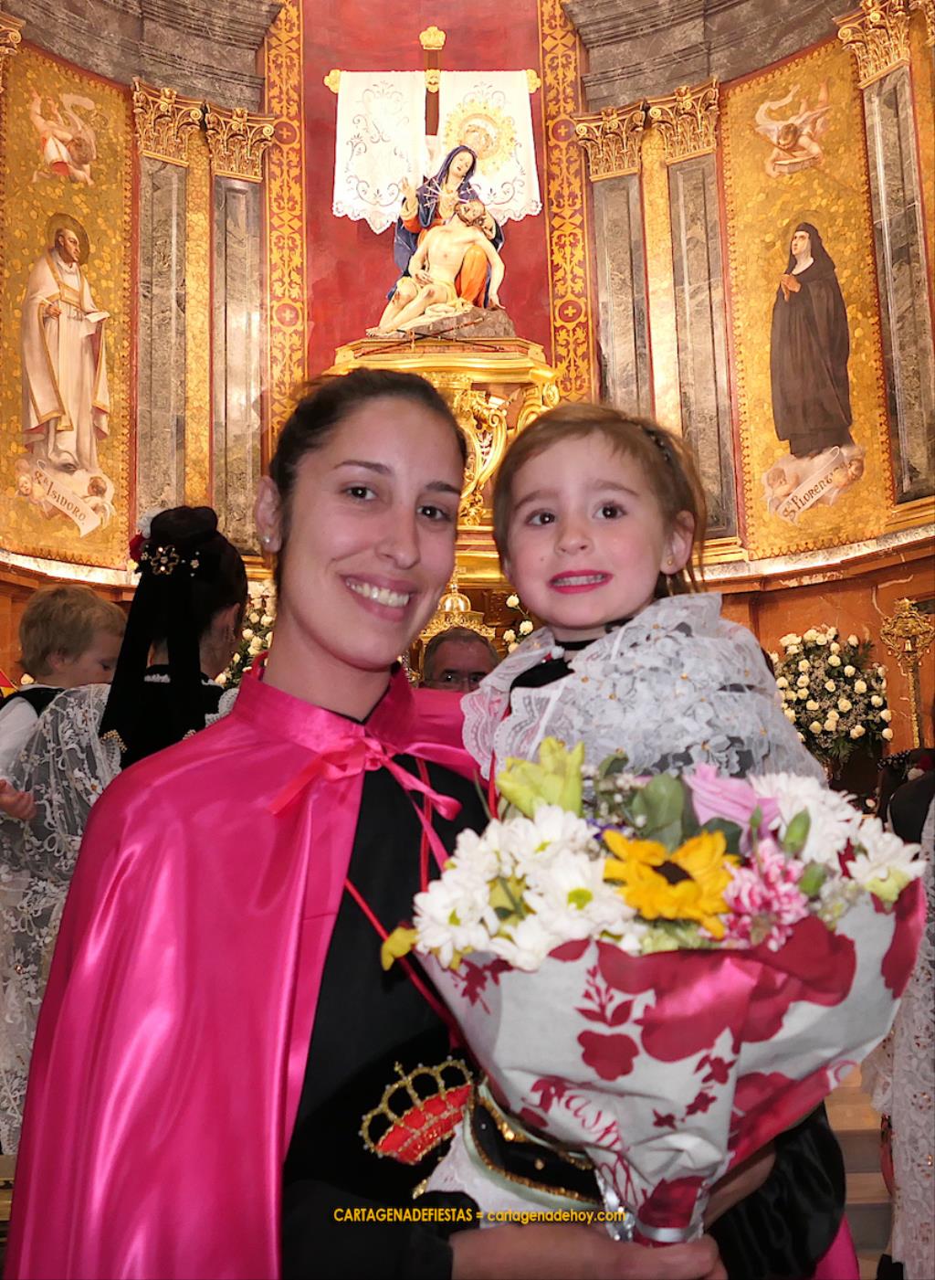 En 2023 coincidimos en la basílica con Ángela y su hija, Paola, a quienes fotografiamos porque en ellas confluían dos eventos de esta jornada, las procesiones (la madre llevaba el vestuario californio) y la ofrenda floral (la niña lucía el típico traje cartagenero). Este año las hemos vuelto a ver, nuevamente con una ofrenda de un ramo de flores de ambas a la Virgen de la Caridad. Para ellas ya es una tradición desde que nació la pequeña hace tres años.