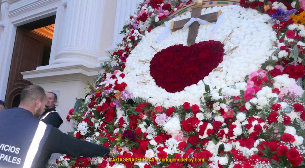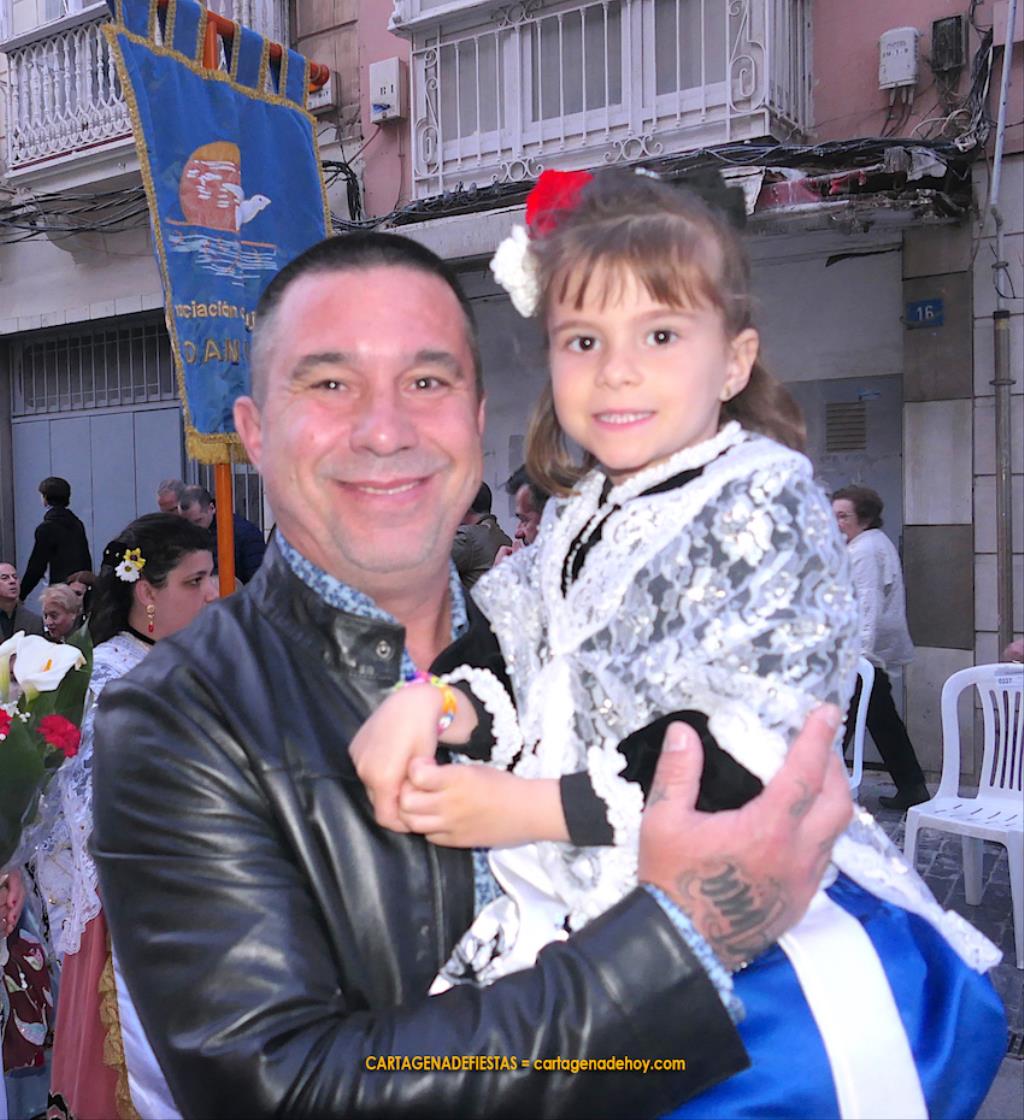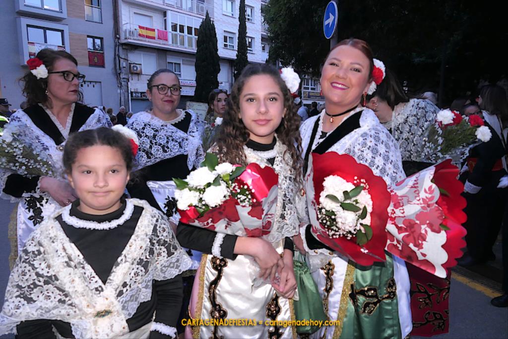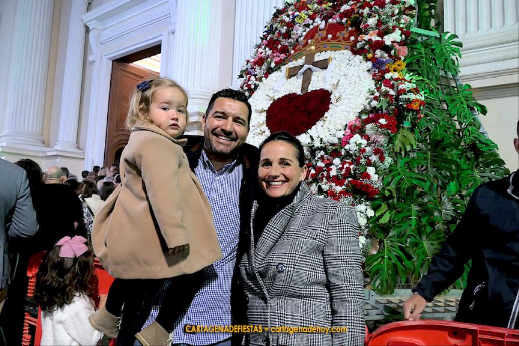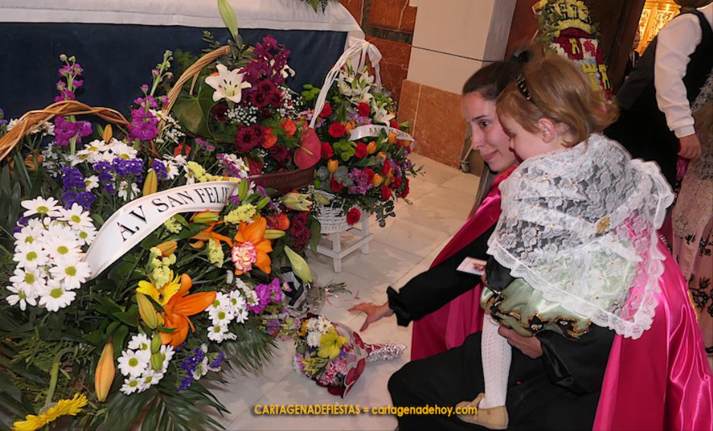 En 2023 coincidimos en la basílica con Ángela y su hija, Paola, a quienes fotografiamos porque en ellas confluían dos eventos de esta jornada, las procesiones (la madre llevaba el vestuario californio) y la ofrenda floral (la niña lucía el típico traje cartagenero). Este año las hemos vuelto a ver, nuevamente con una ofrenda de un ramo de flores de ambas a la Virgen de la Caridad. Para ellas ya es una tradición desde que nació la pequeña hace tres años.