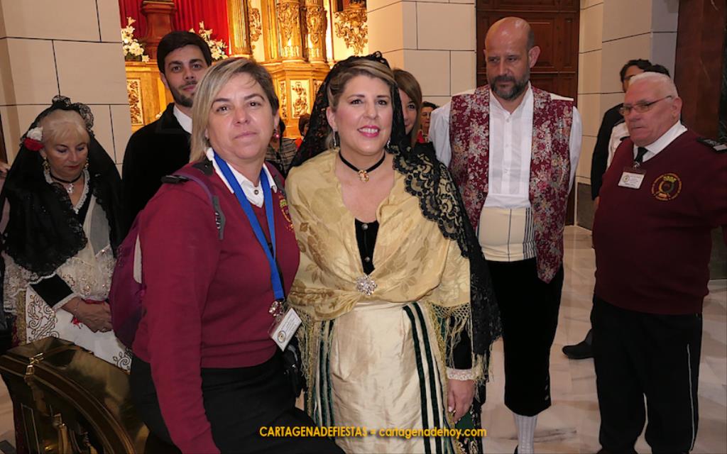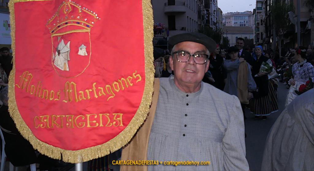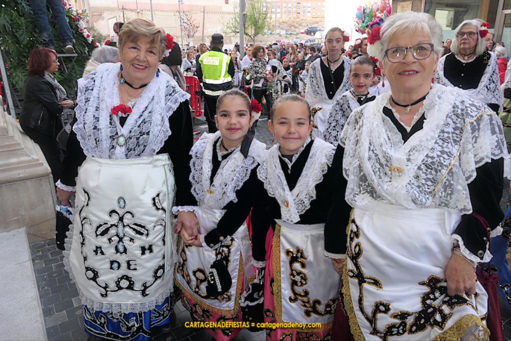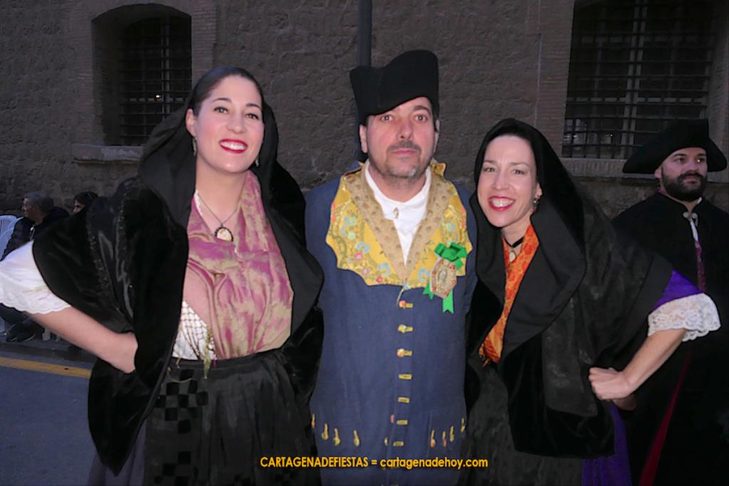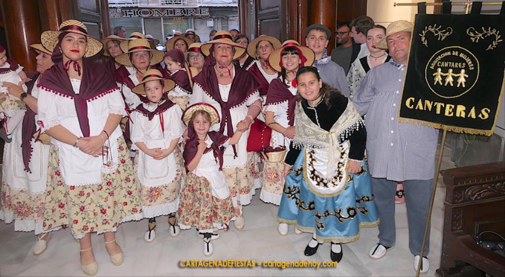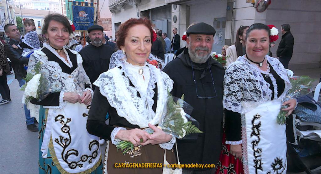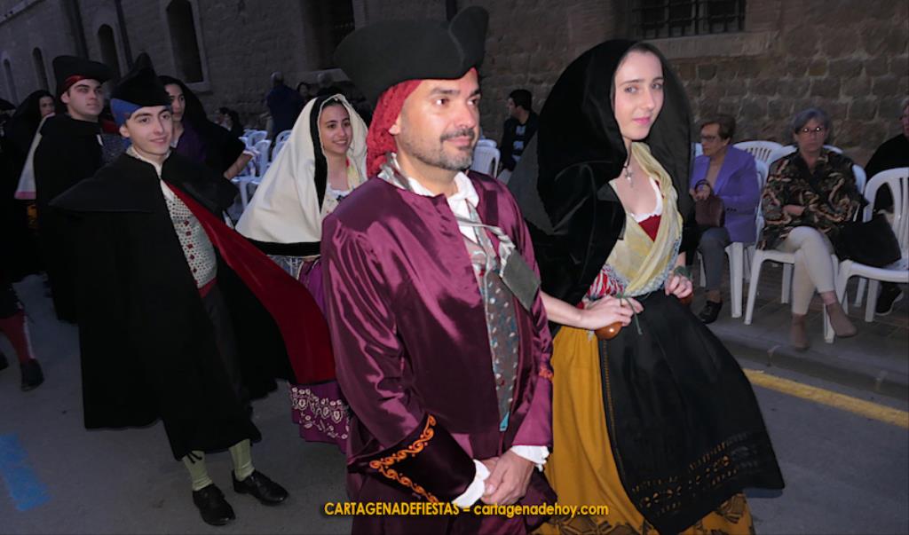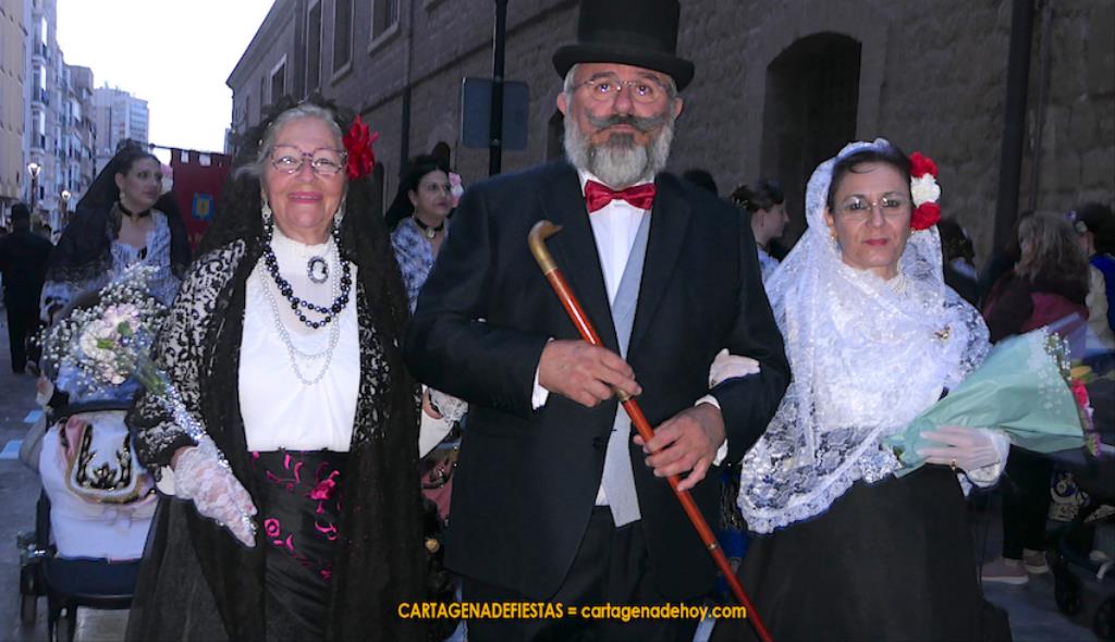 Más apuntes. Un valenciano ha venido expresamente para estar en este desfile con los molineros de Molinos Marfagones. La diputa regional María Casajús ha sido captada por el grupo de Los Dolores, los ediles Pencho Soto, Toñi Ruiz y Manuel Torres han ido en los colectivos de sus tierras natales, respectivamente, Estrecho de San Ginés-Llano del Beal, folclore de La Palma y los pescadores de Santa Lucía. Al principio del desfile, como partidos políticos, pasaron Sí Cartagena, Movimiento Ciudadano y Partido Popular, quedando en el interior de la basílica varios ediles de este último, de los que Diego Ortega y Nacho Jáudenes llevaban ropaje tradicional, al igual que la alcaldesa, Noelia Arroyo. Les precedieron en el desfile las cofradías marraja, california y resucitada. En total, han sido 55 los grupos participantes con integrantes que es posible que abarcan todas las edades entre uno y 91 años.
