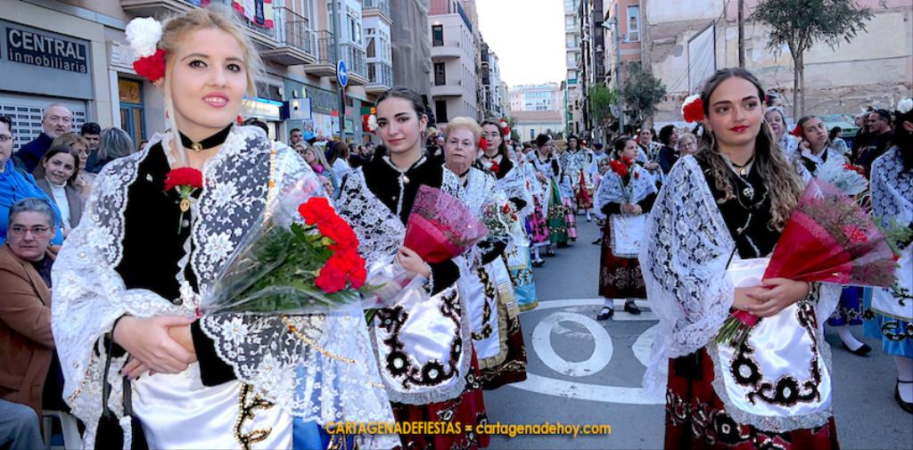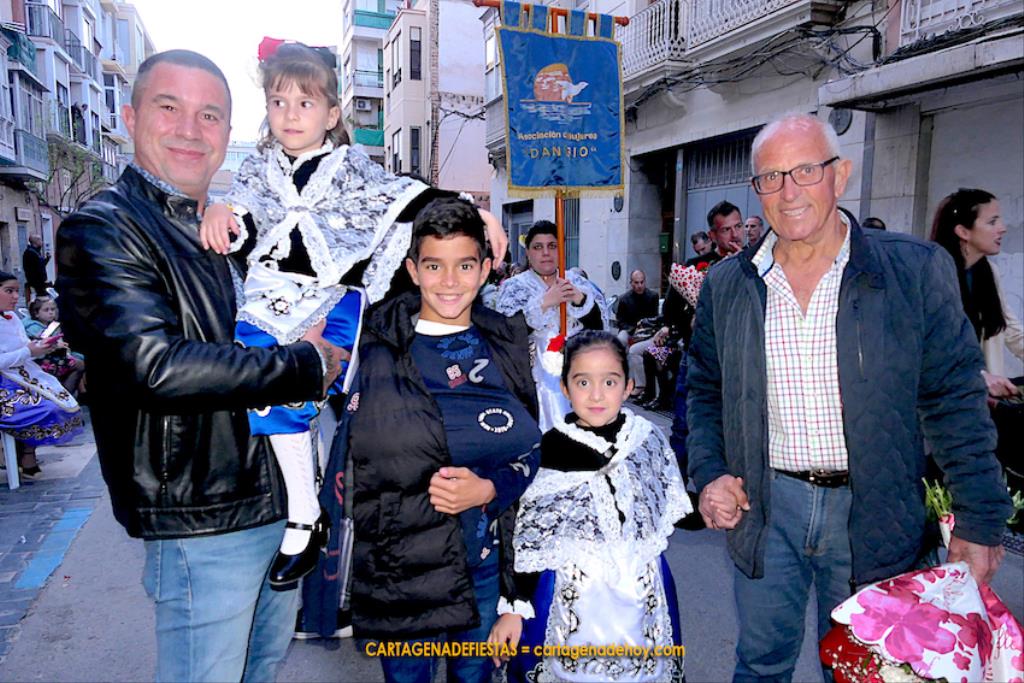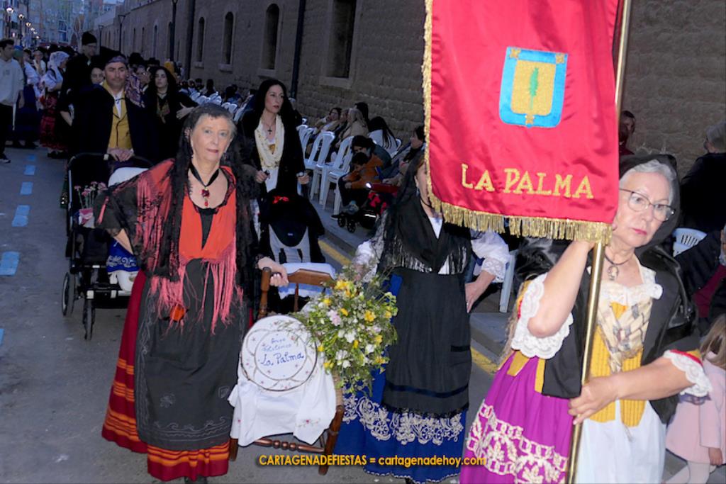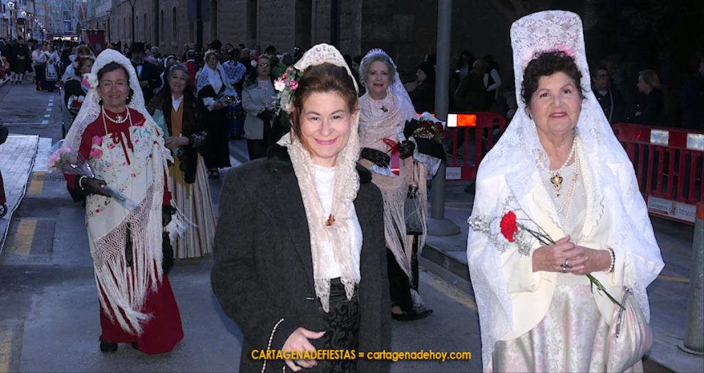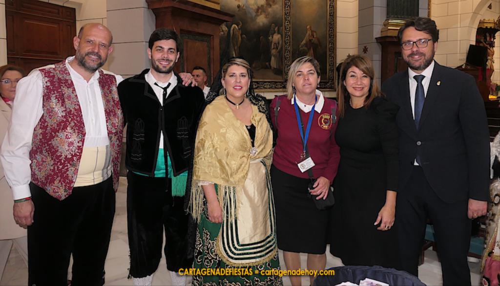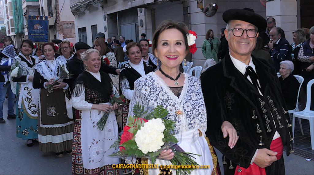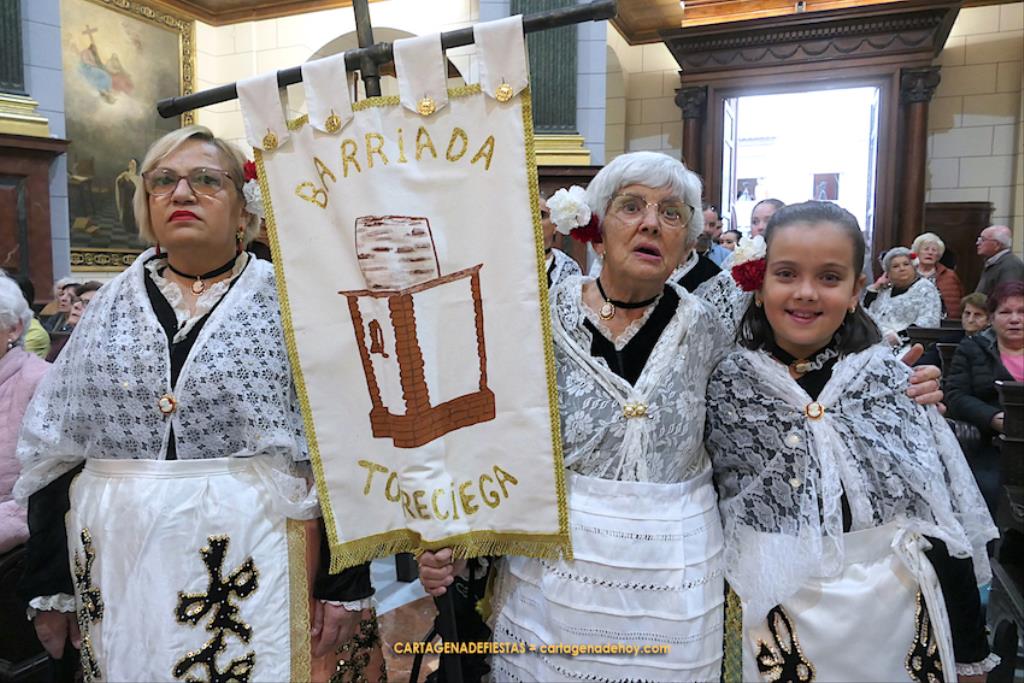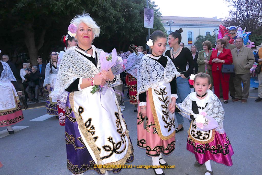 Más apuntes. Un valenciano ha venido expresamente para estar en este desfile con los molineros de Molinos Marfagones. La diputa regional María Casajús ha sido captada por el grupo de Los Dolores, los ediles Pencho Soto, Toñi Ruiz y Manuel Torres han ido en los colectivos de sus tierras natales, respectivamente, Estrecho de San Ginés-Llano del Beal, folclore de La Palma y los pescadores de Santa Lucía. Al principio del desfile, como partidos políticos, pasaron Sí Cartagena, Movimiento Ciudadano y Partido Popular, quedando en el interior de la basílica varios ediles de este último, de los que Diego Ortega y Nacho Jáudenes llevaban ropaje tradicional, al igual que la alcaldesa, Noelia Arroyo. Les precedieron en el desfile las cofradías marraja, california y resucitada. En total, han sido 55 los grupos participantes con integrantes que es posible que abarcan todas las edades entre uno y 91 años.