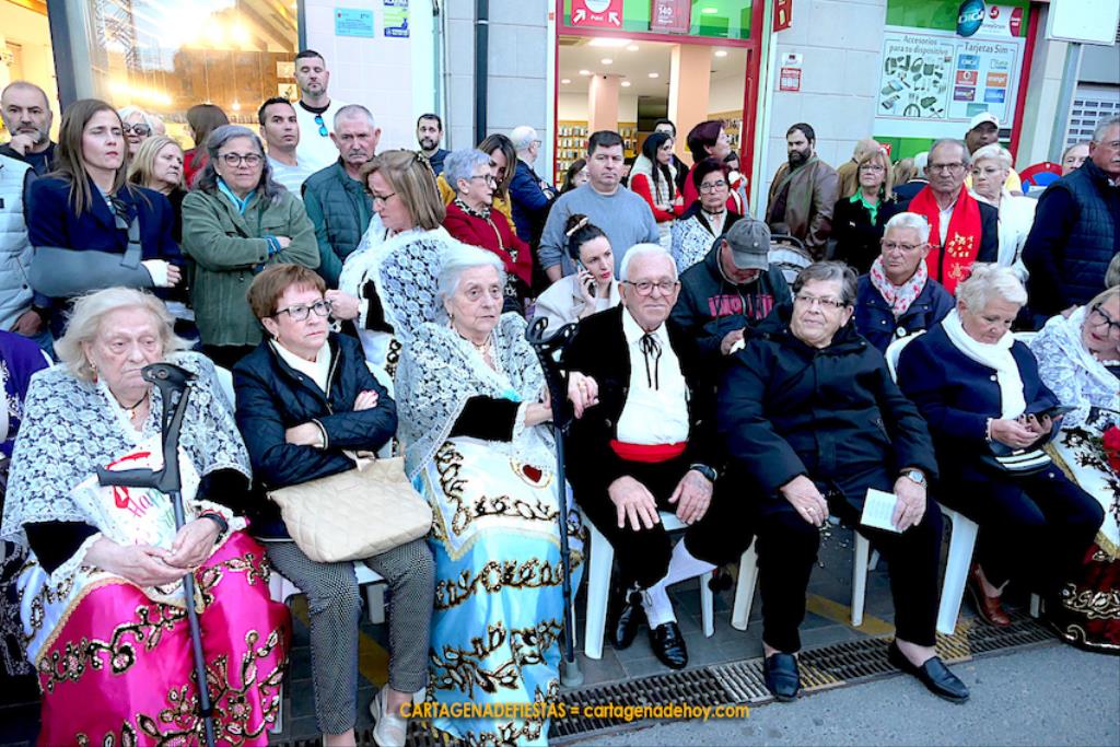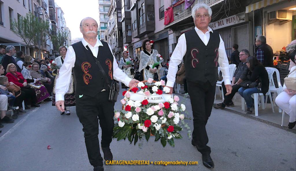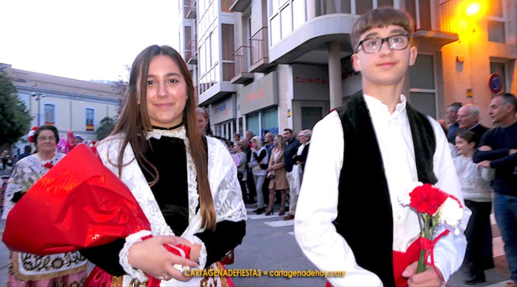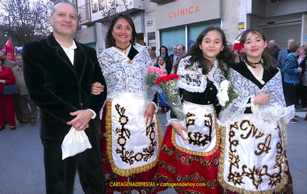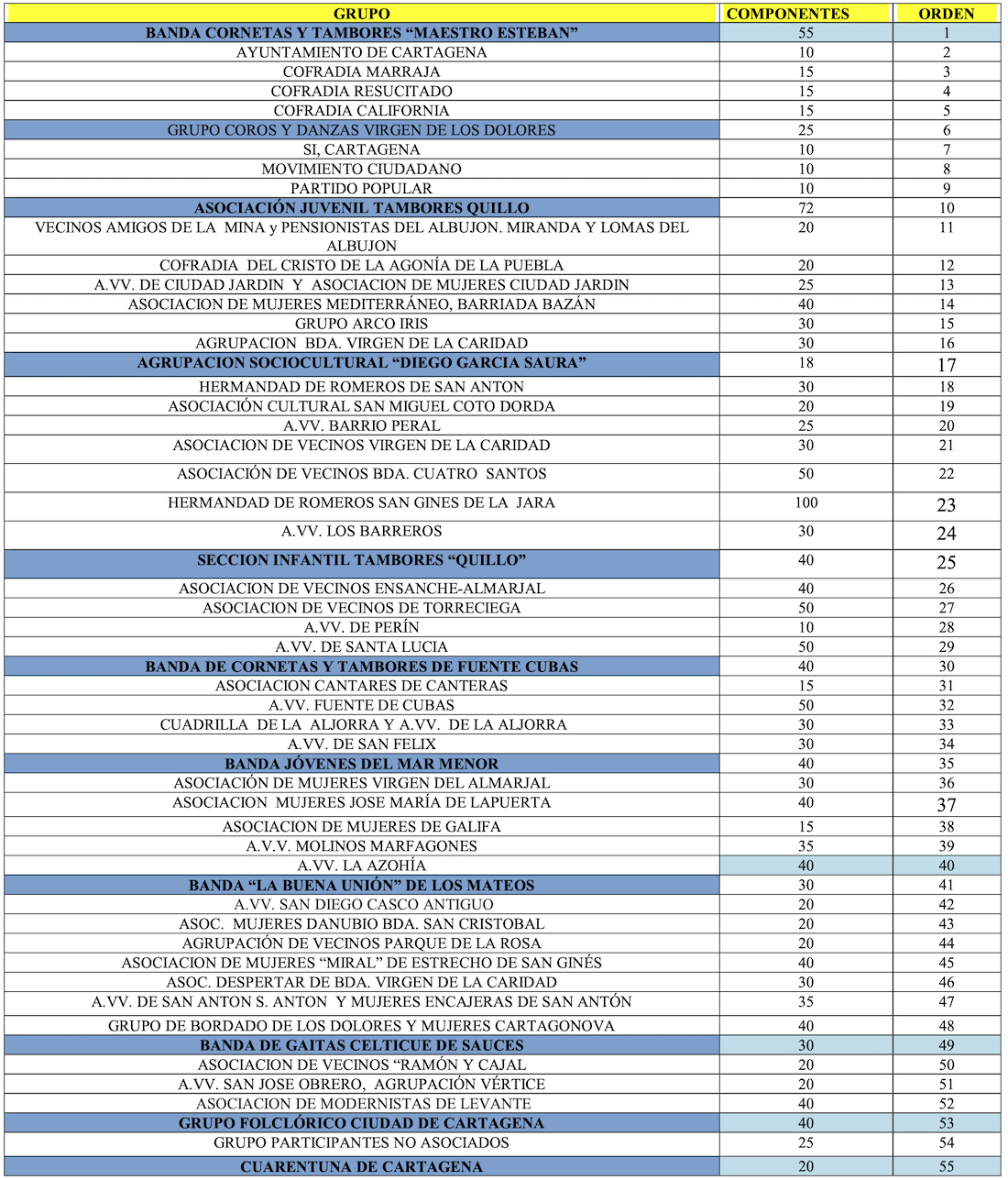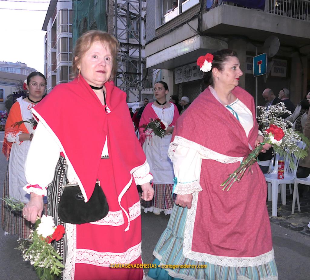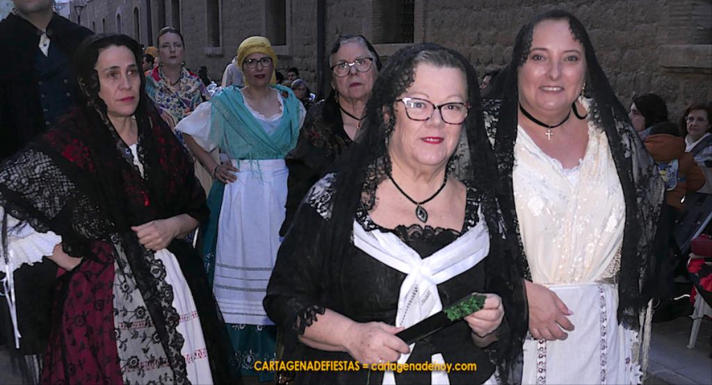 Más apuntes. Un valenciano ha venido expresamente para estar en este desfile con los molineros de Molinos Marfagones. La diputa regional María Casajús ha sido captada por el grupo de Los Dolores, los ediles Pencho Soto, Toñi Ruiz y Manuel Torres han ido en los colectivos de sus tierras natales, respectivamente, Estrecho de San Ginés-Llano del Beal, folclore de La Palma y los pescadores de Santa Lucía. Al principio del desfile, como partidos políticos, pasaron Sí Cartagena, Movimiento Ciudadano y Partido Popular, quedando en el interior de la basílica varios ediles de este último, de los que Diego Ortega y Nacho Jáudenes llevaban ropaje tradicional, al igual que la alcaldesa, Noelia Arroyo. Les precedieron en el desfile las cofradías marraja, california y resucitada. En total, han sido 55 los grupos participantes con integrantes que es posible que abarcan todas las edades entre uno y 91 años.