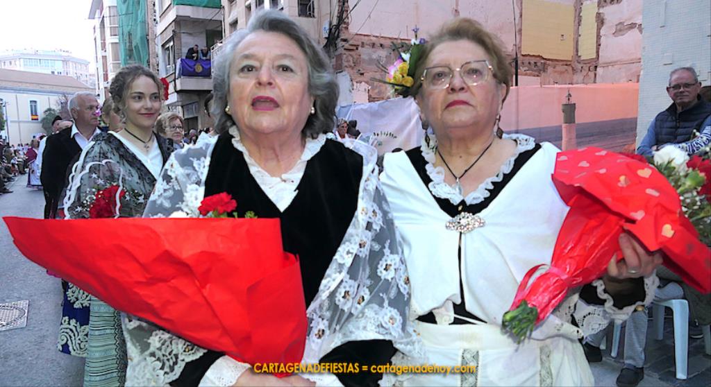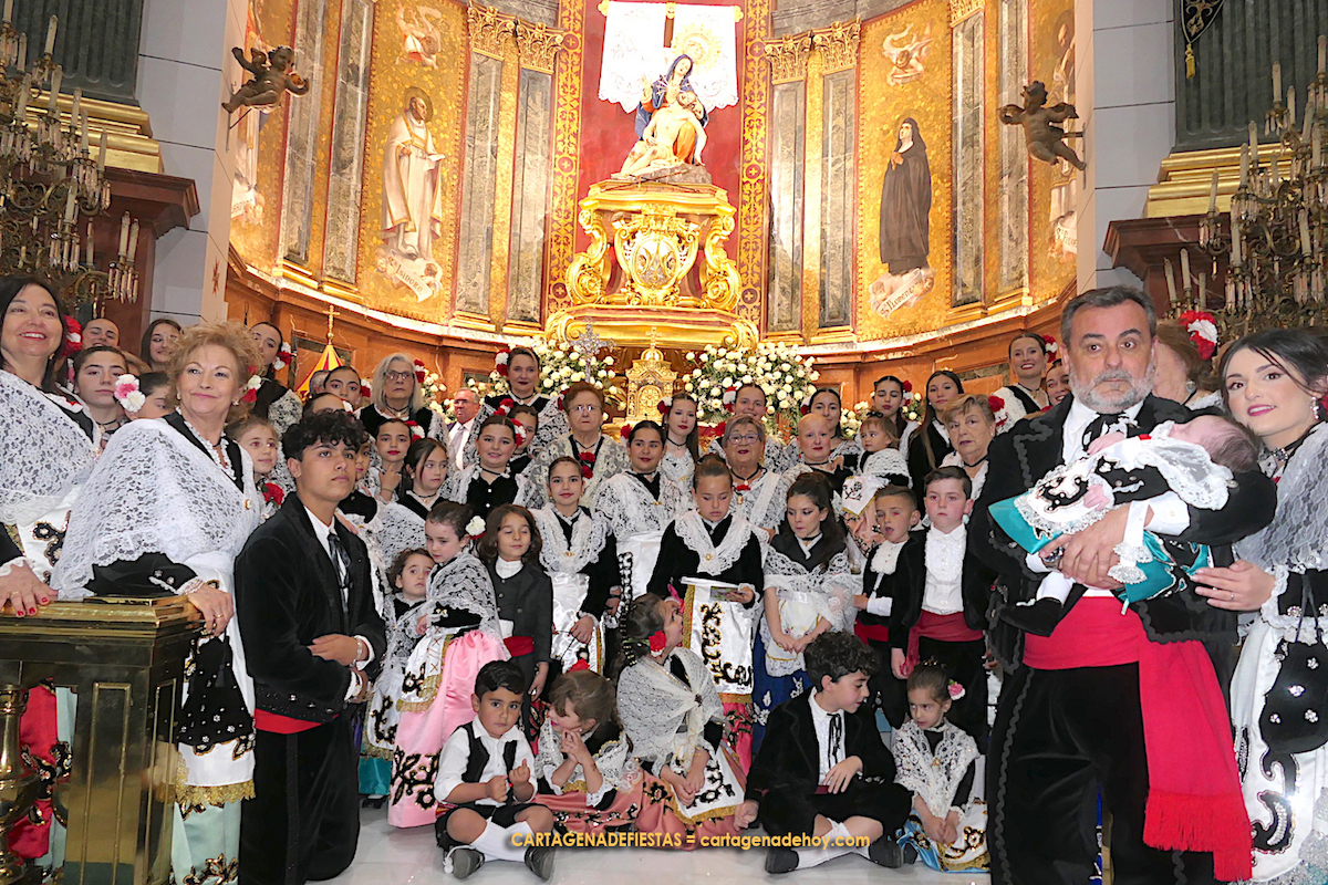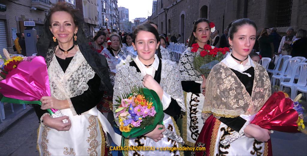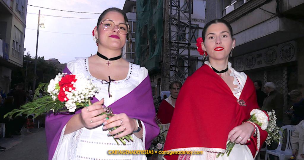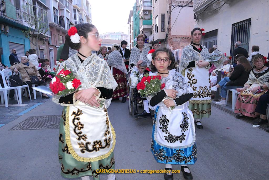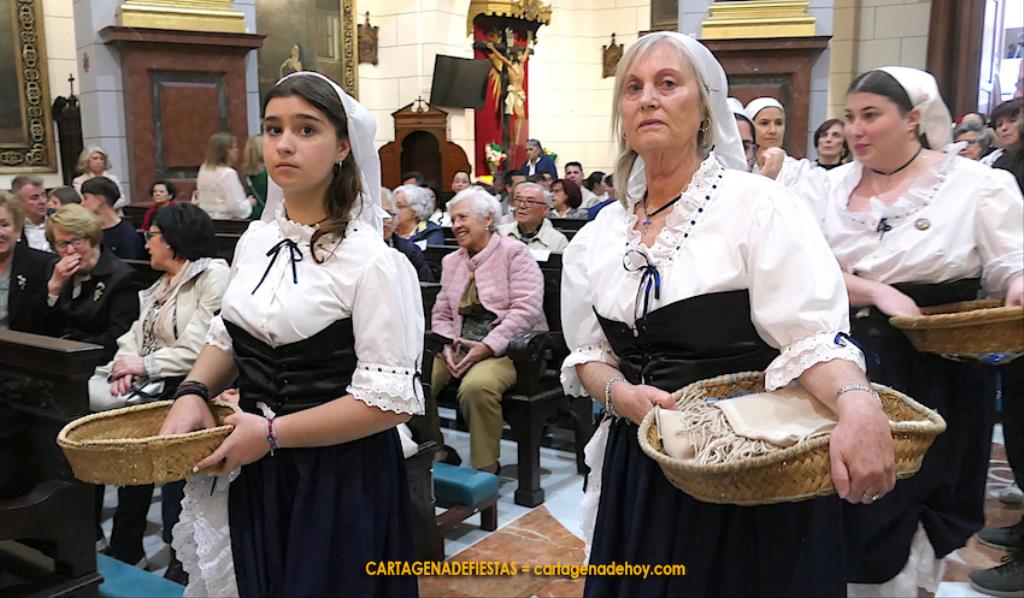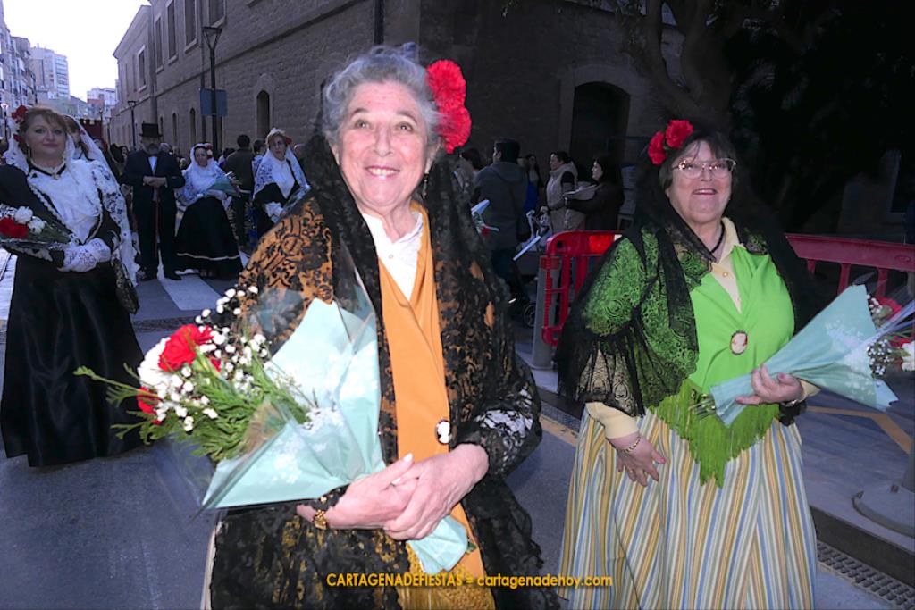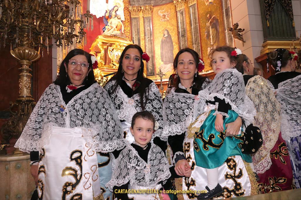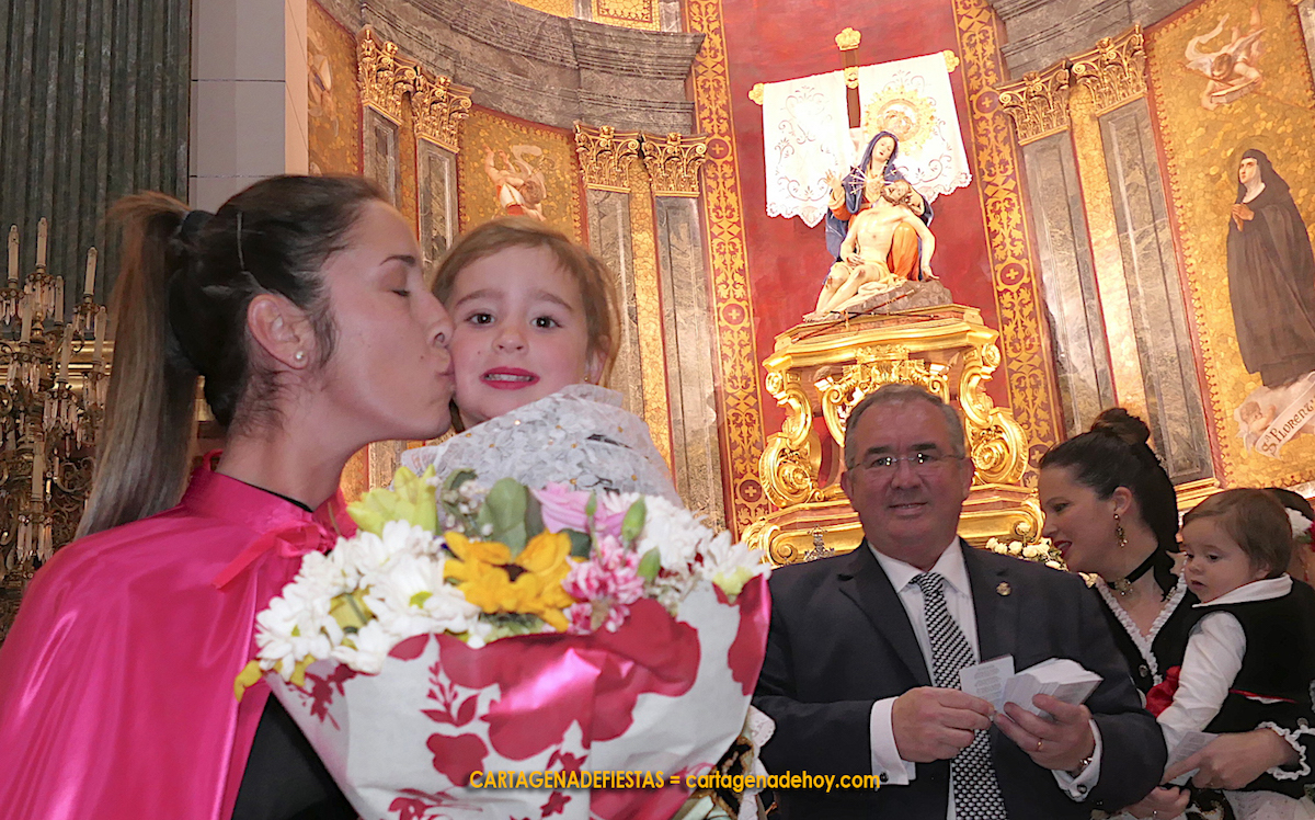 Paola tiene 3 añitos y, desde que nación, su madre, Ángela (procesionista del Cristo de la Misericordia), la lleva ante la Virgen de la Caridad, a la que entrega un ramo de flores. En el otro extremo está Isabel Quiñonero, de 91 años de edad y que lleva más de medio siglo acudiendo al templo. Son dos ejemplos de las muchas vivencias que se dan cada año en el Viernes de Dolores con unos dos mil participantes en el desfile que más representan a lo que es el municipio de Cartagena.