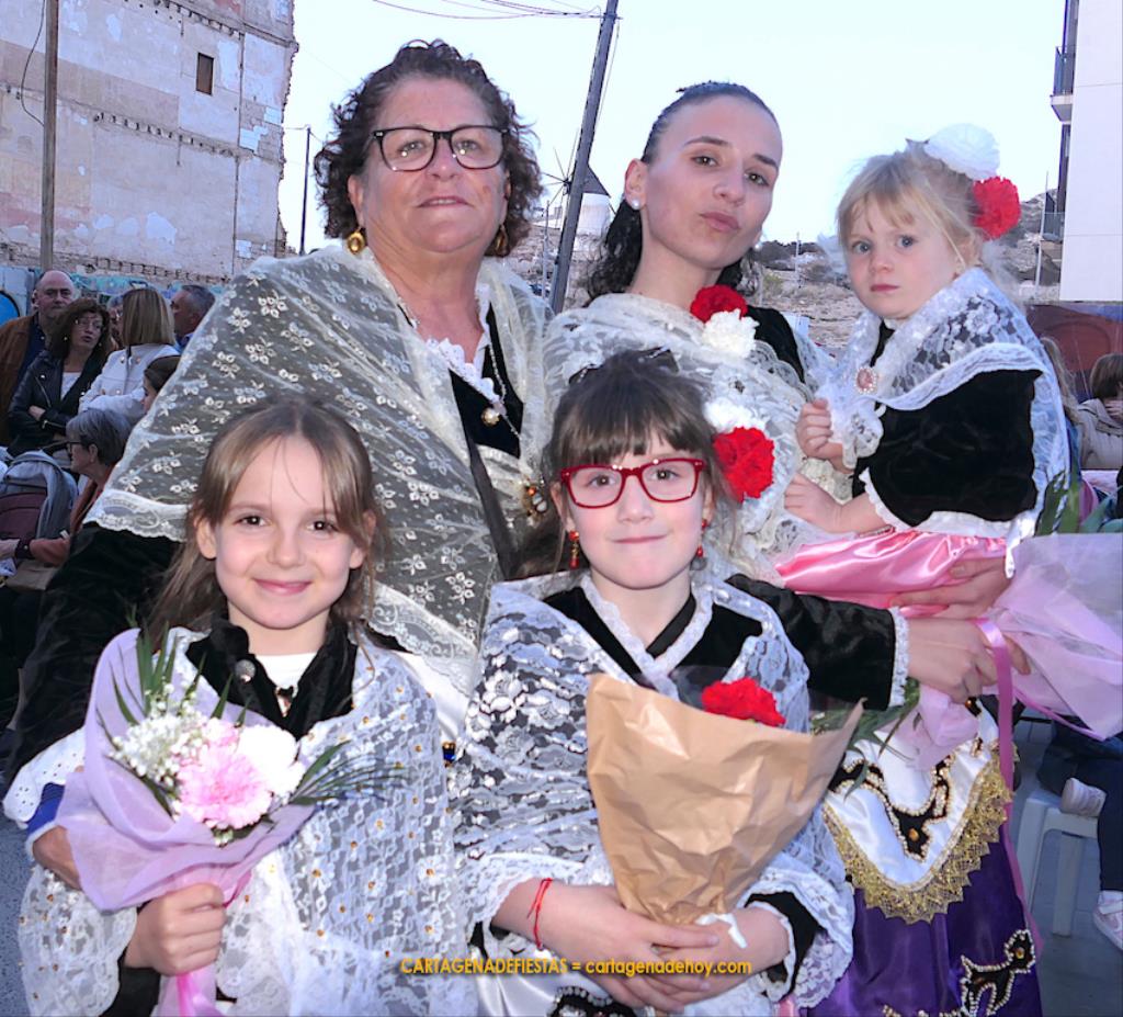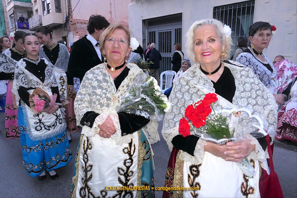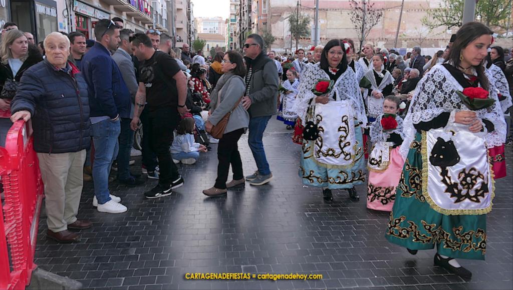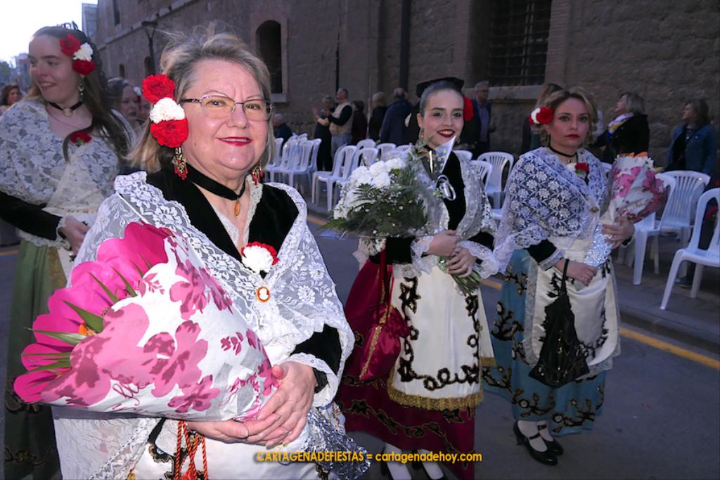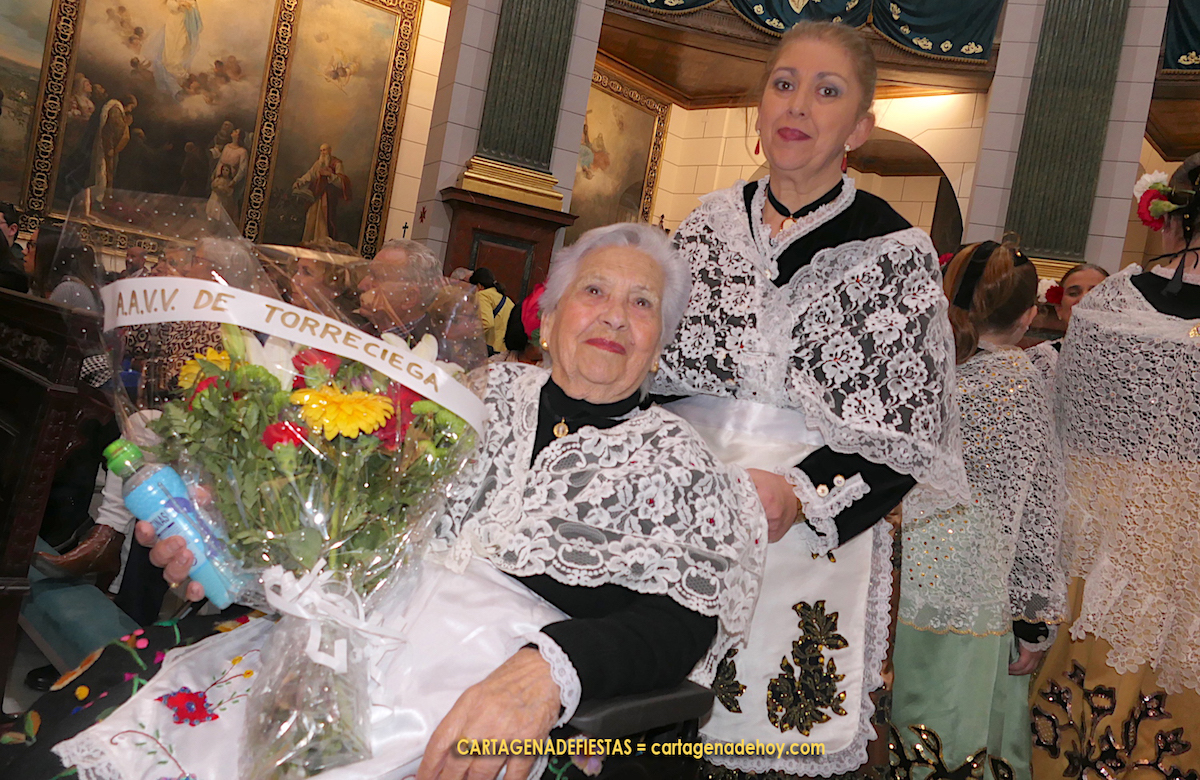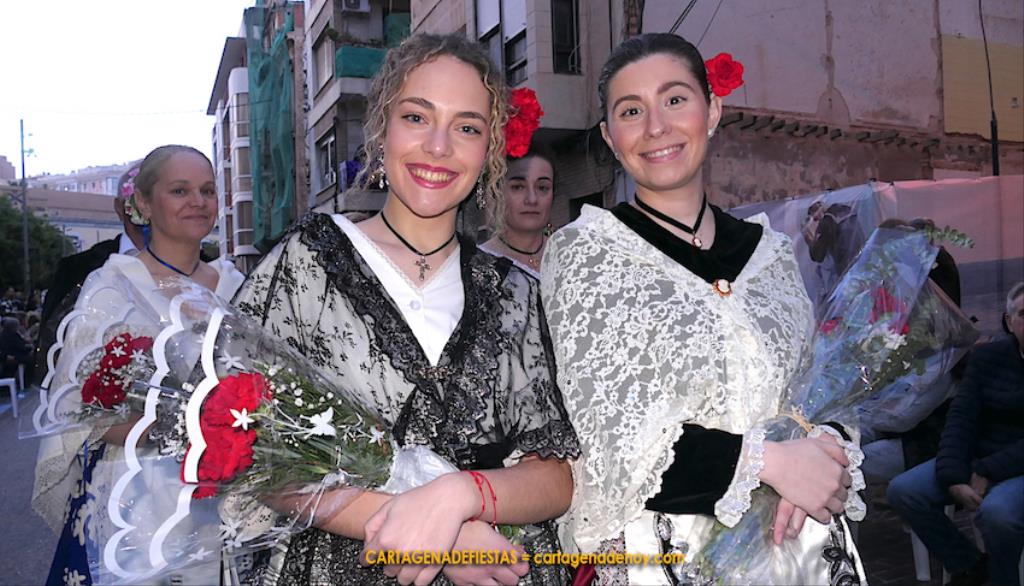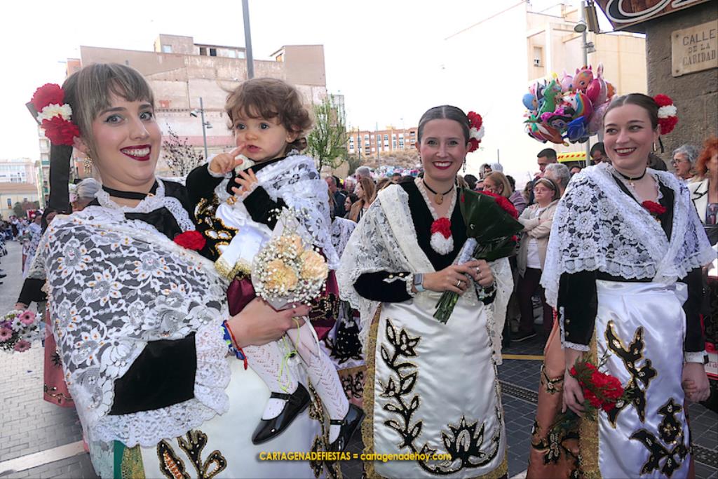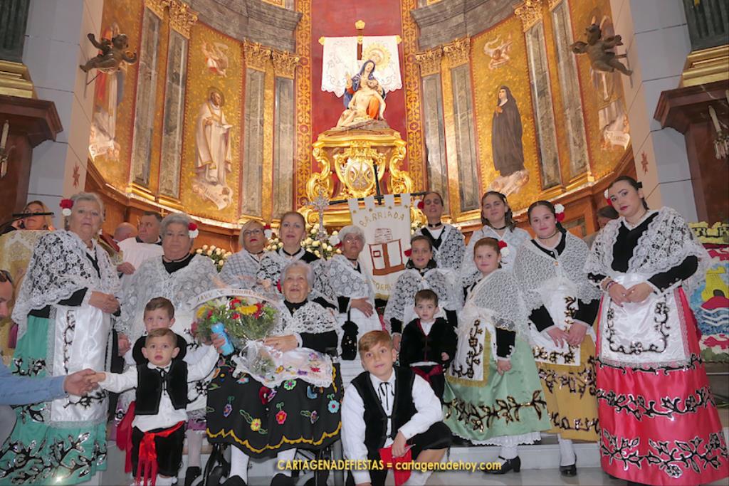 Paola tiene 3 añitos y, desde que nación, su madre, Ángela (procesionista del Cristo de la Misericordia), la lleva ante la Virgen de la Caridad, a la que entrega un ramo de flores. En el otro extremo está Isabel Quiñonero, de 91 años de edad y que lleva más de medio siglo acudiendo al templo. Son dos ejemplos de las muchas vivencias que se dan cada año en el Viernes de Dolores con unos dos mil participantes en el desfile que más representan a lo que es el municipio de Cartagena.