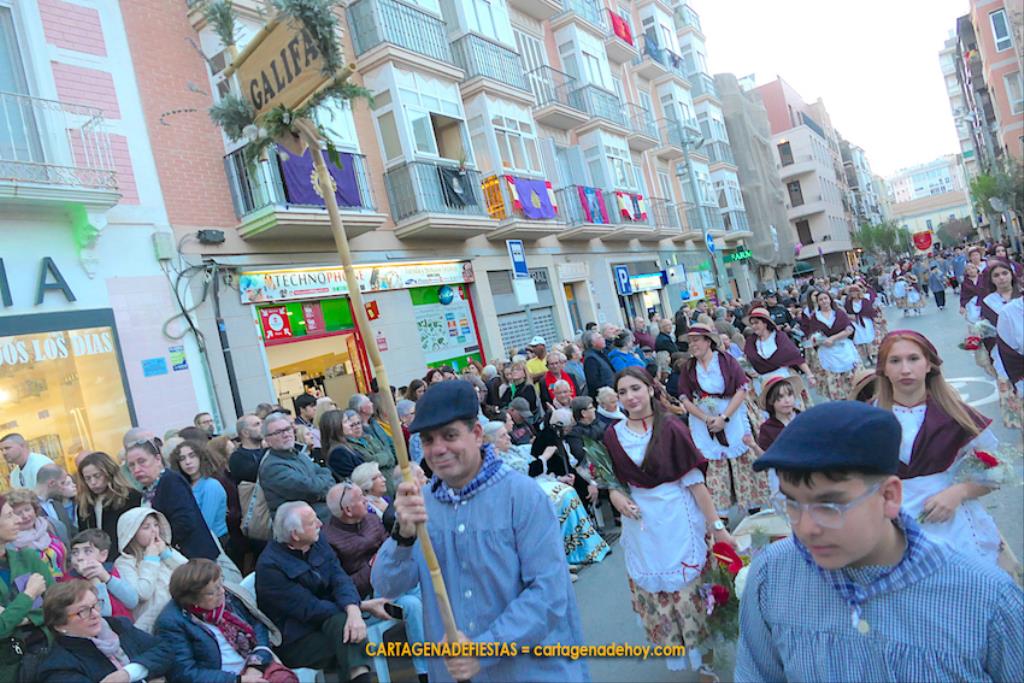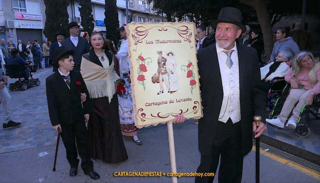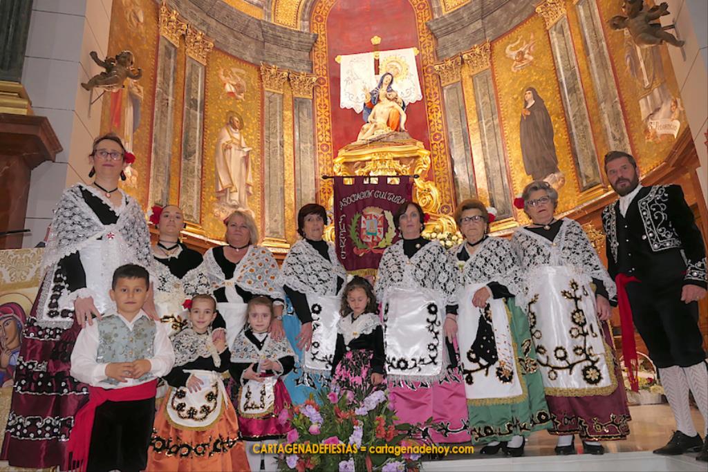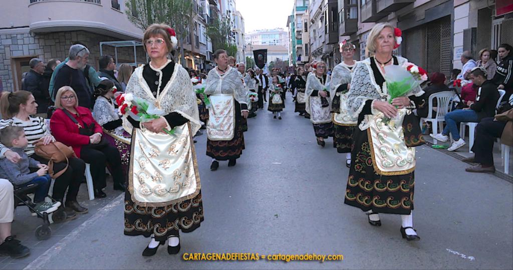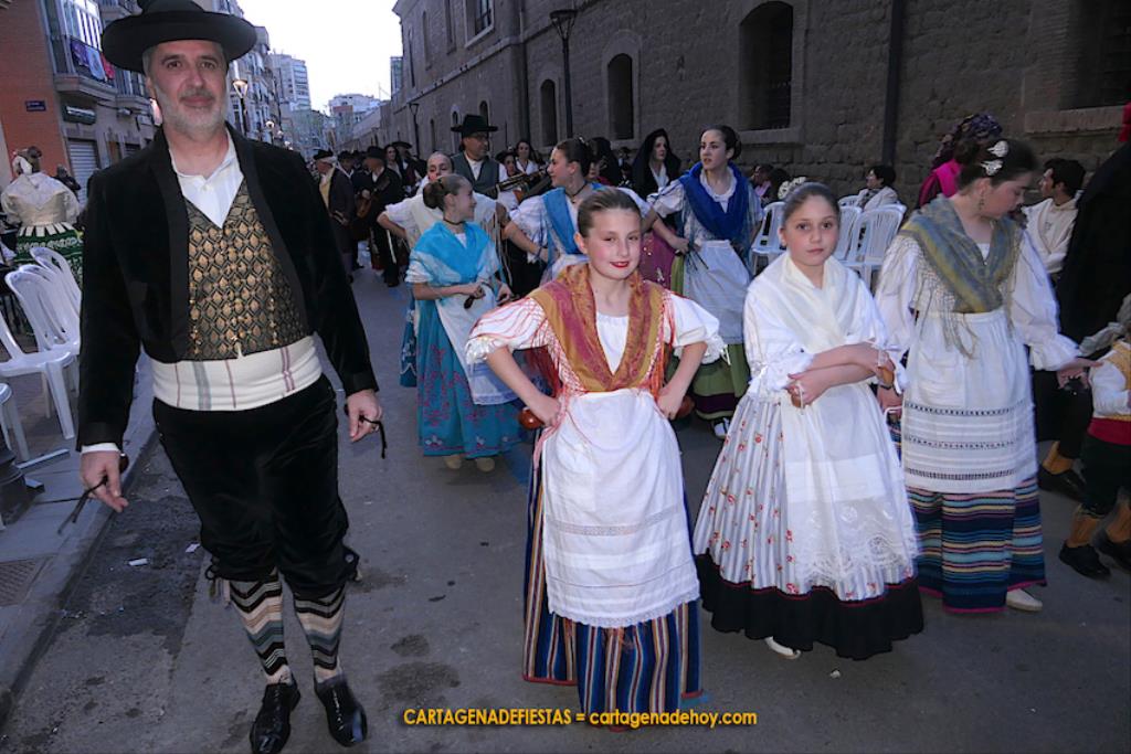 Siguen luciendo los trajes más fieles a los residentes en nuestros campos, mientras que la asociación Cartagena de Levante no falta a esta cita con el antiguo vestuario de la época modernista. Estos dos grupos, junto a los ‘Cuarentunos’, son los que cierra un gran desfile que dura algo más de tres horas desde que sale de la plaza del Ayuntamiento hasta que llega a la remozada casa (este año se estrenan los arreglos y reformas) de la Virgen de la Caridad.