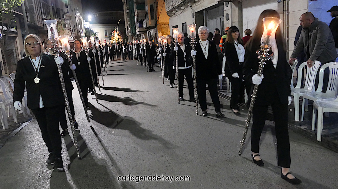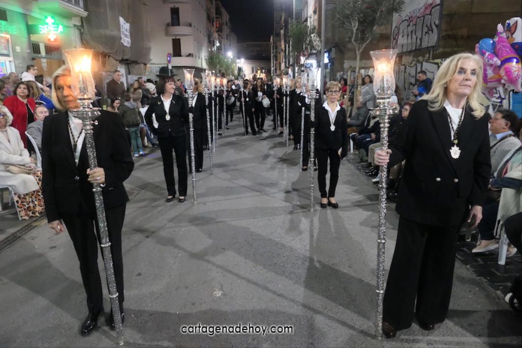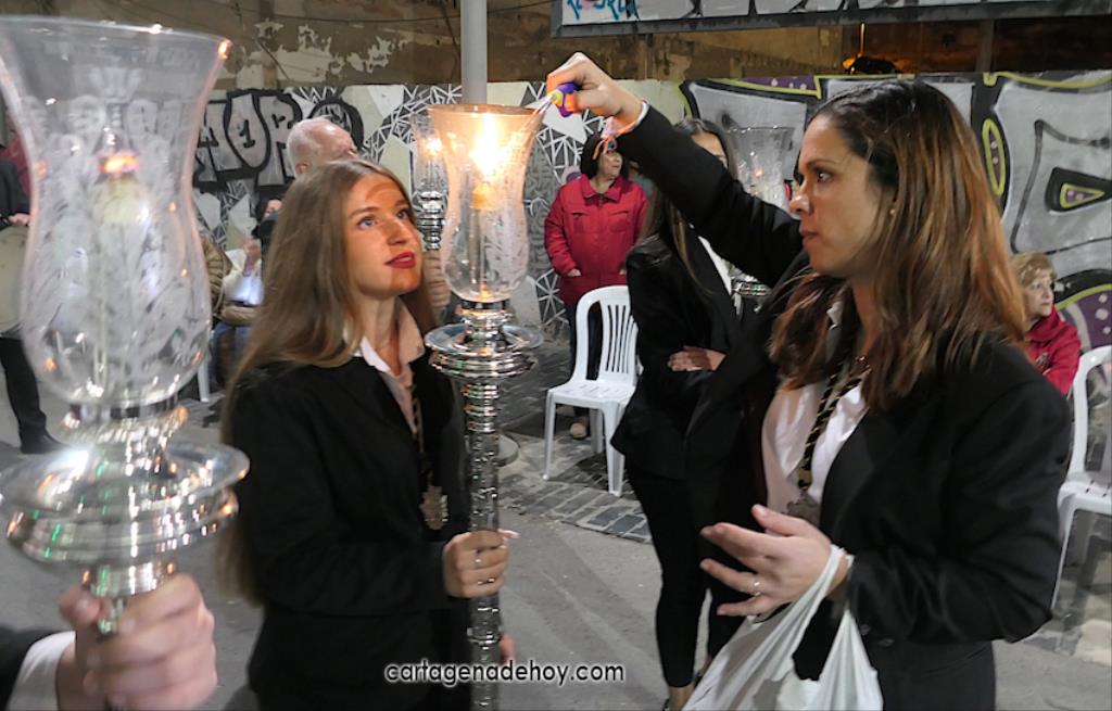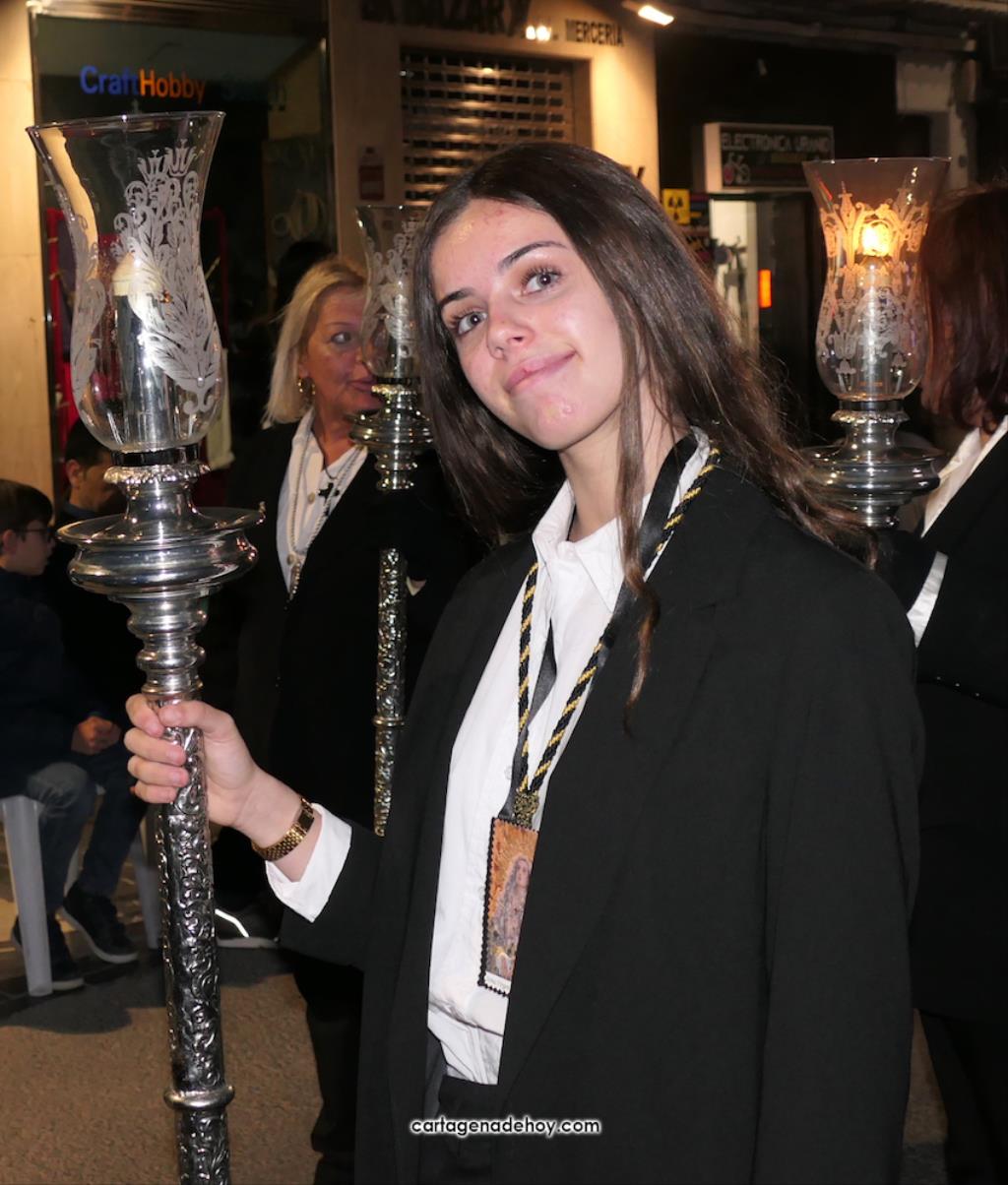 Las otras novedades han estado en el paso de San Juan, cuyos penitentes han lucido nuevos hachotes y se han estrenado guardabrisas encima de las tulipas del trono. También han sido novedad los escapularios de las damas portapasos de la Virgen.
