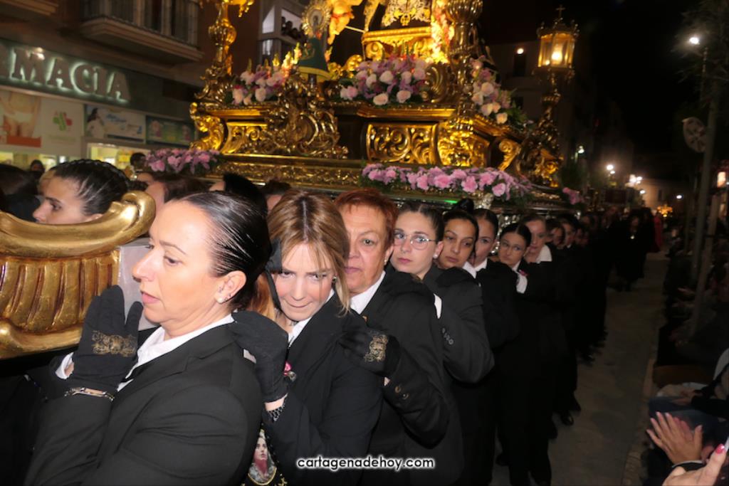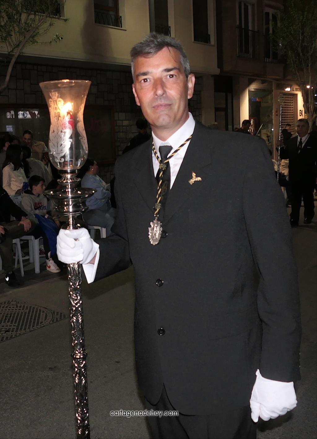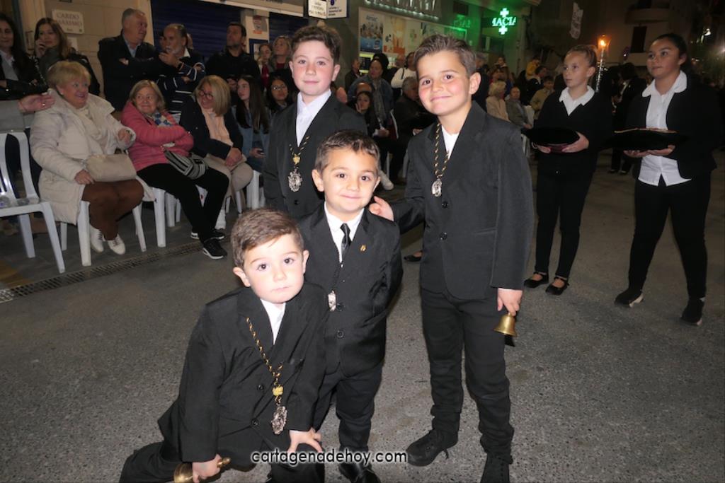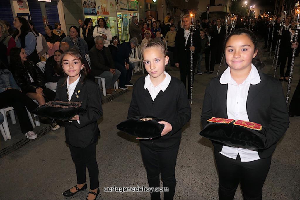 Las otras novedades han estado en el paso de San Juan, cuyos penitentes han lucido nuevos hachotes y se han estrenado guardabrisas encima de las tulipas del trono. También han sido novedad los escapularios de las damas portapasos de la Virgen.