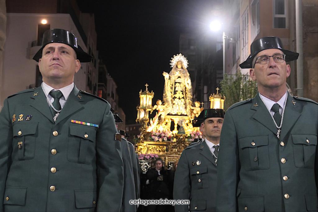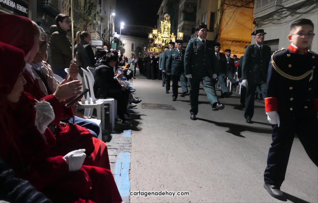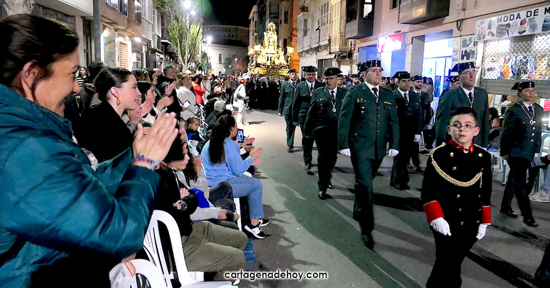 “¡Viva la Guardia Civil!” y aplausos del público han acompañado el paso del grupo de agentes de la Benemérita que ha formado parte del Vía Crucis del Cristo de la Divina Misericordia, sin duda, en señal de afecto hacia la labor del cuerpo después de que, por dos asuntos relacionados con el narcotráficos, hayan perdido la vida recientemente cuatro de sus efectivos en España.