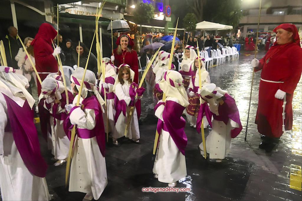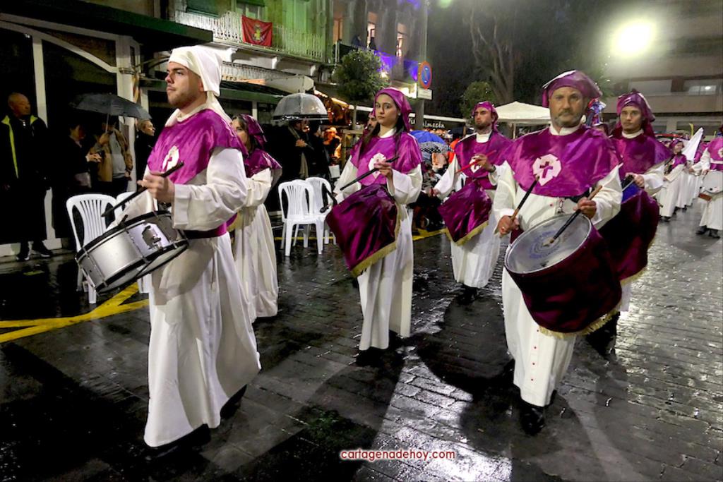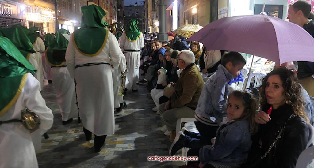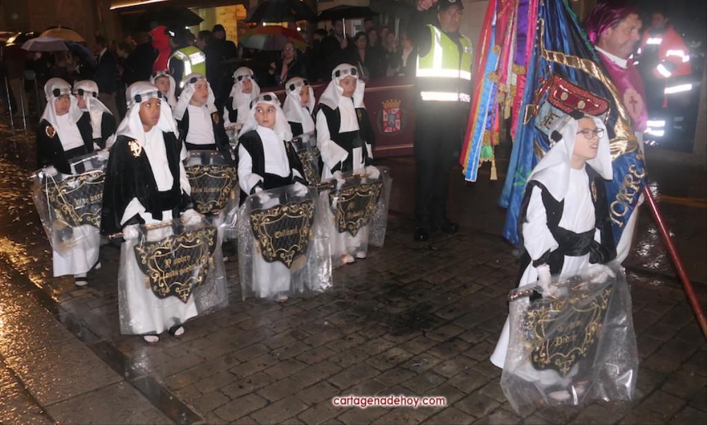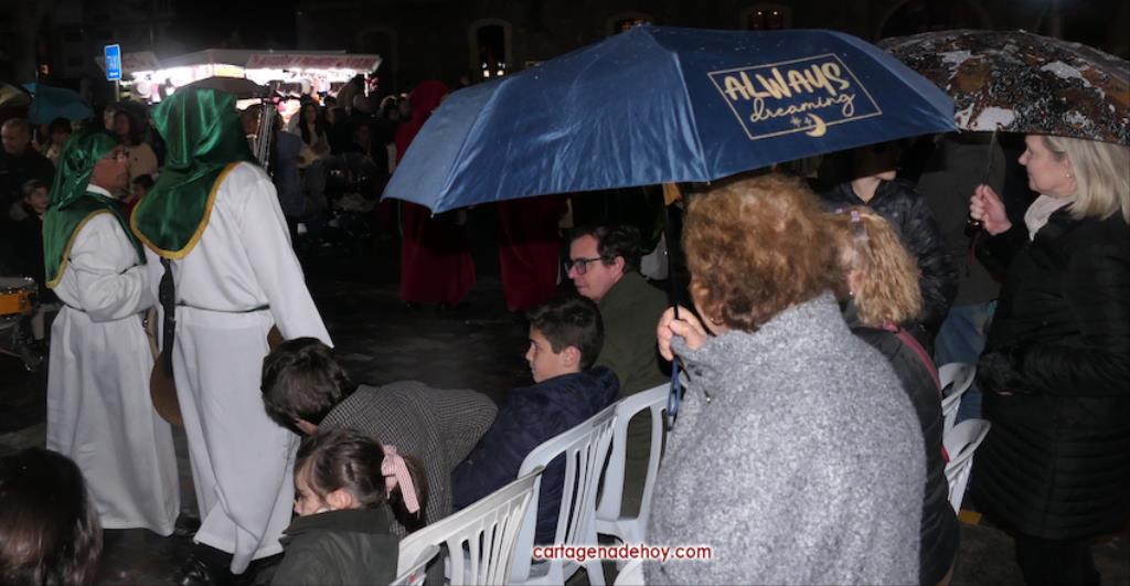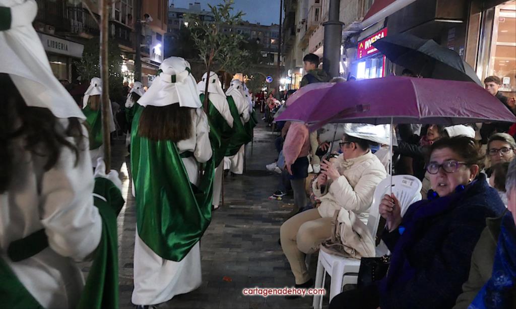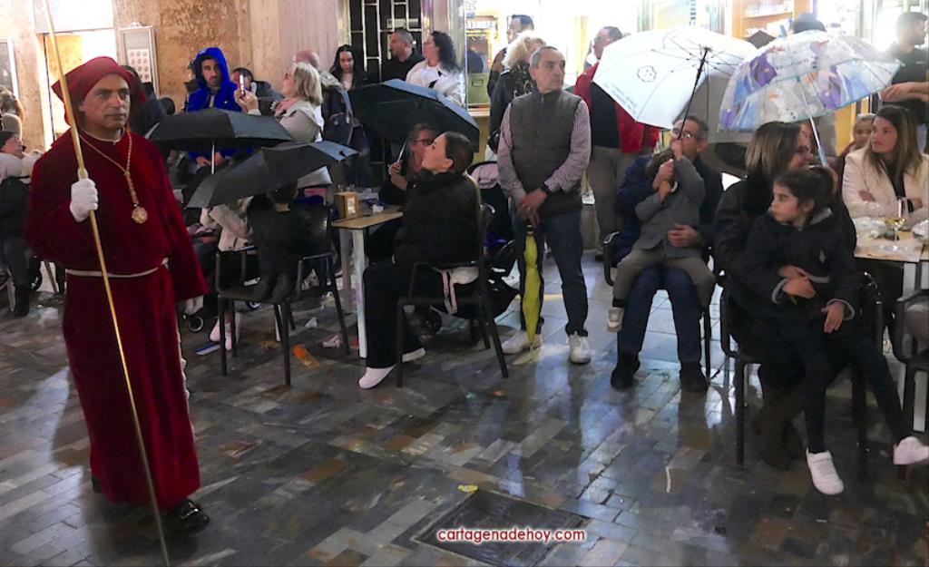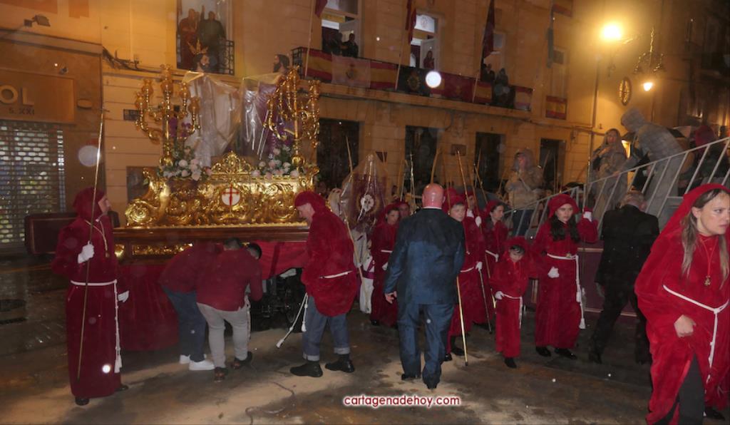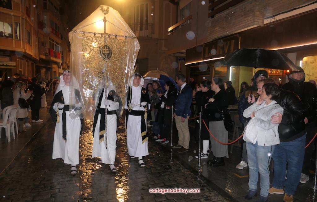 El caso es que entiendo que la procesión saliese. Es el desfile cartagenero menos castigado por la lluvia (lo explicamos en otro artículo del periódico), pero algún día tenía que acabar esa racha y ha venido a ser cuando la primavera acaba de entrar. Una pena, de verdad, pero también una experiencia para la formación de los jóvenes cofrades, quienes han demostrado su ADN pasionario manteniendo su rol y las indicaciones de sus responsables hasta en los momentos que caía más agua. Hay (mucha) madera procesionista en los visto esta tarde-noche.
