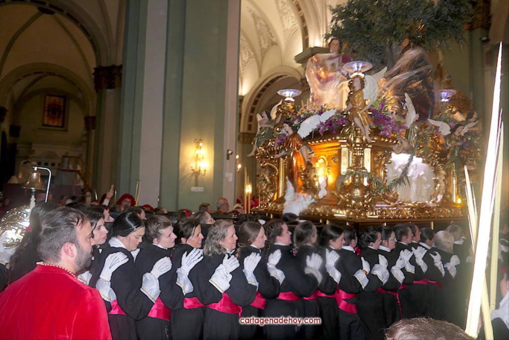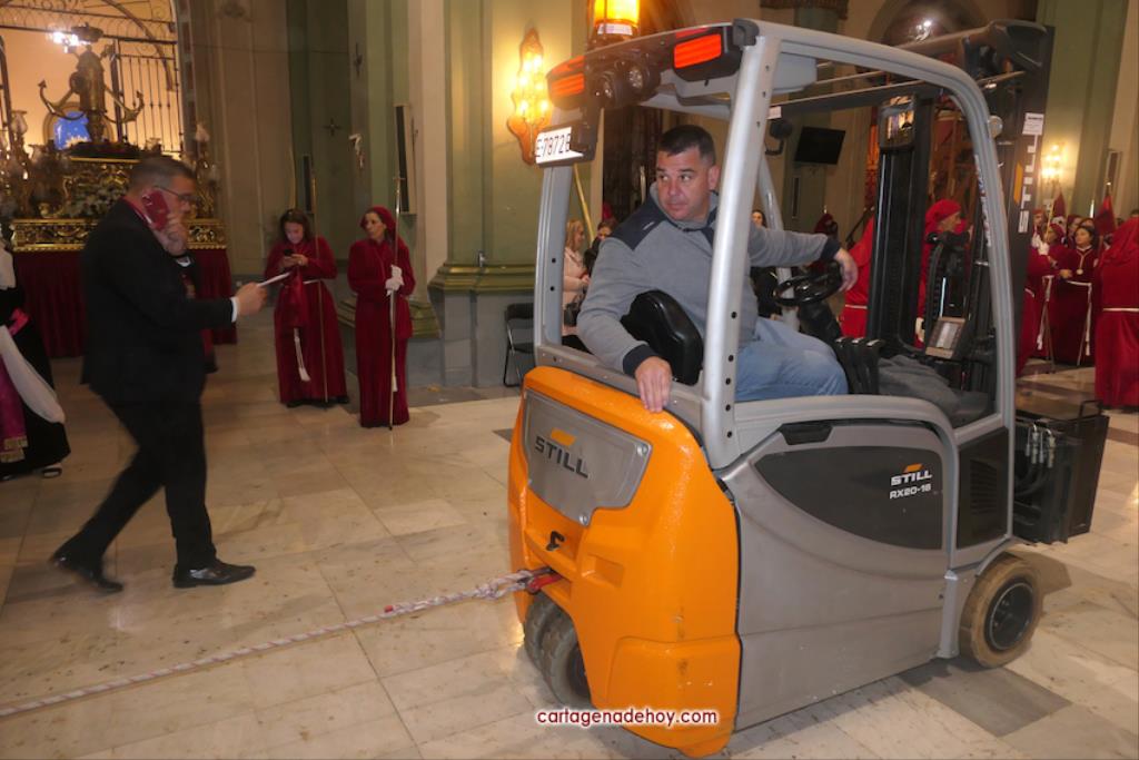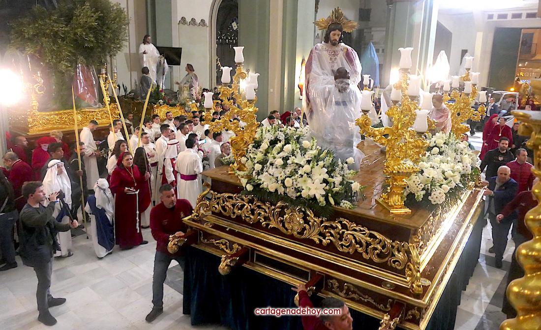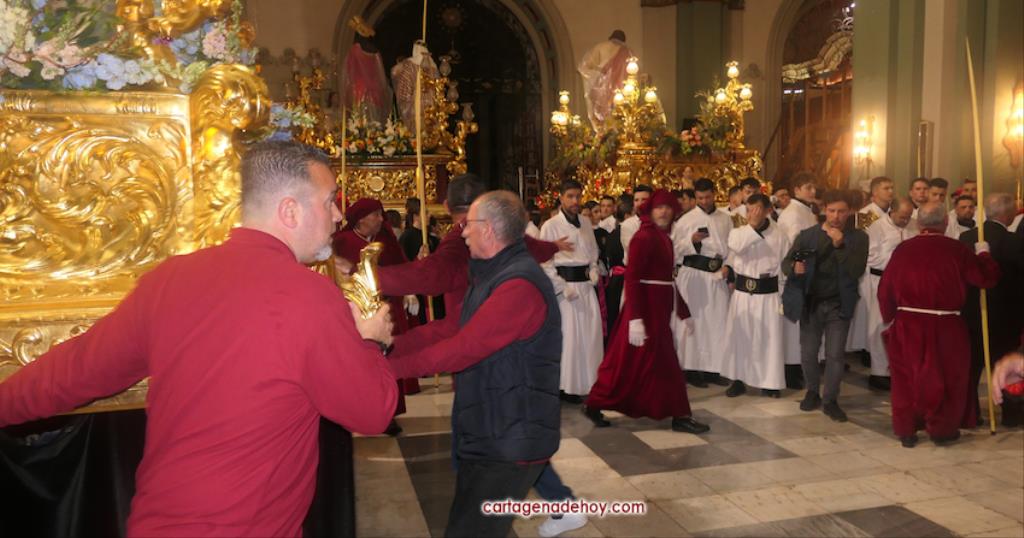 En media hora estaba la procesión recogida gracias al espectacular trabajo del equipo de iglesia y a que penitentes y portapasos no se han dejado llevar por ‘el pánico’ y ha obedecido de forma ejemplar las órdenes que iban recibiendo. Así, hemos podido contemplar como entraban sin pausa tronos y tercios dentro de la tensa situación y todo se iba efectuando de forma precisa y diligente, desde quien echaba serrín en la rampa para evitar resbalones, hasta los que participaban en la entrada de tronos a rueda atándolos a una carretilla, los que iban recogiendo palmas, ramas y estandarte, los que quitaban plásticos y secaban tallas, los que recogían los enseres de la procesión…
