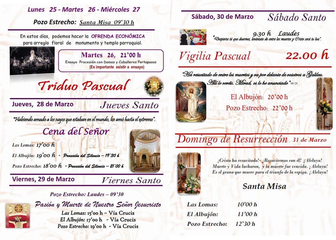 La elección del cartel de la Semana Santa de Pozo Estrecho 2024, convocado por la Hermandad de San Fulgencio, marcó el primer tramo de marzo en la población galilea, donde el día 15 tuvo lugar el concierto de marchas procesionales de la Sociedad Artístico Musical 'Santa Cecilia', para enseguida darse a conocer el programa de horarios de estas señaladas fechas, que incluye los oficios litúrgicos y tiene como principal acto en la calle la procesión del Jueves Santo.