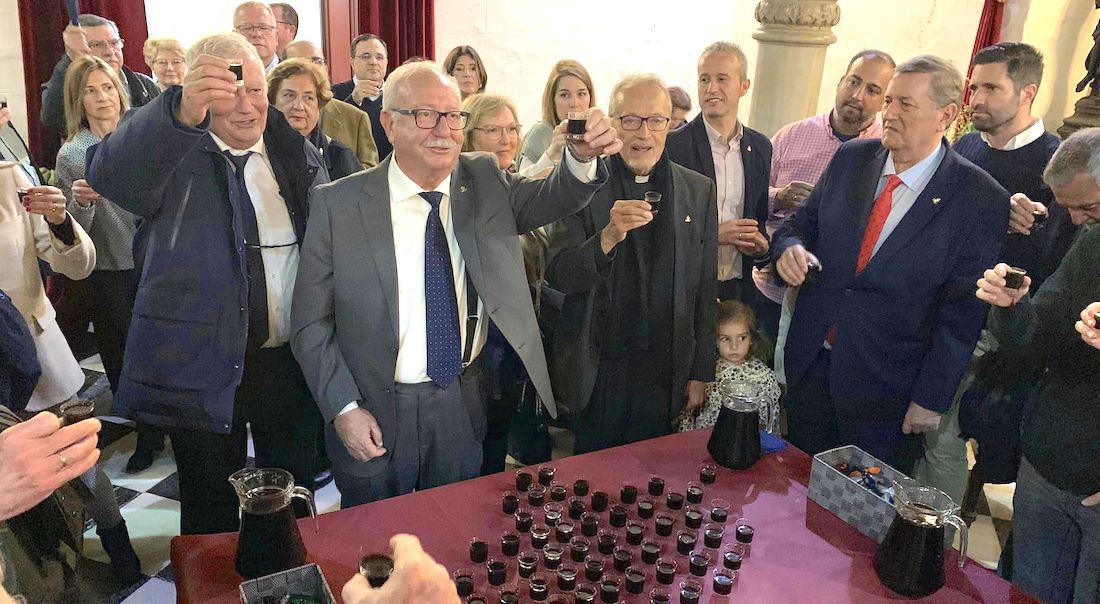 La Cofradía de Cristo en el Paso del Prendimiento celebró el 'Cabildo de los dátiles', que en esta ocasión tuvo como marco el Casino de Cartagena. El hermano mayor expresó que la cantera "es el mayor patrimonio que tenemos", informó de que la lluvia del Domingo de Ramos no ha causado daños en imágenes y enseres y anunció proyectos de futuro. En la foto, el tradicional brindis posterior con vino viejo.