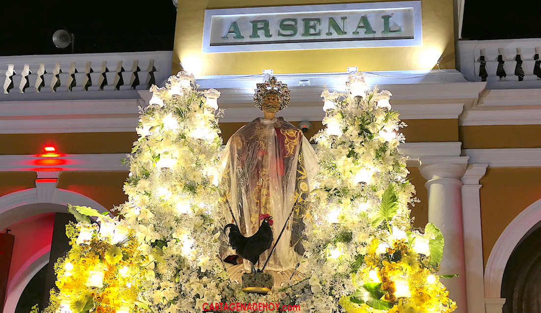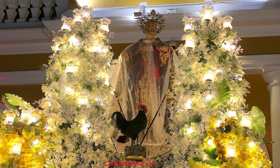 El trono de San Pedro portó a los pies del apóstol una ave negra que se estrenaba y que procede de tierras de Castilla-La Mancha. Su simbología está relacionada con las tres negaciones de Pedro que le vaticinó Jesús antes de que el gallo cantase dos veces, según recogen los evangelios del Nuevo Testamento.