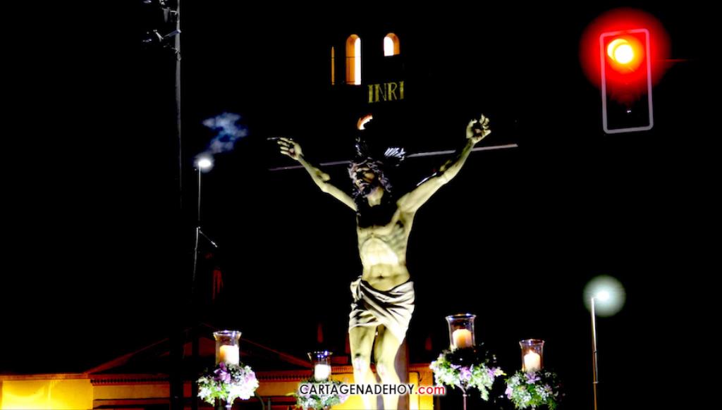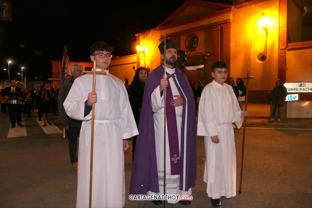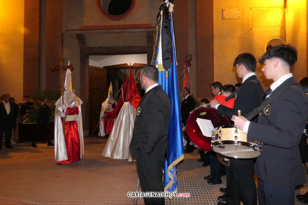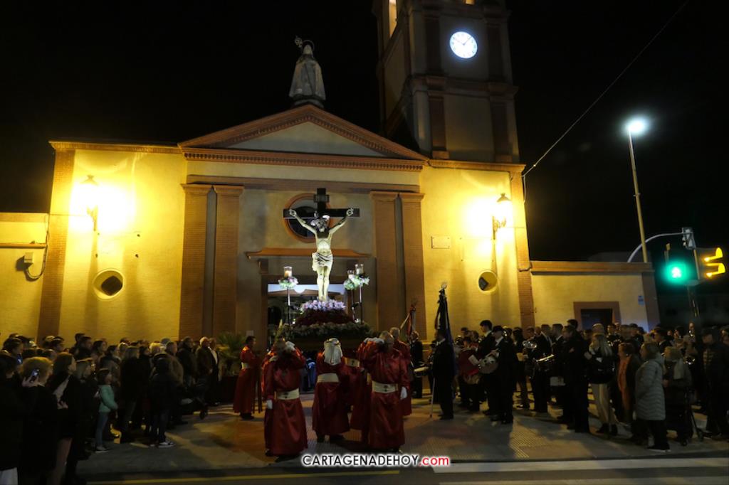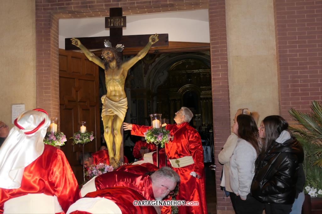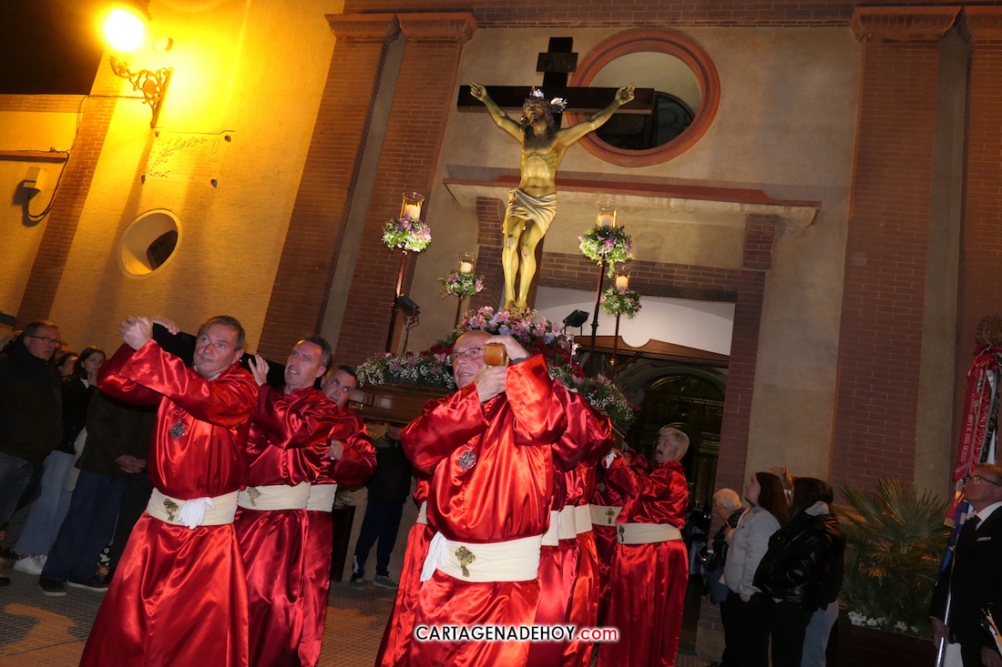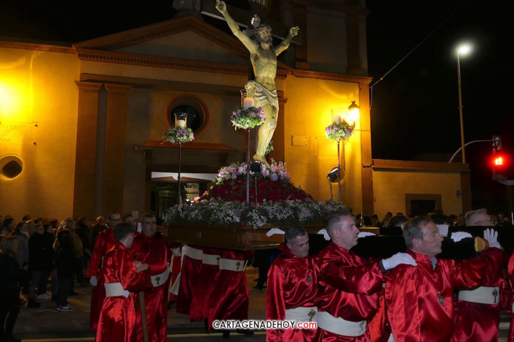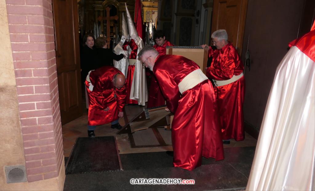 Se abre la puerta. Dentro ser obra a los tercios de penitentes preparados para salir, lo que hacen nada más colocarse las rampas en la entrada. La banda de Nuestra Señora del Pasico de Torre Pacheco comienza a sonar con golpe de tambor y empiezan a salir los cofrades. La procesión ya está en marcha con el estandarte y un cojín con el mazo en cabeza. Cuando aparece Cristo suena el himno de España y el público rompe en ovaciones para recibir a Cristo, que va sobre hombros masculinos.