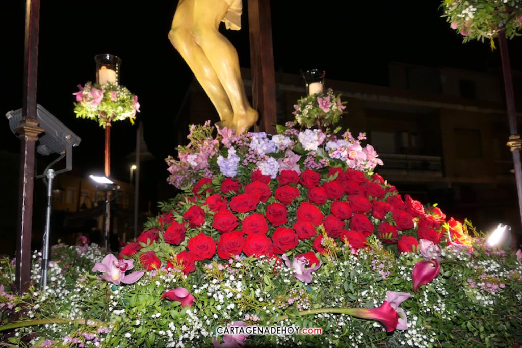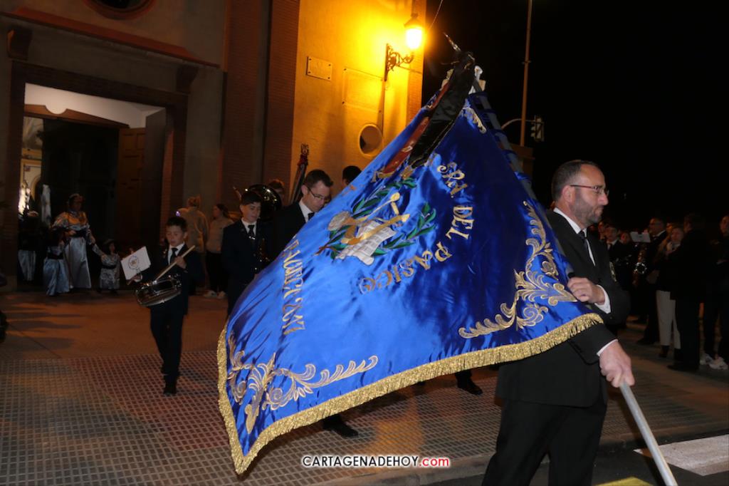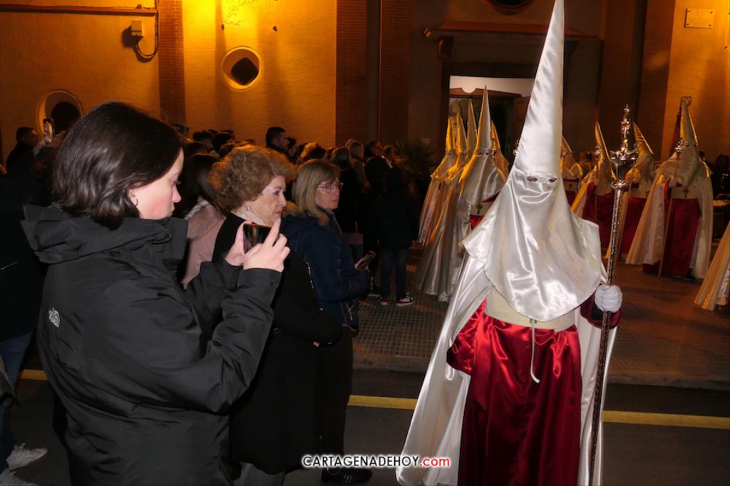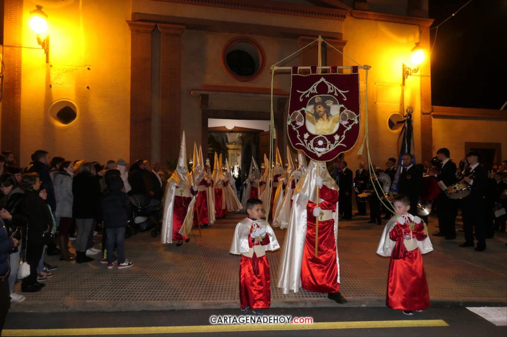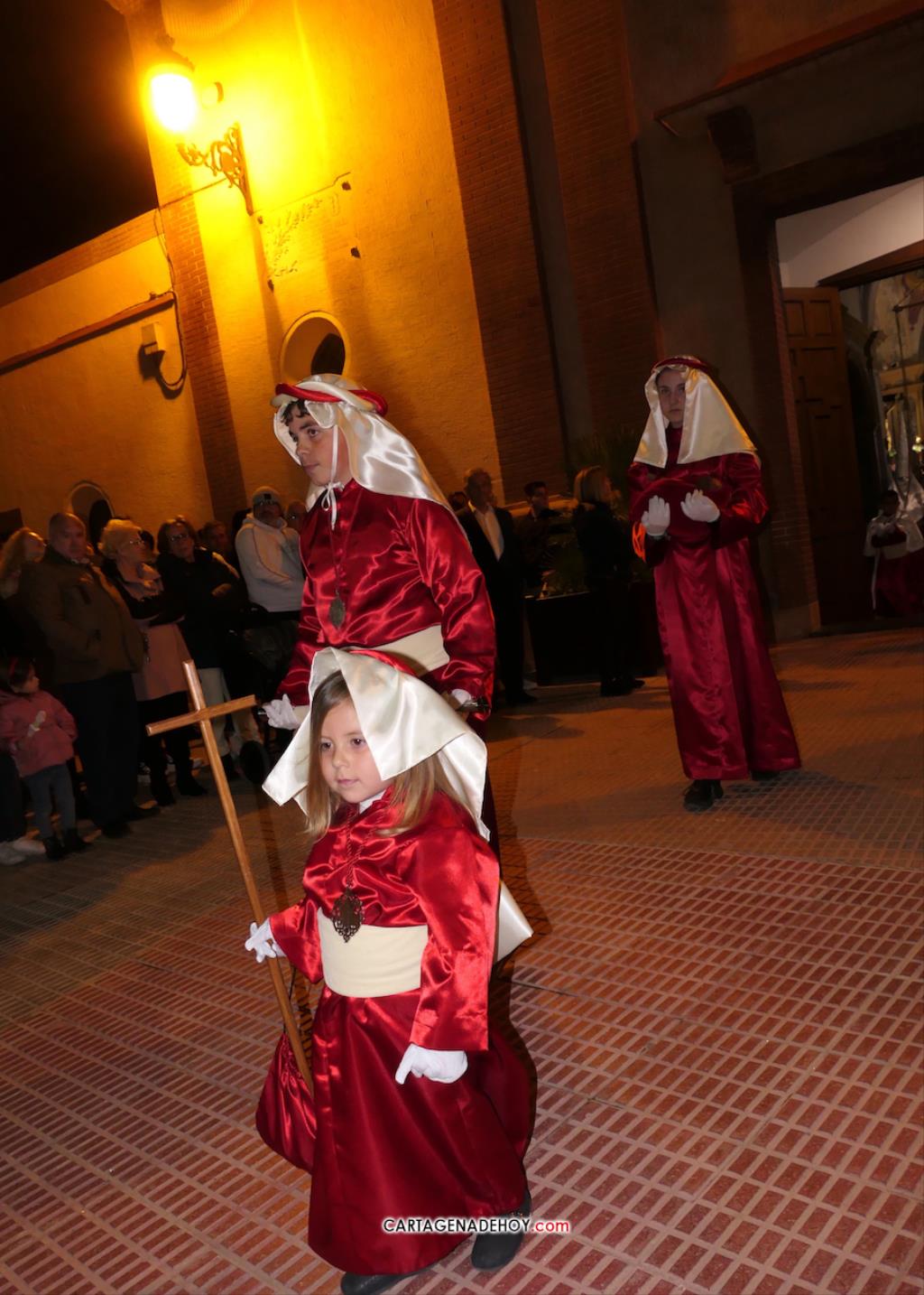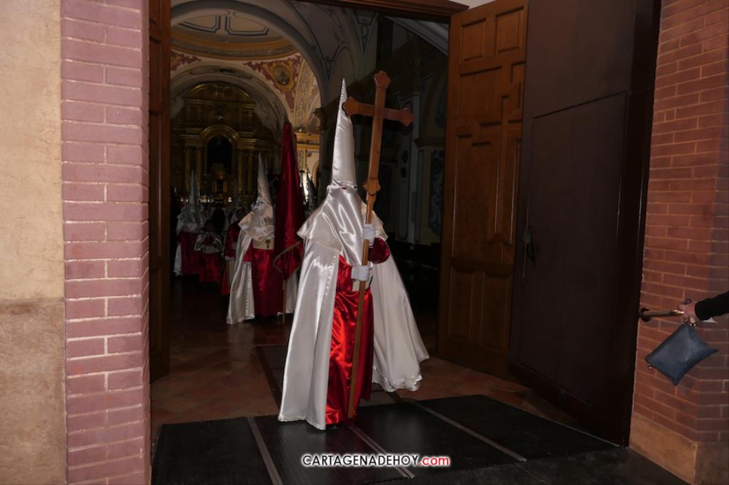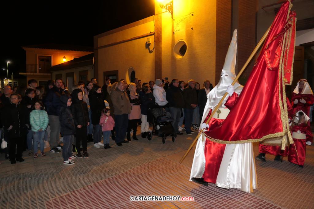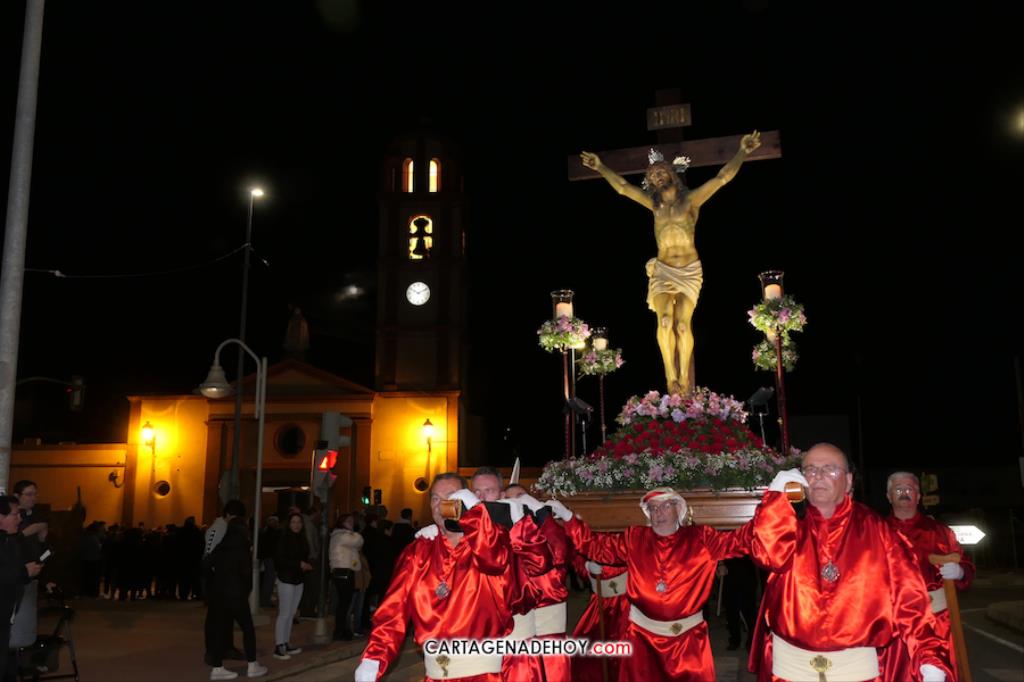 Se abre la puerta. Dentro ser obra a los tercios de penitentes preparados para salir, lo que hacen nada más colocarse las rampas en la entrada. La banda de Nuestra Señora del Pasico de Torre Pacheco comienza a sonar con golpe de tambor y empiezan a salir los cofrades. La procesión ya está en marcha con el estandarte y un cojín con el mazo en cabeza. Cuando aparece Cristo suena el himno de España y el público rompe en ovaciones para recibir a Cristo, que va sobre hombros masculinos.