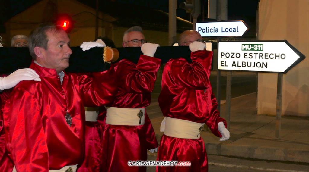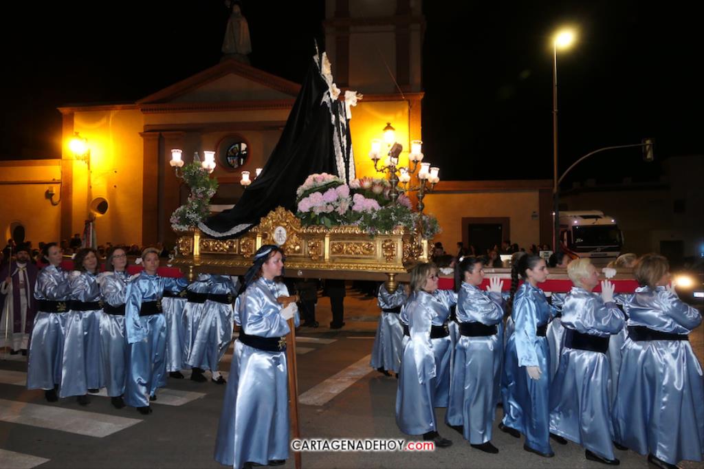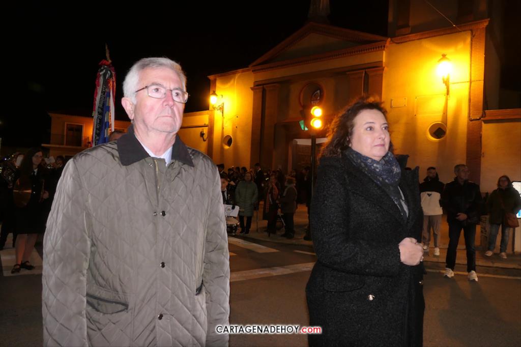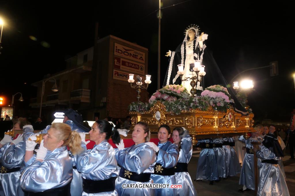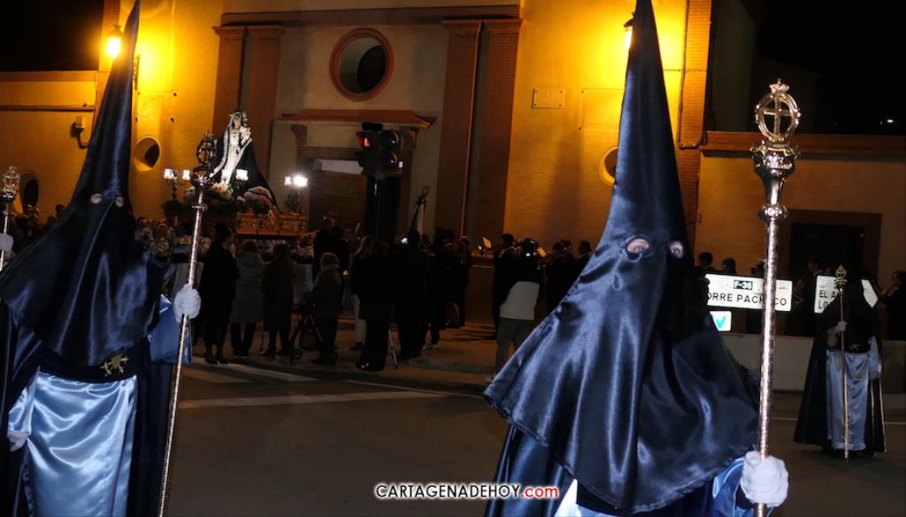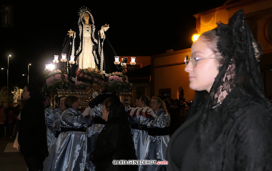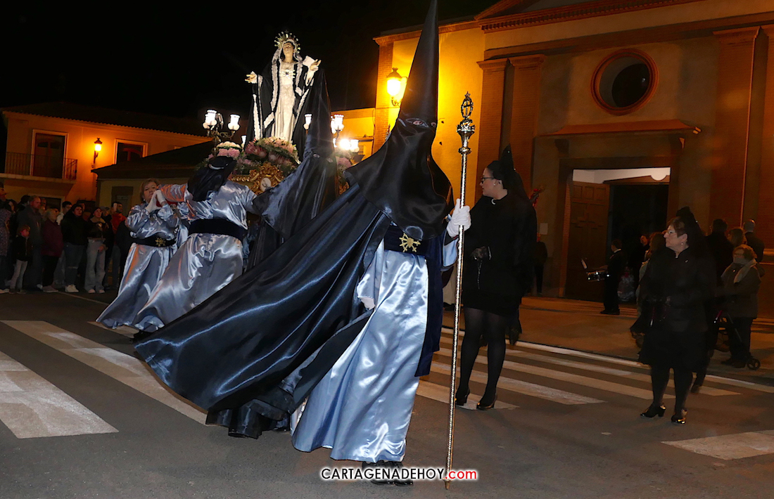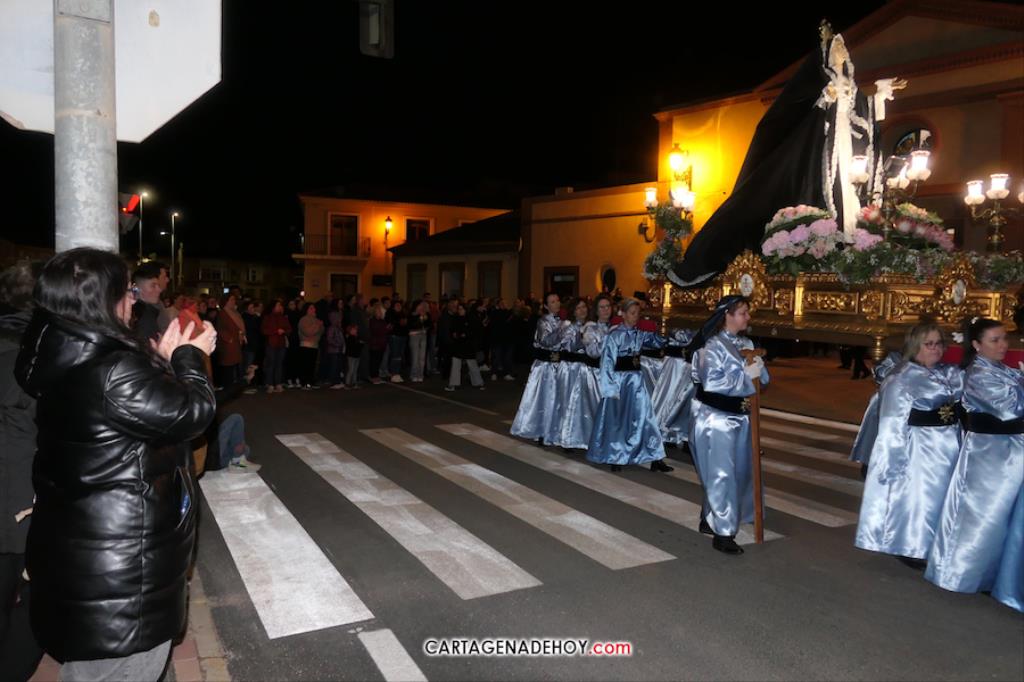 El cortejo repite el recorrido que fijó el pasado año, saliendo hacia la izquierda y tomando la calle Santa Florentina (RM-311). Enseguida sale la Dolorosa, esta vez llevada por costaleras. El viento incomoda a las penitentes al agitar capuces y túnicas, pero no altera su buen hacer. Detrás va el párroco, Daniel Díaz; los concejales Toñi Pérez y Enrique Pérez Abellán (MC) y la banda de música, que se ha dividido en dos partes, una entre los dos tronos y otra en cola.